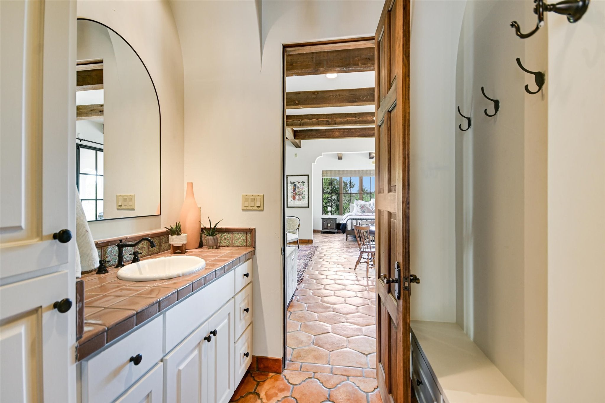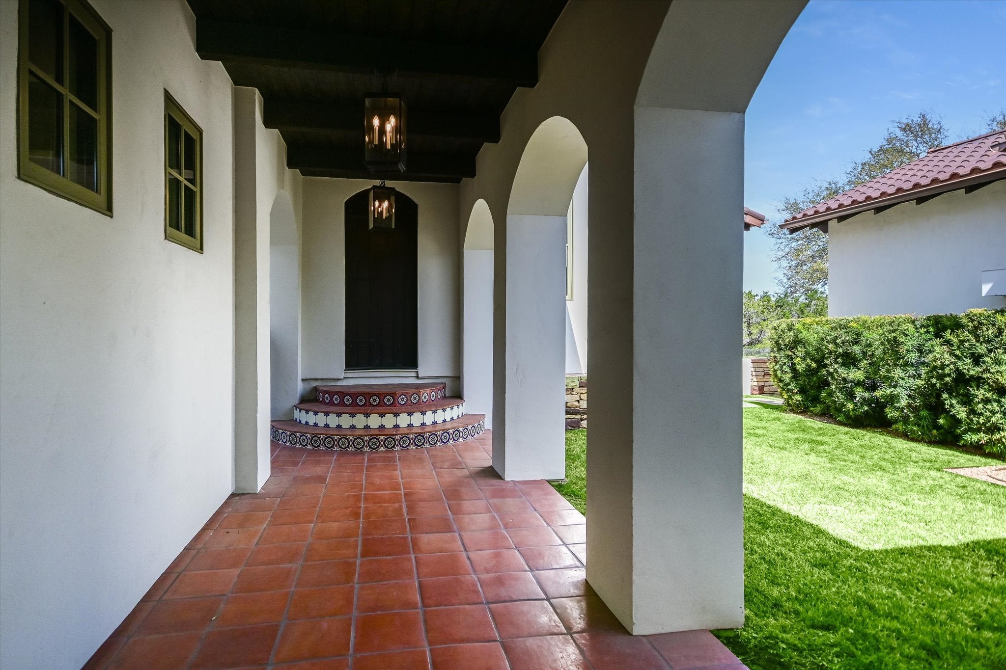 Set behind the guarded gates of Spanish Oaks, this mission revival estate unfolds as a private retreat—where timeless architecture, refined craftsmanship, & sweeping views converge on nearly an acre of serene landscape. Designed for effortless single-story living, the residence offers 5 bedrooms, 5.5 baths, 3-car garage, & a beautifully appointed 1 bedroom detached casita. A recently reimagined kitchen flows seamlessly into the great room, where a striking fireplace w/artisan detailing anchors the space. Steel-framed doors frame the surroundings, flooding the interiors w/light while introducing a sophisticated, modern edge. Overhead, wood beams add character, complemented by curated designer fixtures & statement lighting throughout. Arched passageways guide you from space to space, while a rich interplay of terracotta & hardwood flooring brings depth, texture, & a sense of timelessness. The primary suite is a sanctuary, offering tranquil views, a cozy fireplace, & a spa-inspired bath. A covered breezeway leads to the private casita (w/ kitchen & full bath) ideal for guests, extended stays, or multigenerational living. Additional spaces include an office, fitness room, & multiple living areas that adapt beautifully to both everyday living & entertaining. Outdoors expansive grounds open to unobstructed Hill Country vistas, creating a setting equally suited for lively gatherings or peaceful evenings under the stars. A pool, spa, fire pit, sport court, & gated front courtyard are all positioned to maximize both privacy & connection to the landscape. Life in Spanish Oaks offers more than just a home - it’s a lifestyle, with 24-hour guard-gated security, 18-Hole golf course, dining, a community pool &pavilion, stocked fishing ponds, scenic trails, & curated neighborhood events. Balancing seclusion with convenience, this exceptional property feels worlds away, yet remains just minutes from the Hill Country Galleria & under 30 minutes to downtown Austin & Austin airport.