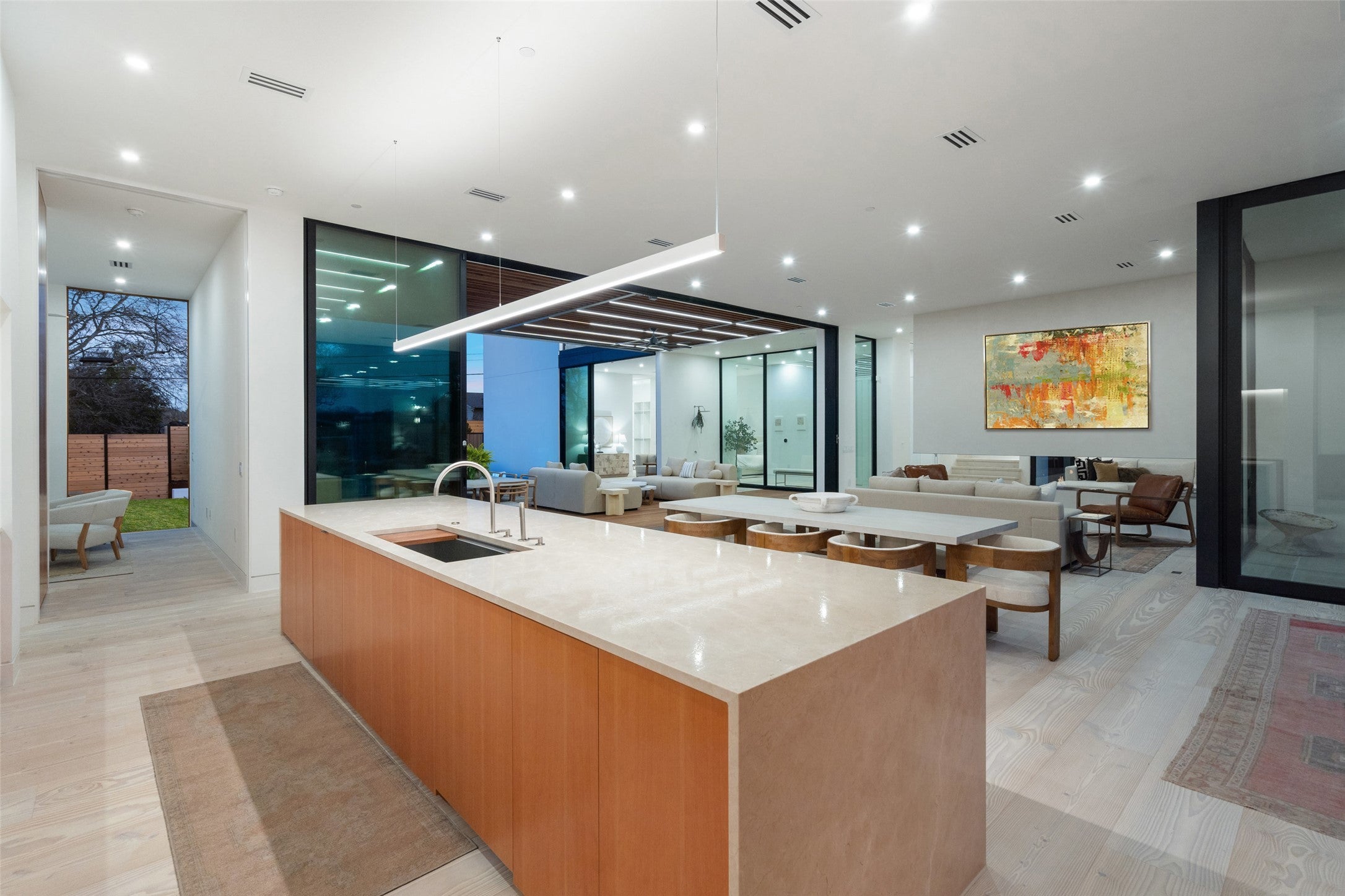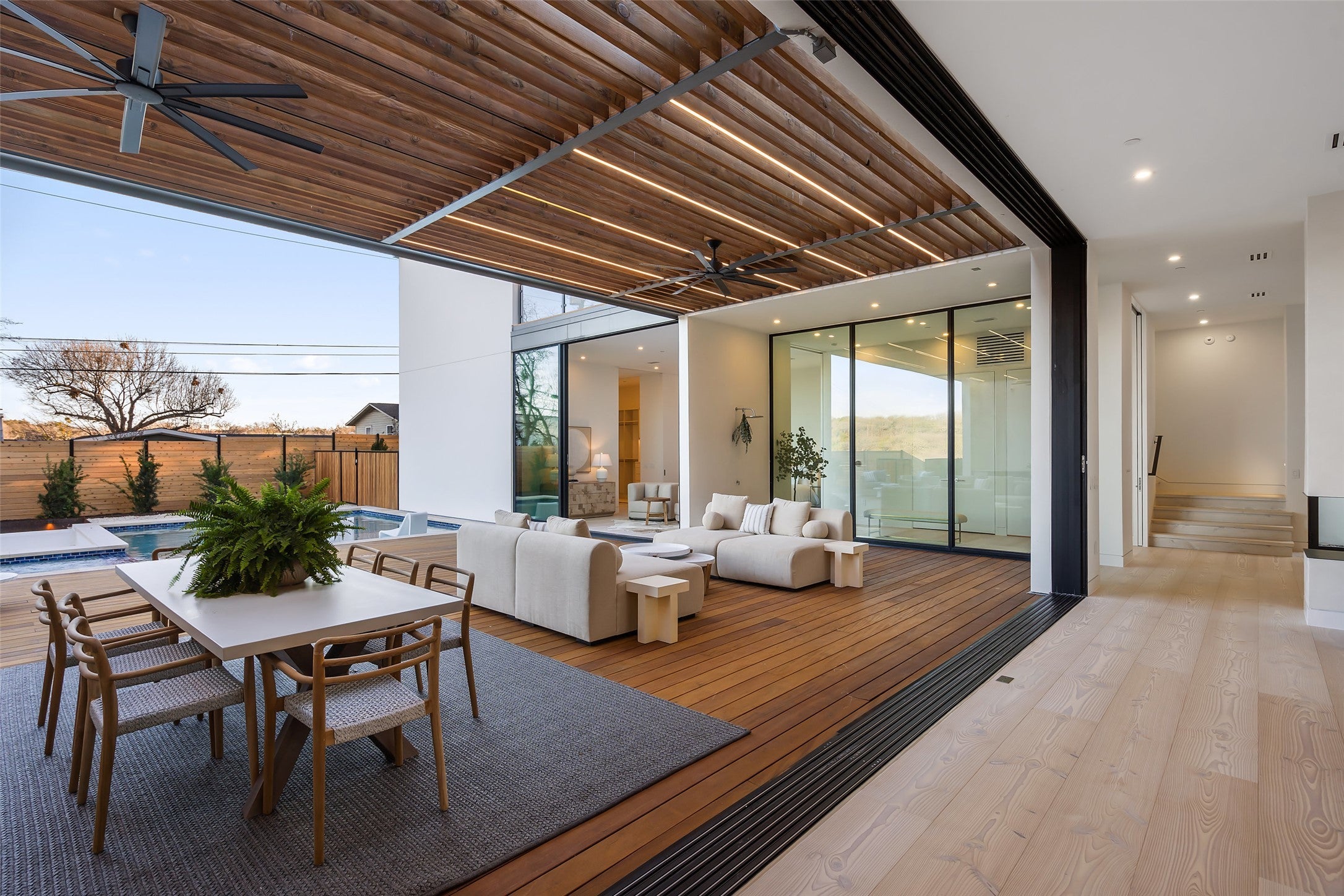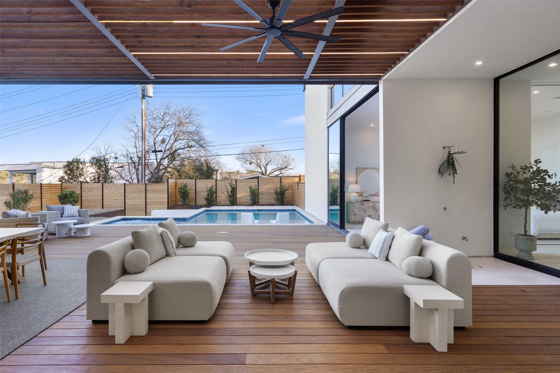 Welcome to 2605 Rockingham Drive, the pinnacle of opulent living in Austin’s prestigious Barton Hills. This architectural marvel, meticulously crafted by Convergent Real Estate Group, Black Rabbit Studio, and Blue Beige Designs, epitomizes luxury with its exquisite finishes, meticulous design, and unparalleled resort-style amenities. This newly built residence features five lavish bedrooms and 5.5 exquisitely appointed bathrooms, embodying the zenith of refinement and elegance. As you step inside, you are greeted by a grand open-concept layout that masterfully blends the living and dining spaces. Expansive floor-to-ceiling lanai doors open to an inviting pool deck and patio, seamlessly merging indoor and outdoor living. The gourmet kitchen, outfitted with cutting-edge Gaggenau appliances, a butler’s pantry, and a generously sized island, is perfect for both culinary creations and sophisticated entertaining. A double-sided modern fireplace delineates the living and lounge areas, providing multiple spaces for entertaining. The primary suite is a sanctuary of tranquility, featuring an indoor/outdoor shower and a luxurious soaking tub. Bathed in natural light, it includes dual walk-in closets, direct access to the pool and deck area, and a separate outdoor lounge area. Four additional bedrooms, located on the main and upper levels, offer ample space and access to a stunning second-floor terrace. Designed with entertaining in mind, the residence boasts a dedicated game and media room, a utility kitchen ideal for catering, and an outdoor fire pit lounge. The outdoor space is a masterpiece, featuring a beach-entry pool with built-in seating, a heated spa, an outdoor kitchen, and a covered patio. Conveniently located near award-winning restaurants, local music venues, Zilker Park, Barton Springs, and Austin International Airport, this home embodies the essence of contemporary luxury and sophistication.