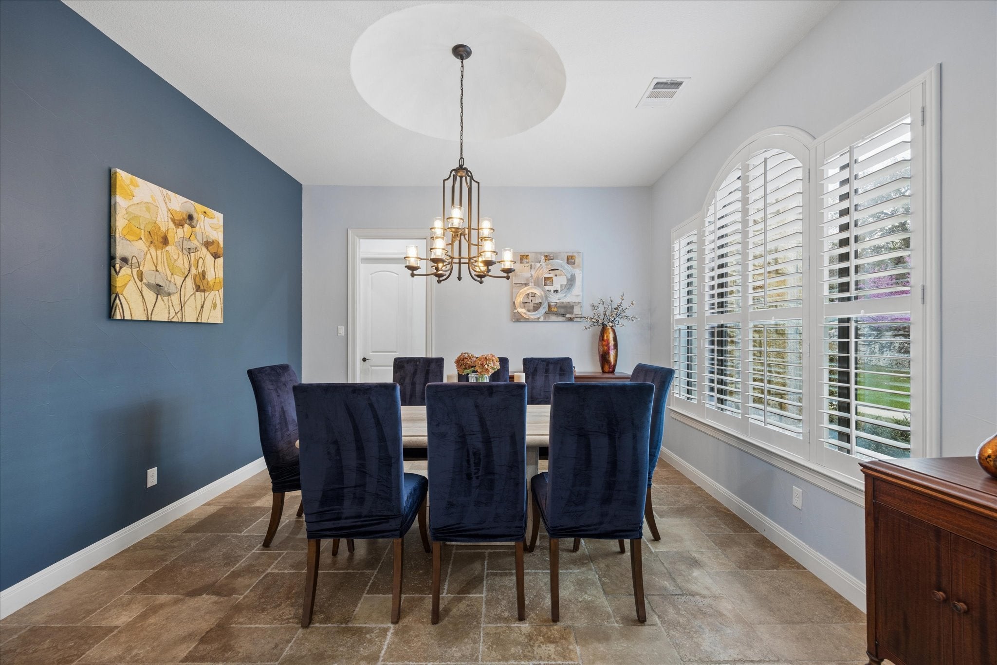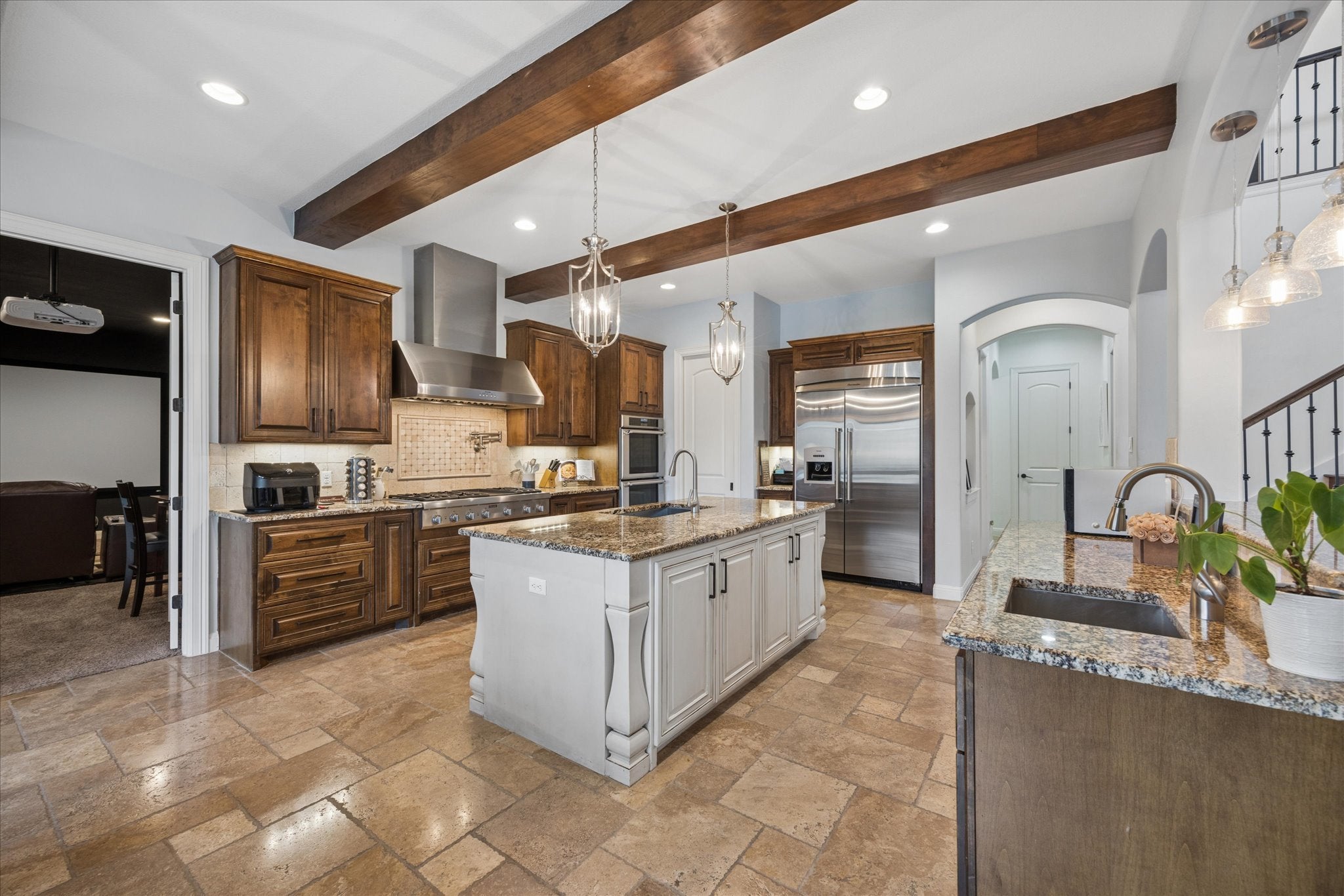 Tucked at the end of a private cul-de-sac on High Lonesome, this Hill Country home is located within the gated Grand Mesa section of Crystal Falls. With no neighbors to the left or behind, the property backs to the 18th fairway and overlooks a treed hillside. Homestead exemption in place. Enter through large custom Durango Door into open living space with dramatic ceilings, setting the tone right away. The main level includes primary bedroom, two dining areas, a dedicated office, and a cinema-style media room. The kitchen features crafted high beams, hilltop views, Thermador appliances including a 48-inch professional rangetop, double ovens, and a built-in refrigerator. The granite island anchors the space, while the breakfast counter overlooks the living area and opening seamlessly to the peaceful outdoor space. Outdoor living is exceptional with an expansive covered patio, double ceiling fans, an outdoor kitchen with two Big Green Eggs. The saltwater pool and spa feature stone decking and gorgeous mature landscaping capturing the natural elements of the Hill Country. Upstairs offers a game room with views, a loft for flexible living, one ensuite bedroom, two additional bedrooms with a Jack and Jill bath, and a large closet off the game room providing access to a walk-in, air-conditioned attic for storage or a workout space. Recent updates include a new roof, new gutters, Elfa closet systems, and fresh interior and exterior paint. Additional features include foam insulation, tankless water heaters, epoxy garage flooring, lightning rods, and secondary stackable washer and dryer connections. Community amenities include Crystal Falls Golf Club, tennis courts, two resort-style pools, parks, and highly regarded Leander ISD schools.