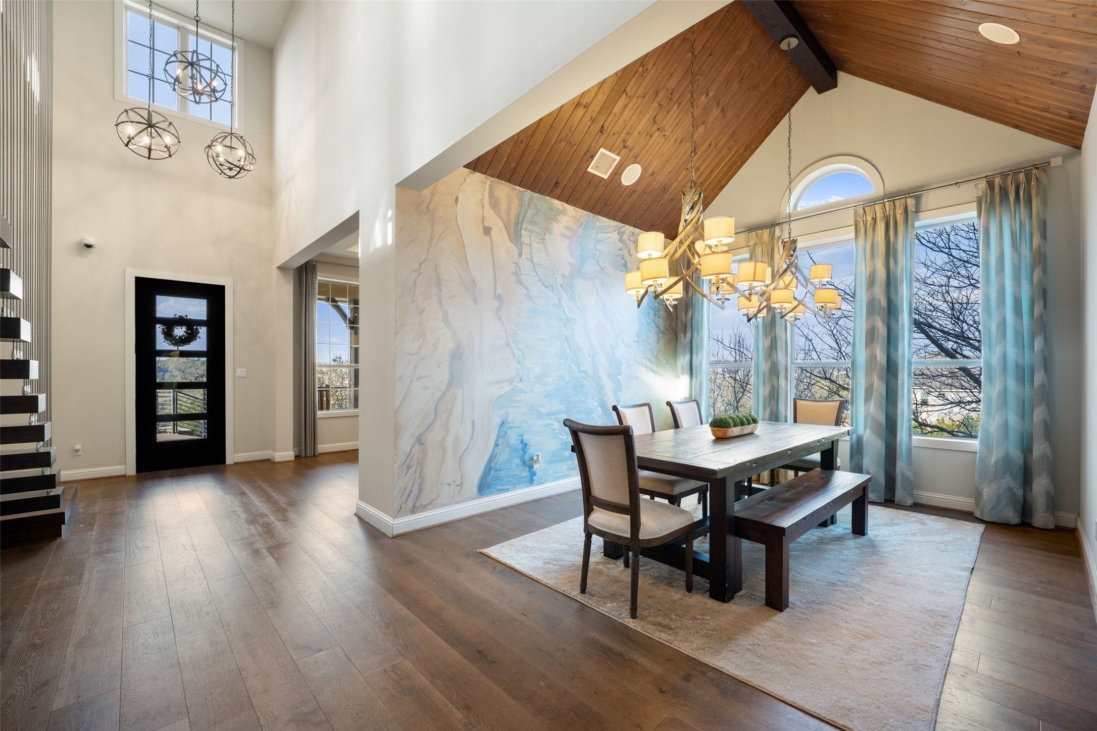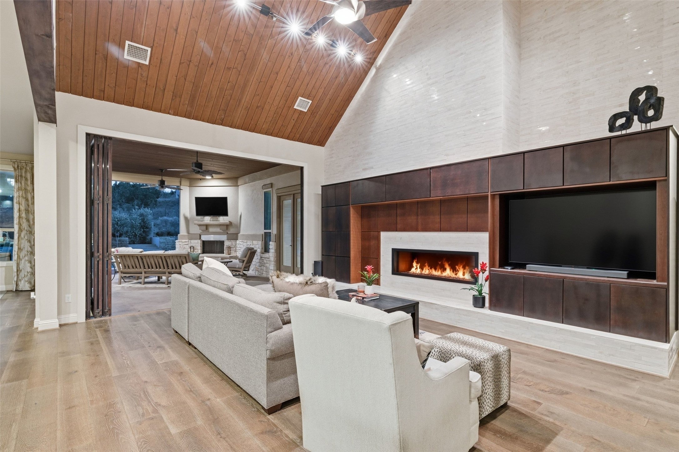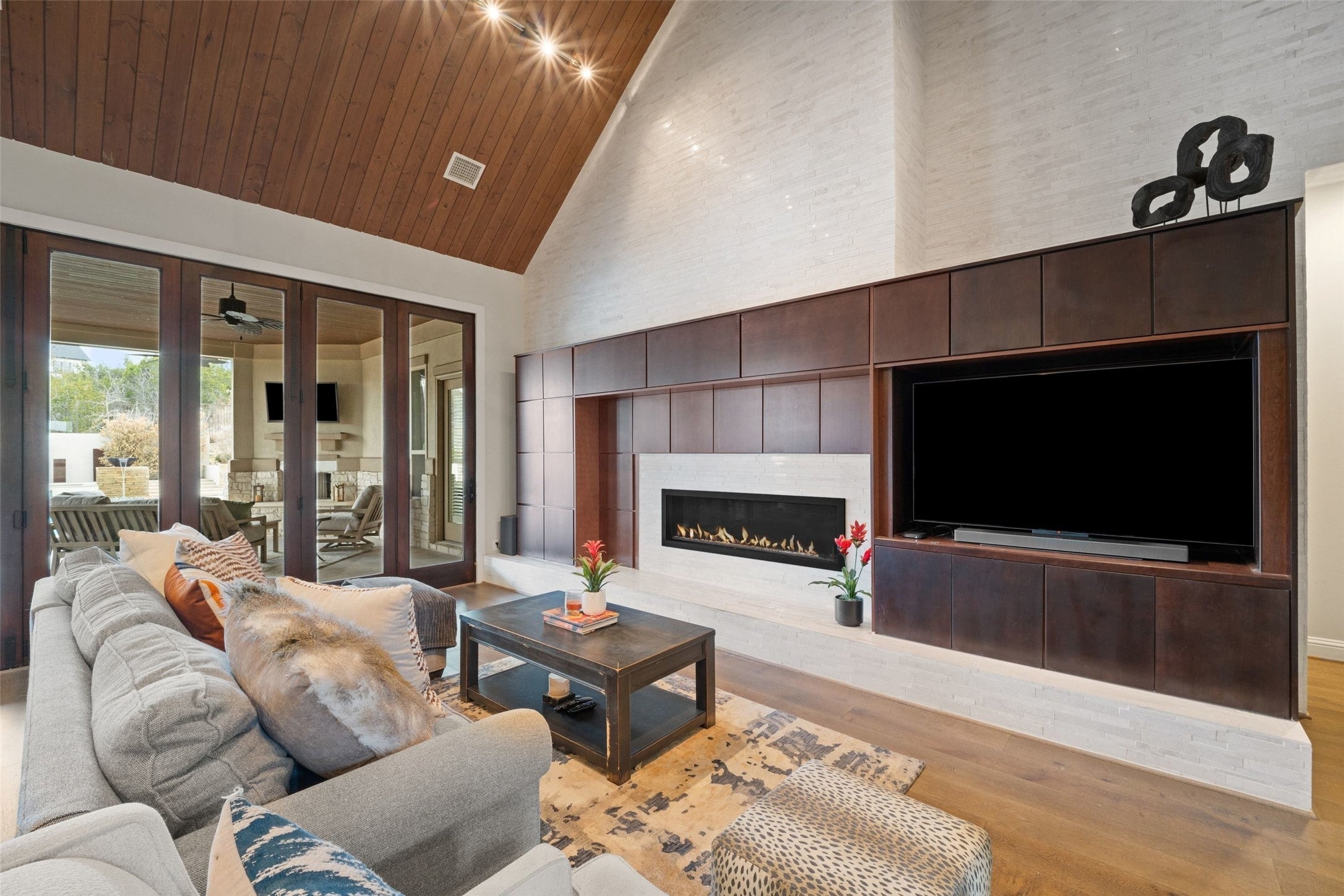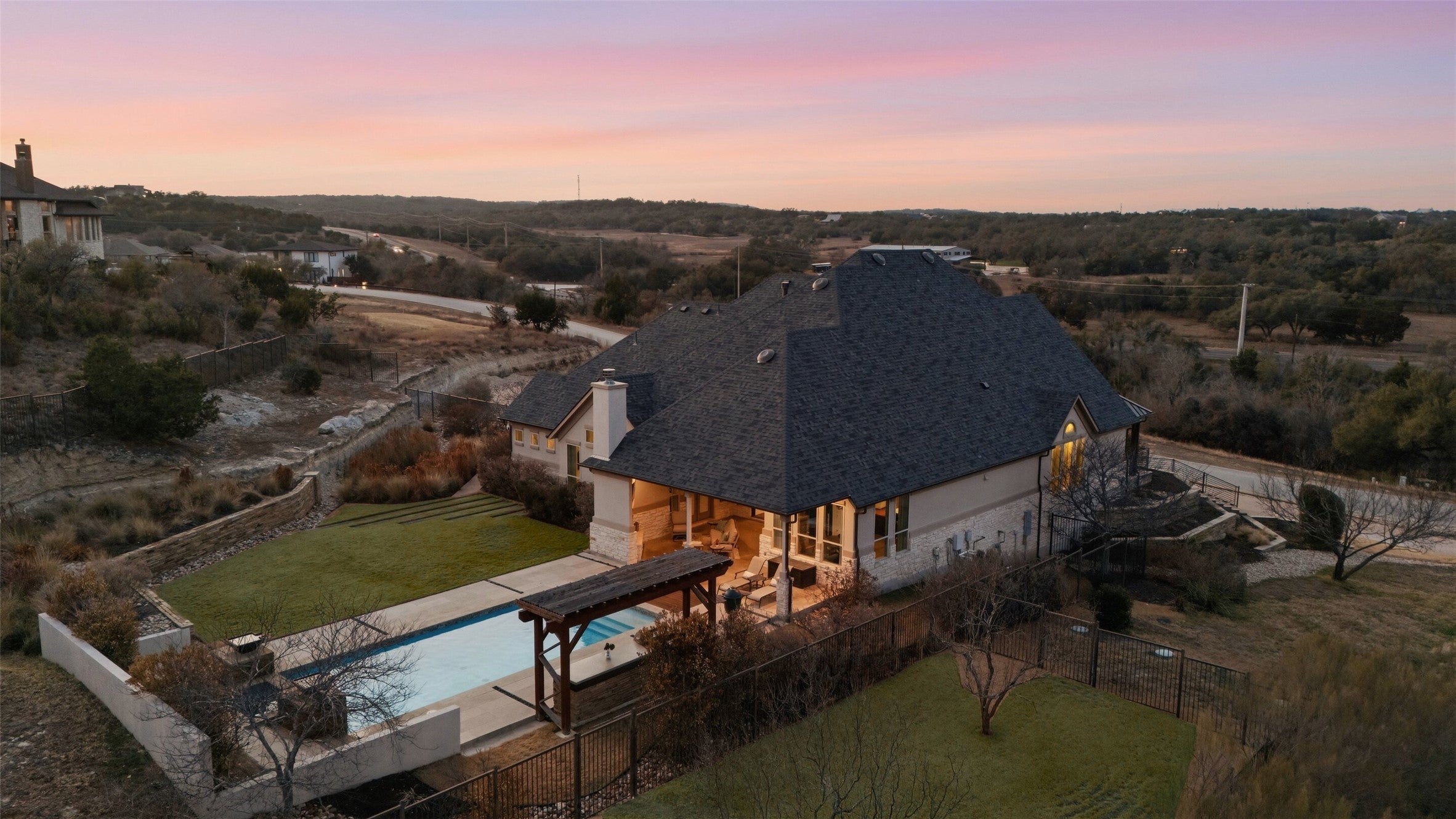 Perched on a hilltop within Lake Travis ISD, this warm contemporary home, once the model home, combines thoughtful design, privacy, and peaceful views on an oversized 2 acre homesite. Only 7–8 minutes to the Hill Country Galleria, 30 minutes to Downtown Austin, and 20 minutes to Dripping Springs' charming city center. A sweeping circular drive creates a memorable arrival while positioning the home to take full advantage of the surrounding landscape and night skies, all while benefiting from a low tax rate and low HOA fees rarely found in properties offering this level of space and setting. The grand entry opens to vaulted ceilings and an expansive great room centered around a large island kitchen designed for gathering and entertaining. Expansive accordian-style doors create a seamless transition to covered outdoor living, where a fireplace, pool, and outdoor grilling area extend the living space for year-round enjoyment. Architectural details throughout include floating stairs, illuminated decorative onyx slabs, and numerous custom design elements, adding warmth and sophistication. The primary suite with spa bath and all 3 secondary bedrooms are located on the main level, creating an easy and functional everyday flow. A standout feature is the attached guest retreat with its own private entrance, kitchenette, and full bath, offering ideal flexibility for guests, multigenerational living, or private workspace needs. Upstairs, a spacious game room with wet bar, dedicated media room, and powder bath provide a separate entertainment space. Fully fenced with generous yard space, dog run, and room to enjoy the Hill Country setting, this property offers a rare balance of space, privacy, and convenience—just minutes from Bee Cave and the Hill Country Galleria’s shopping, dining, and entertainment, as well as the natural beauty of Hamilton Pool and Reimers Ranch Park along the Pedernales River.