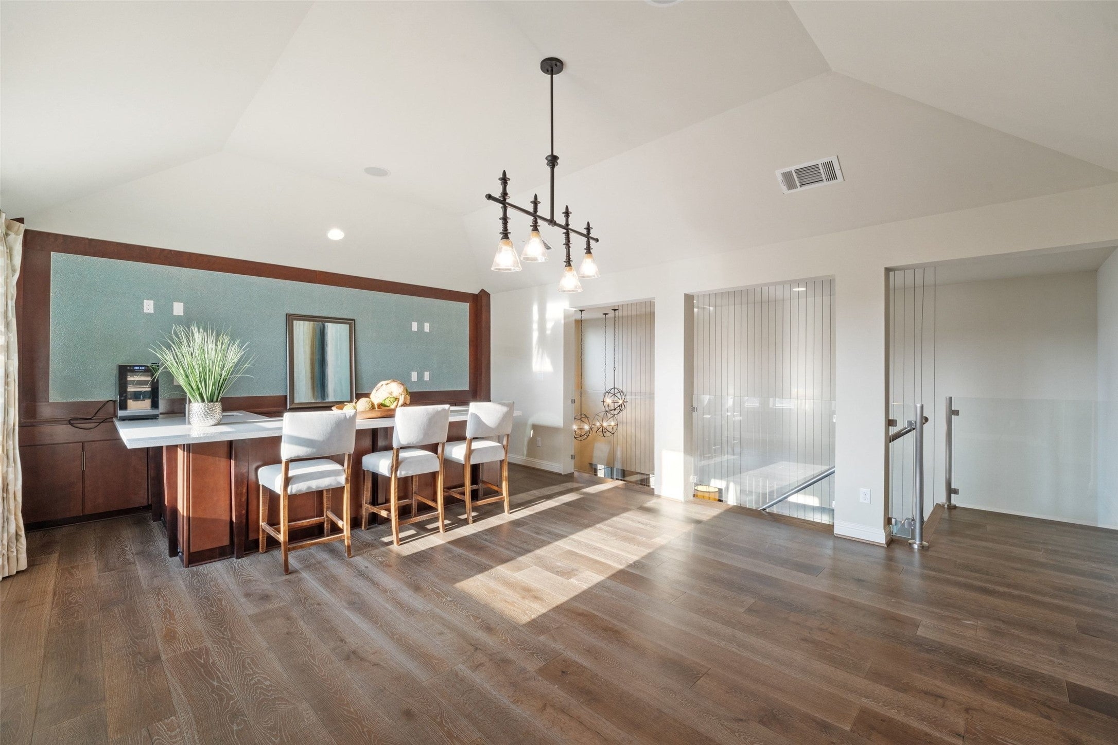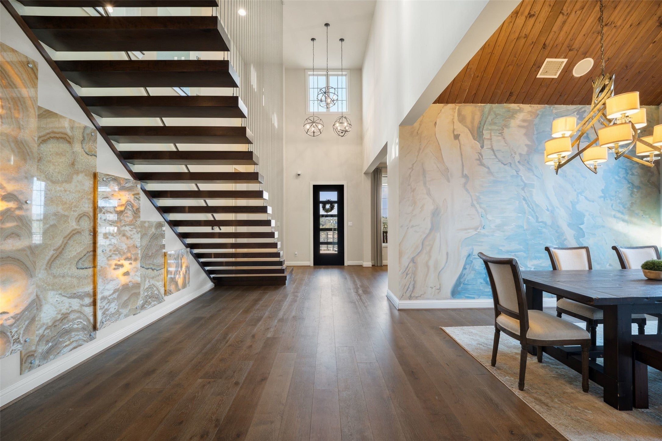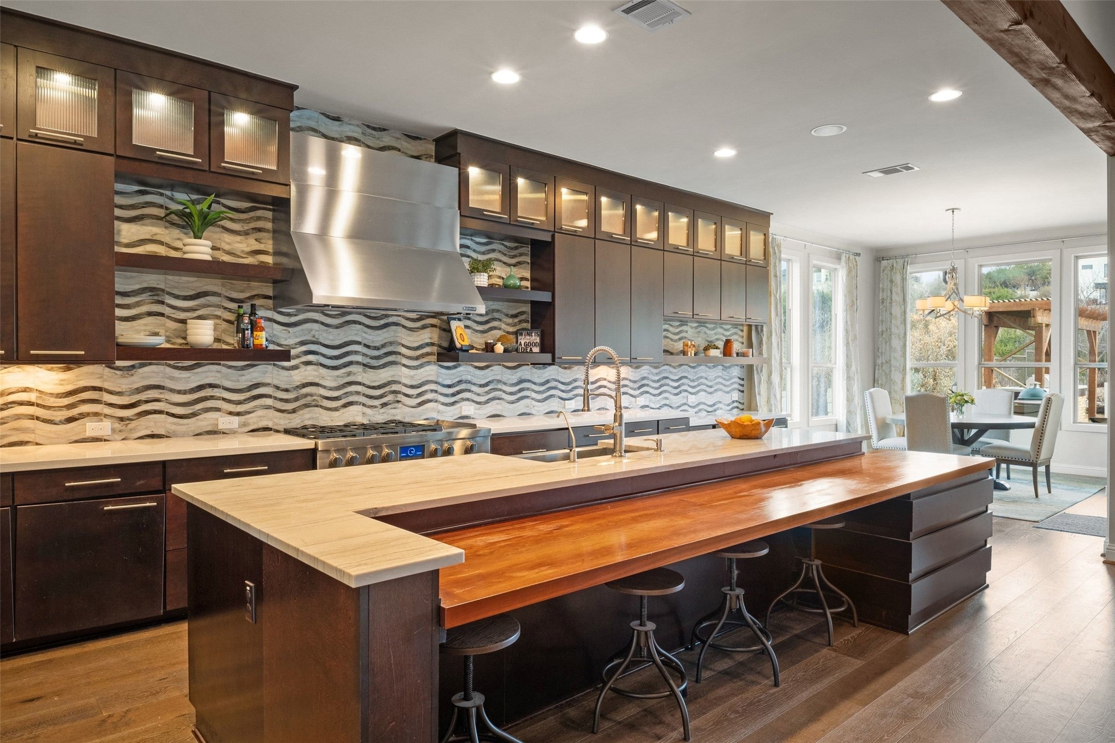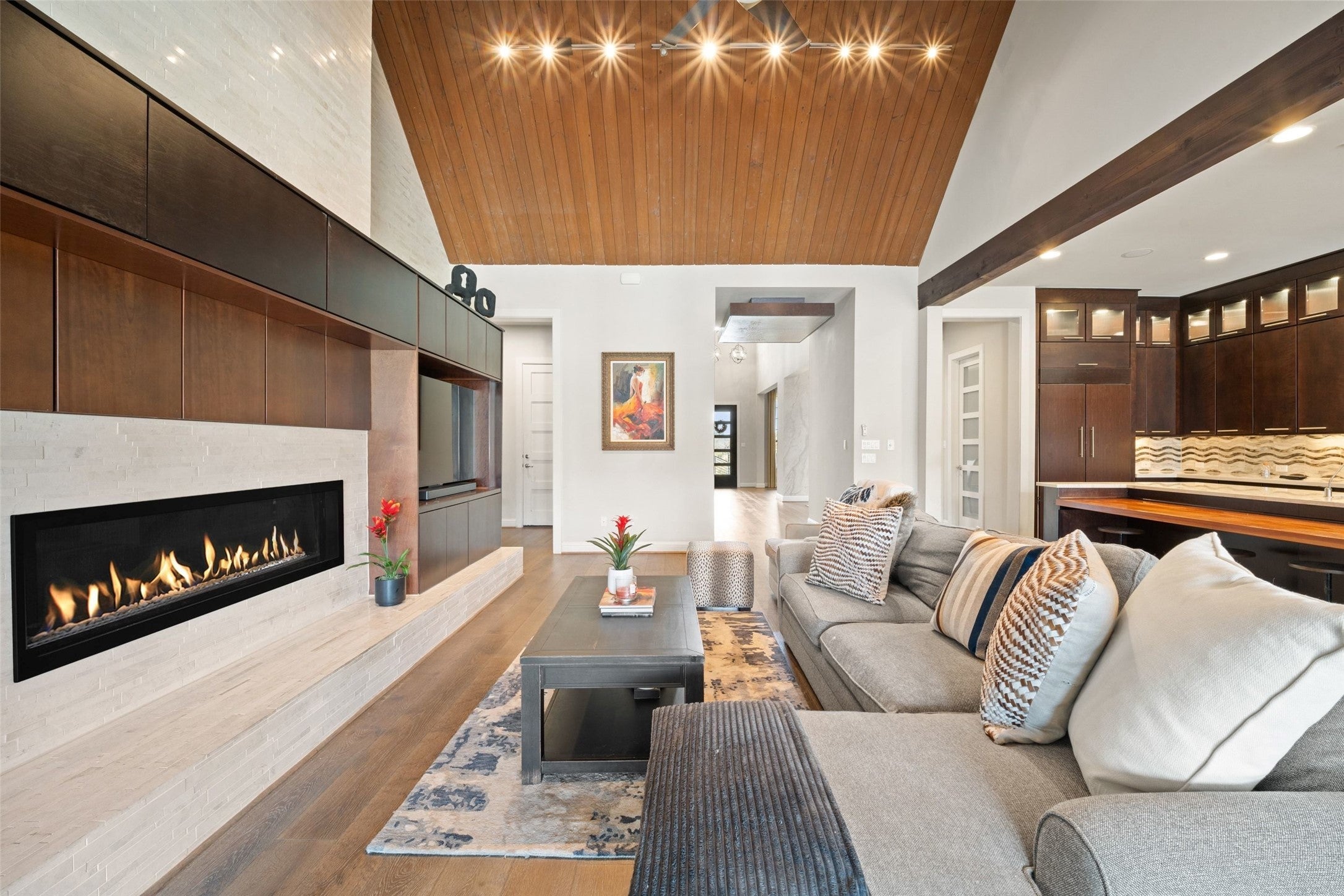 Perched on a hilltop within Lake Travis ISD, this warm contemporary home, once the model home, combines thoughtful design, privacy, and peaceful views on an oversized 2 acre homesite. Only 7–8 minutes to the Hill Country Galleria, 30 minutes to Downtown Austin, and 20 minutes to Dripping Springs' charming city center. A sweeping circular drive creates a memorable arrival while positioning the home to take full advantage of the surrounding landscape and night skies, all while benefiting from a low tax rate and low HOA fees rarely found in properties offering this level of space and setting. The grand entry opens to vaulted ceilings and an expansive great room centered around a large island kitchen designed for gathering and entertaining. Expansive accordian-style doors create a seamless transition to covered outdoor living, where a fireplace, pool, and outdoor grilling area extend the living space for year-round enjoyment. Architectural details throughout include floating stairs, illuminated decorative onyx slabs, and numerous custom design elements, adding warmth and sophistication. The primary suite with spa bath and all 3 secondary bedrooms are located on the main level, creating an easy and functional everyday flow. A standout feature is the attached guest retreat with its own private entrance, kitchenette, and full bath, offering ideal flexibility for guests, multigenerational living, or private workspace needs. Upstairs, a spacious game room with wet bar, dedicated media room, and powder bath provide a separate entertainment space. Fully fenced with generous yard space, dog run, and room to enjoy the Hill Country setting, this property offers a rare balance of space, privacy, and convenience—just minutes from Bee Cave and the Hill Country Galleria’s shopping, dining, and entertainment, as well as the natural beauty of Hamilton Pool and Reimers Ranch Park along the Pedernales River.