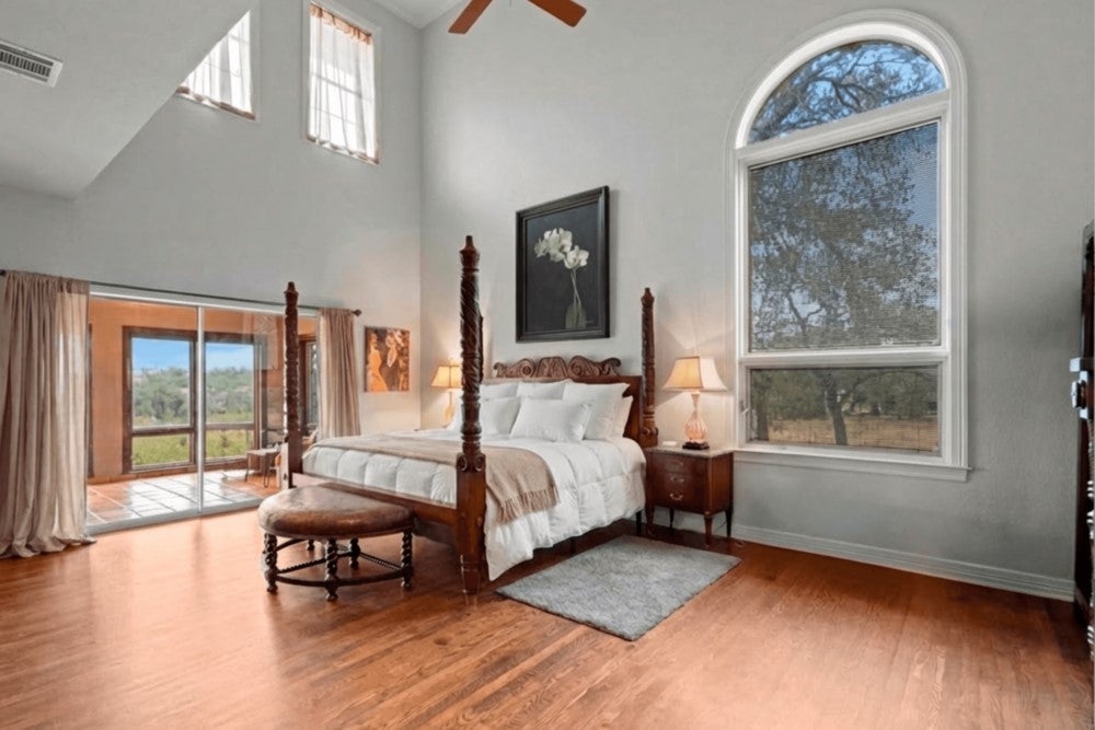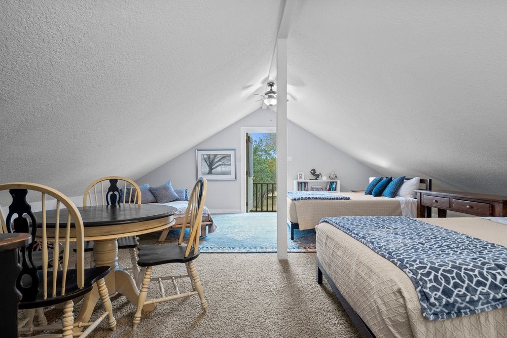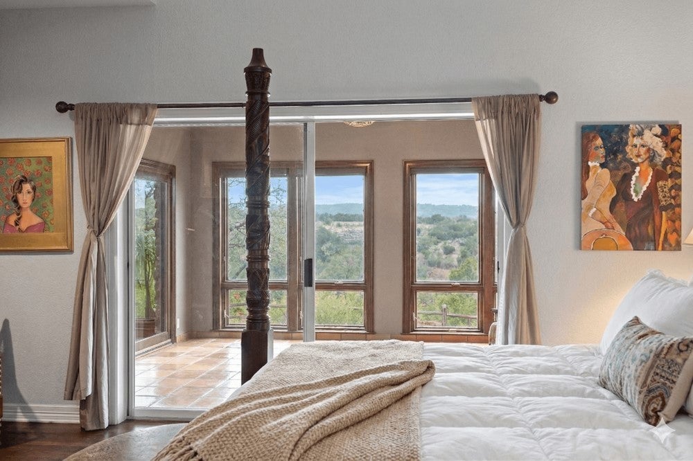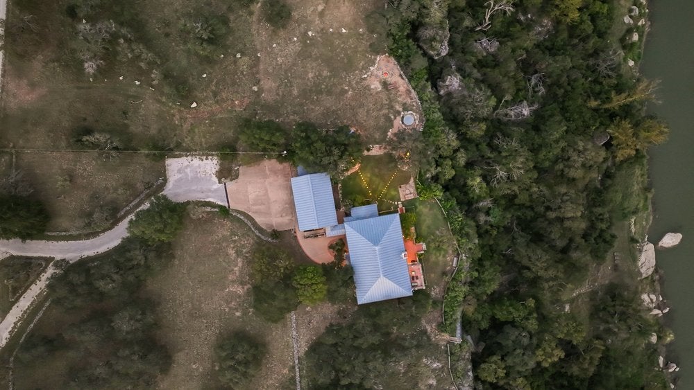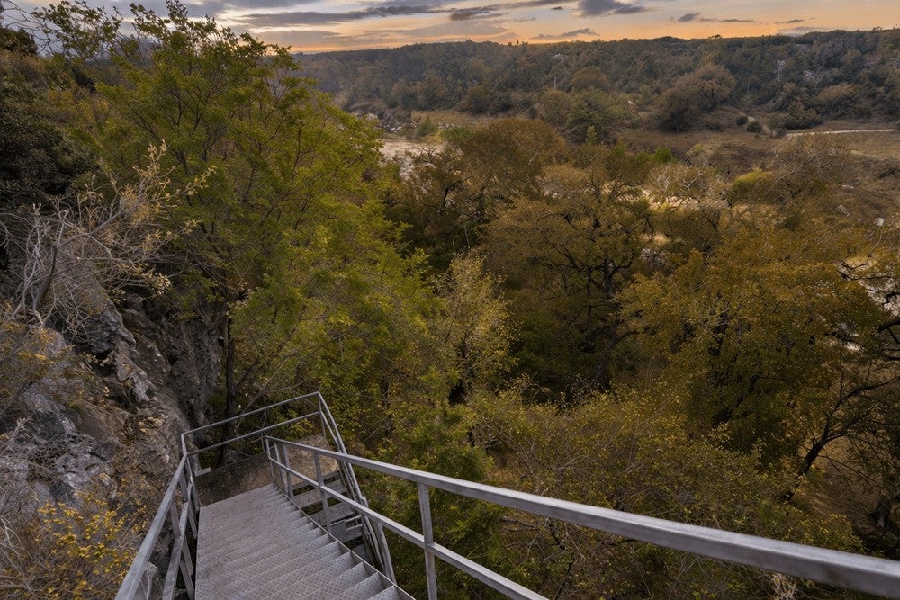 A private Pedernales River estate set behind two electric gates on a limestone bluff, with 200 feet of frontage just 45 minutes from Austin. There is nothing else like it in this market. Perched above the river on 2.8 private acres, this 4,549 SF Hill Country villa is clad in native uncut Texas limestone and topped with a standing seam metal roof. Below the bluff, a spring-fed swimming hole provides a consistent water feature even when other parts of the river run low. A private stairway leads down to it, where the canyon holds the last light of the day, and the setting naturally slows you down. Swim, fish, or spend the evening watching the stars rise over the canyon walls. Inside, the home opens with vaulted ceilings, arched doorways, wood floors, and granite countertops, anchored by a grand living room with a wood-burning stone fireplace. The primary suite is on the main level with a private sunroom and terrace. Upstairs, three guest bedrooms are thoughtfully positioned, including one with a private stargazing terrace and Juliette balcony overlooking the canyon, along with a lofted sitting area that adds flexible living space. The detached garage includes a fully self-contained one-bed, one bath guest apartment with a separate entrance, ideal for guests, extended family, or additional income. Well and septic are already in place. This offering includes the villa on approximately 2.8 acres, with an additional 34.5 acres available separately. That tract features three cabins, a horse arena, barn, stock tank, equipment shed, and greenhouse. Together, the property can remain completely unrestricted, allowing for a private compound, equestrian ranch, wellness retreat, or long-term investment along one of the most storied rivers in Texas. Seller is open to seller financing for qualified buyers.