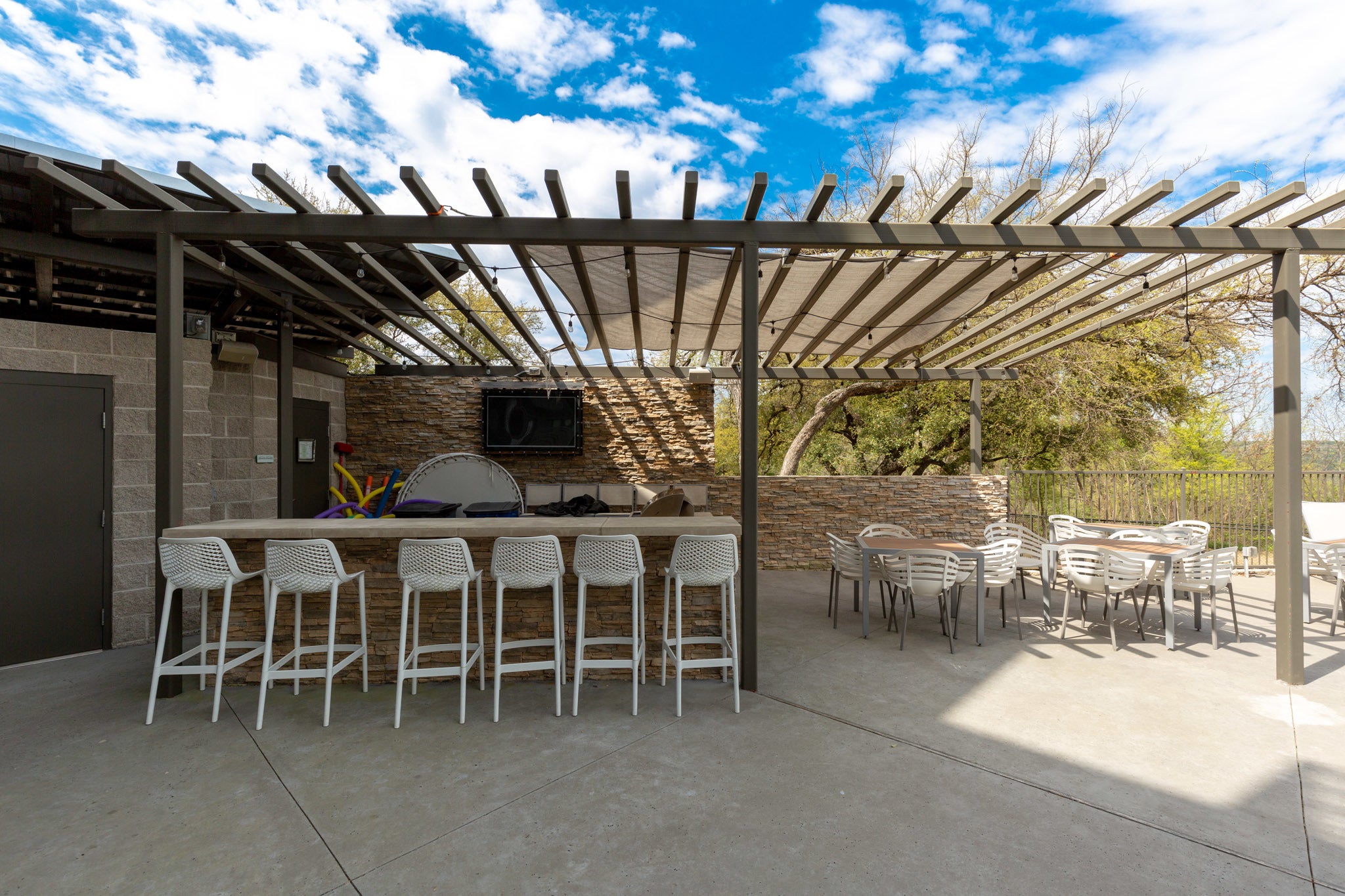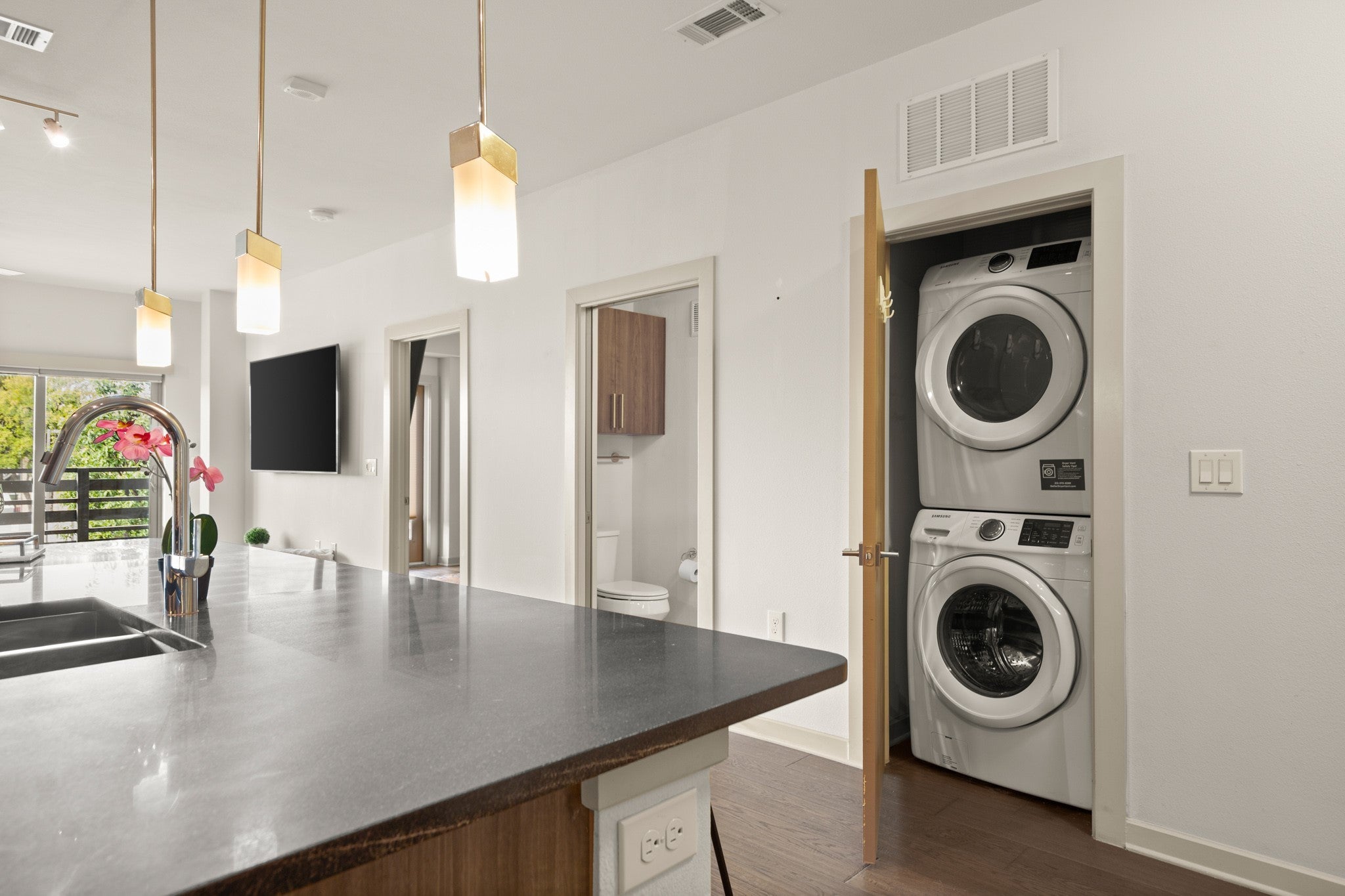 Talk about a class act! Walk in, and the kitchen hits you in the face. Extra large with tons of storage, Quartz countertops, stainless appliances, including a wine cooler. An open concept brings the living room into the heart of the conversation area, the kitchen, of course. A large covered balcony with access from the living room and the bedroom. You can't help but love the master bathroom. A double vanity, a large walk-in closet, and a spacious walk-in shower with a soaking tub, all in one place. It's like going to a nice spa! There is a convenient half bathroom for your guests. No going to the laundromat, the washer and dryer are included. This property has great amenities: a negative edge swimming pool, grilling area overlooking the Barton Creek Greenbelt, a grilling area, dog run, and city skyline views. Assigned, gated parking is a major plus. Tons and tons of restaurants, bars, and shops are just out the front door. Your new home is waiting for you!