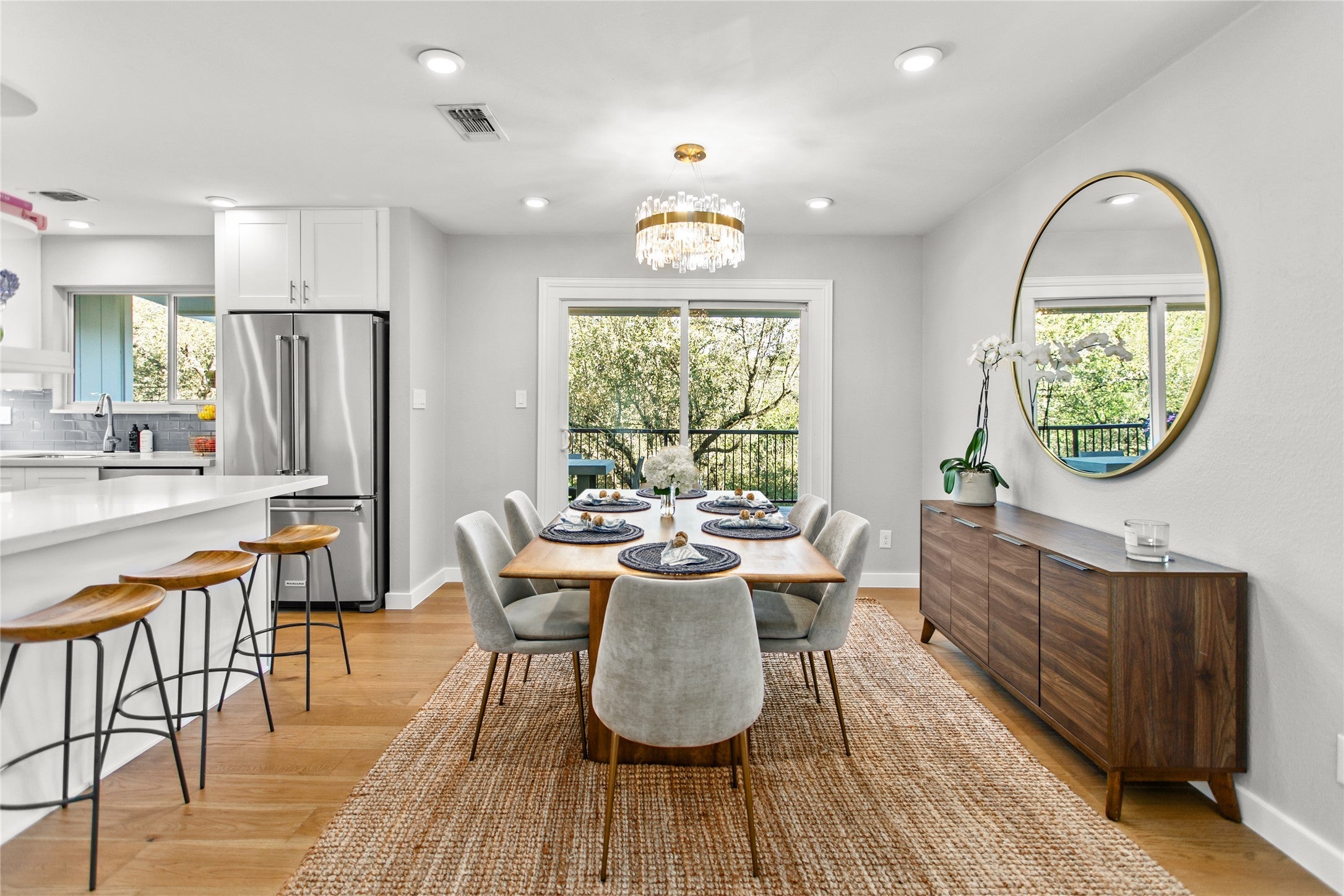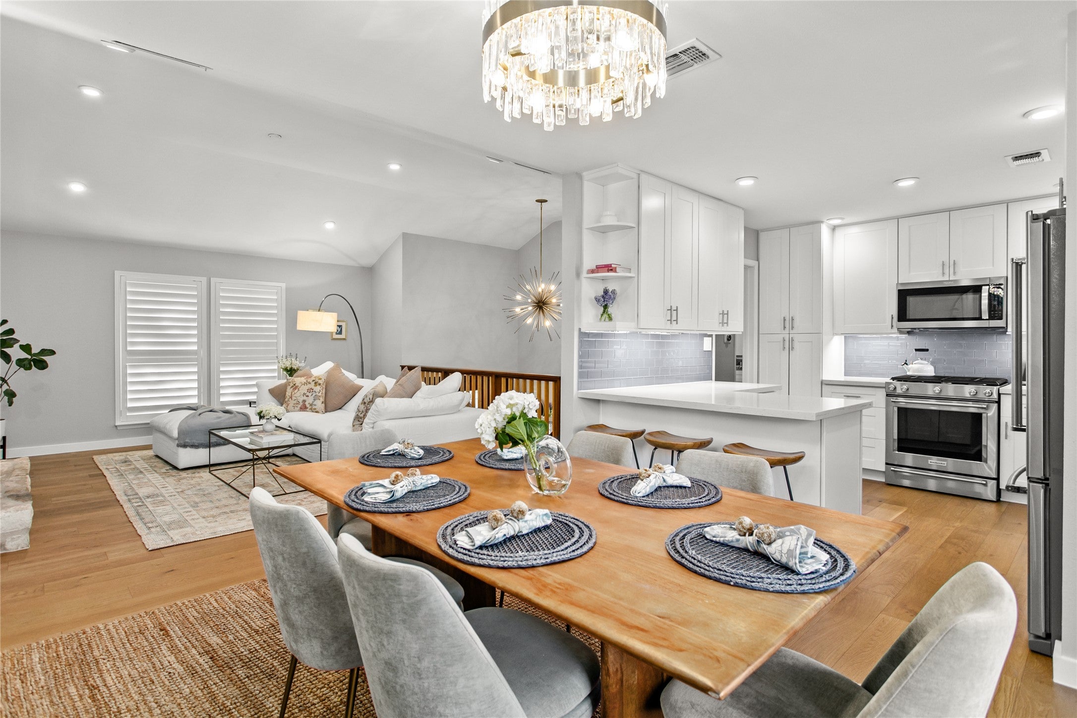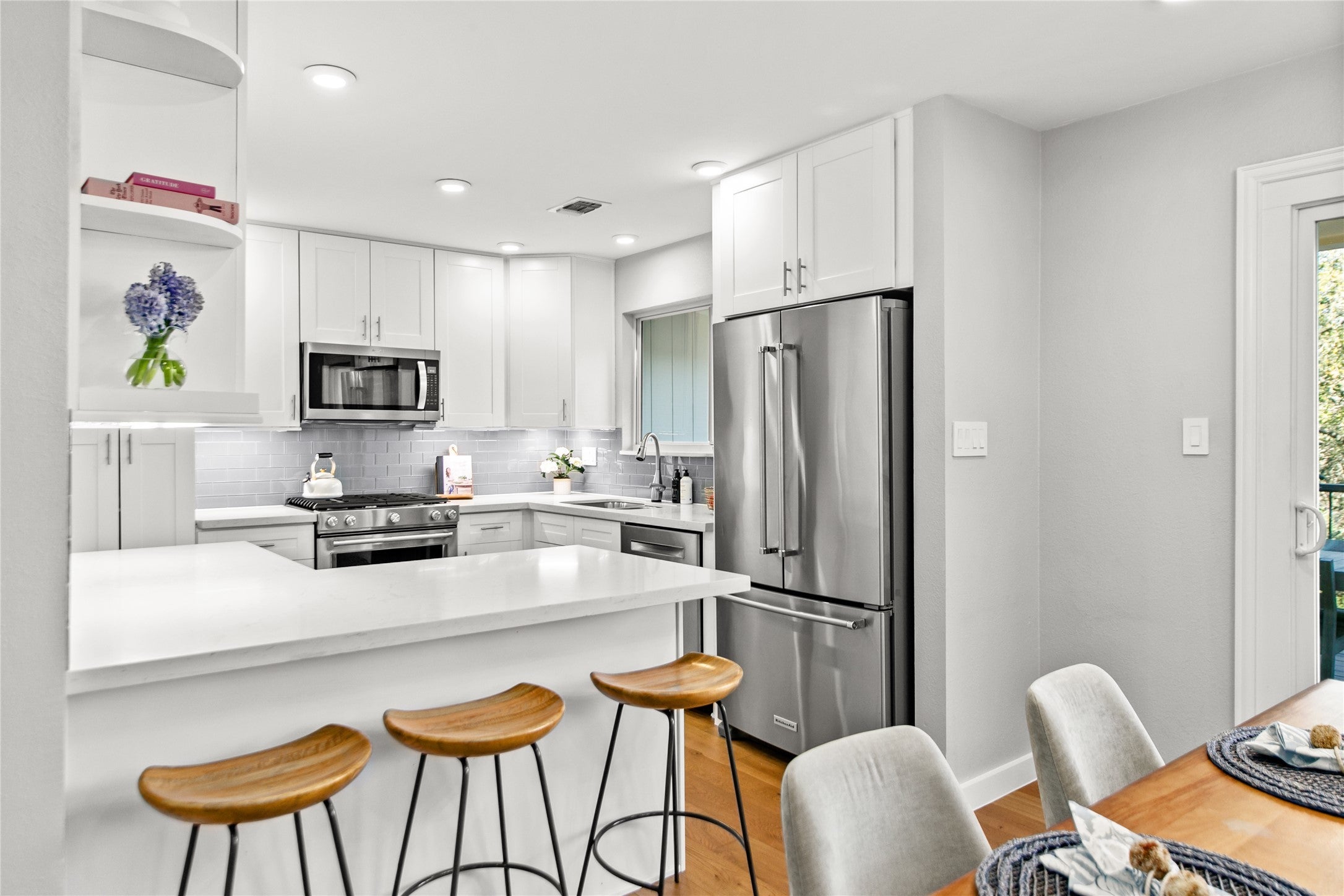 - Built-In Gas Range, Dishwasher, Exhaust Fan, Disposal, Microwave, Wine Refrigerator