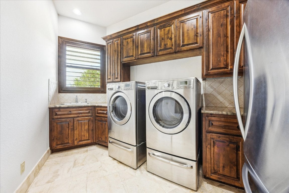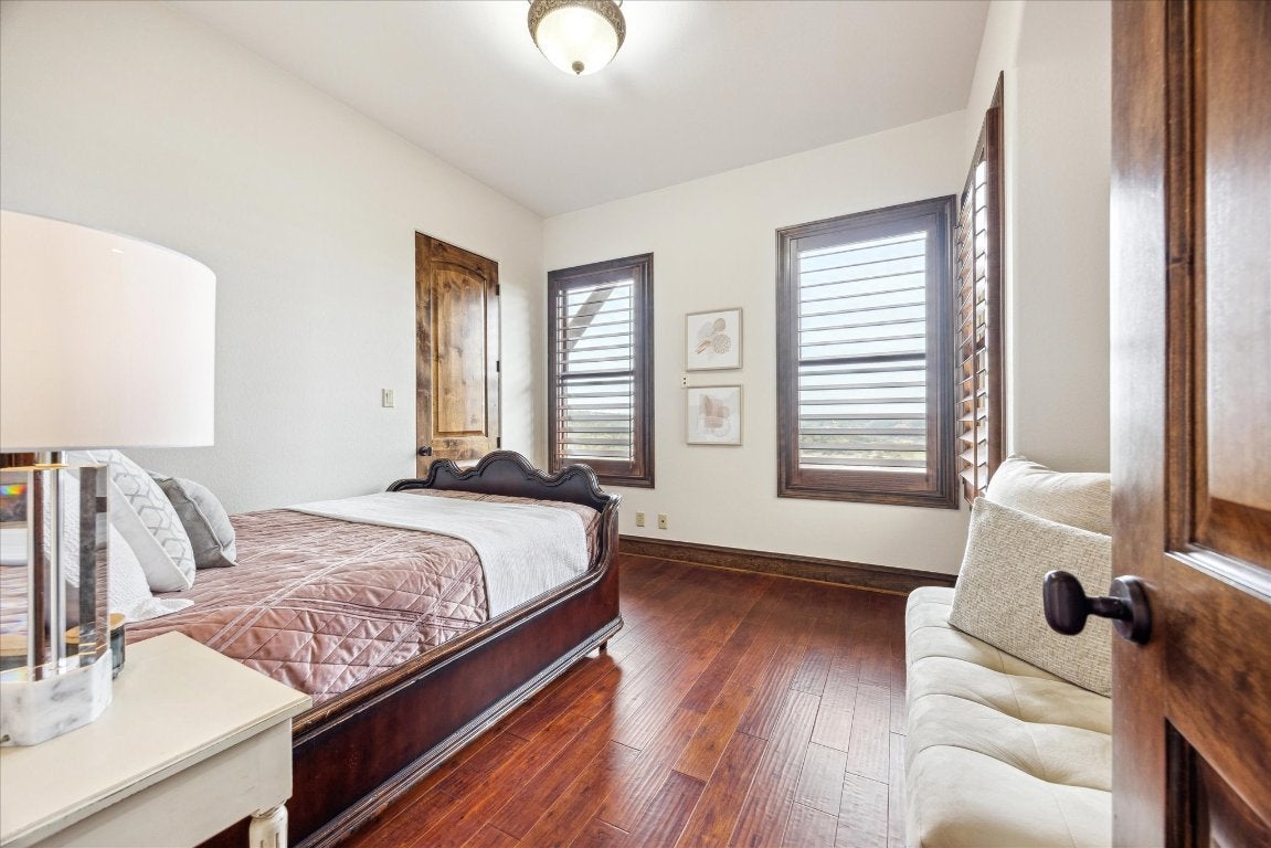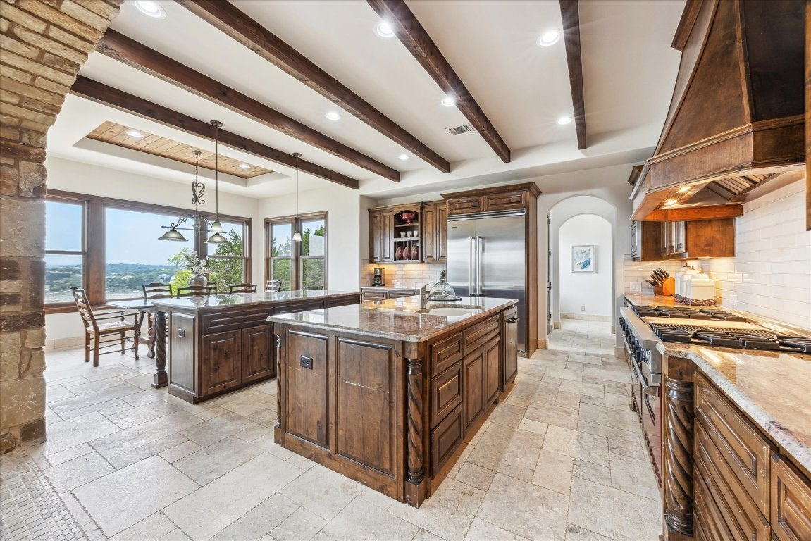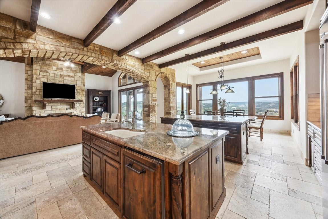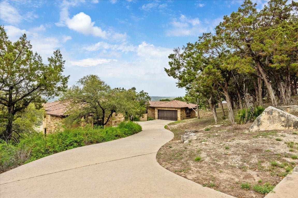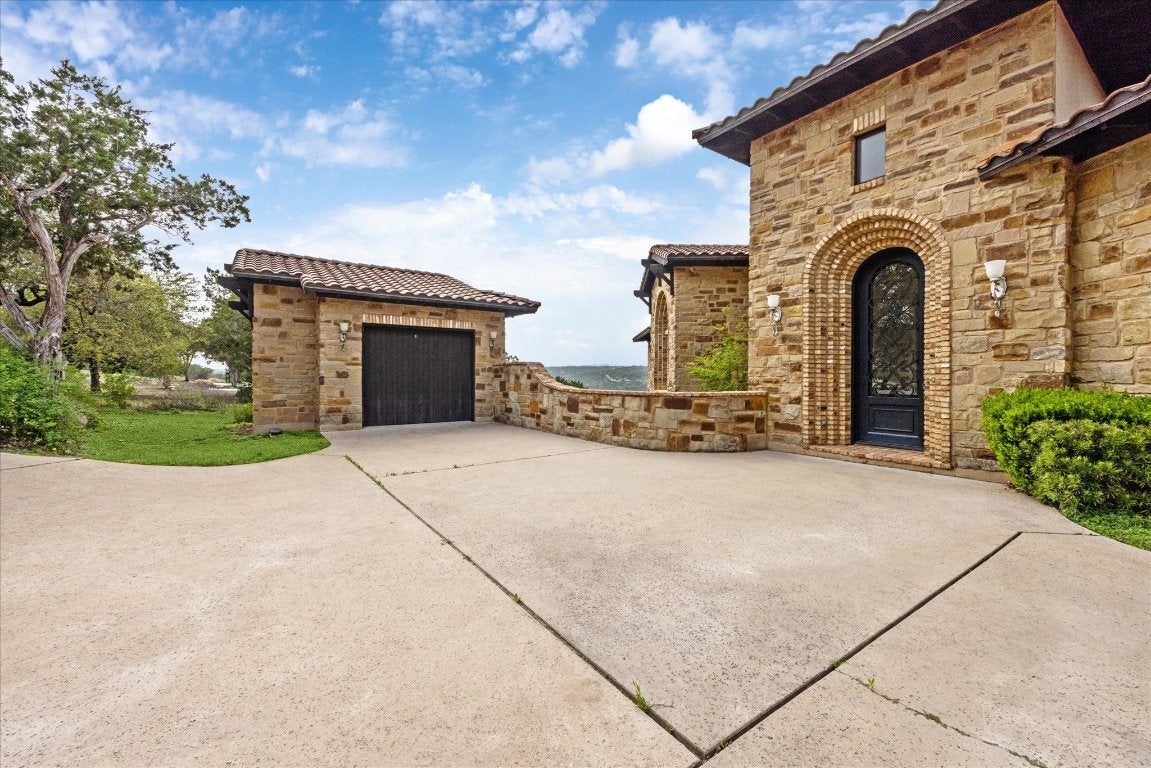This stunning custom-built Mediterranean style estate is nestled in the gated community of Angel Bay. This expansive 5,615 sq-ft residence with 5 bedrooms and 4 bathrooms offers an elegant blend of modern luxury and timeless design, set on an impressive lot of almost 2 ¼ acres with gorgeous Hill Country and Lake Travis views! Conveniently located near Bee Cave and Lakeway! Cathedral wood beam ceilings, stone archways and natural light illuminate the open floor plan. The family room offers a decorative stone fireplace and the viewing decks. The gourmet kitchen features granite countertops, newer subway tile backsplashes, Viking double oven with six burner gas range, two center islands, breakfast bar, dining area, and wet bar with wine refrigerator - perfect for entertaining. The inviting formal dining room is adorned with a beautiful dome ceiling and adjacent butler’s pantry. There is an office with lovely views for daily tasks. The main level primary suite boasts a wood beamed cathedral ceiling, panoramic views and a balcony, offering a serene retreat. Its luxurious bathroom has separate vanities, walk-in shower, soaking tub and walk in closet. There is a recreation room with wet bar on the lower level also with breathtaking views. A media room with nearby office area and 3 bedrooms are also on this level. HVAC system, stone and hardwood floors, impressive stone and woodwork, wood cased dual paned windows, decorative doors with iron detail, newer appliances, water softener and an alarm are additional features. There is an attached two car garage, separate single garage, and laundry room with sink. A Yamaha Rhino is on site with decorative paved access to the property’s 2 slip boat dock with lift and viewing deck. Jet skis, 35” boat and furnishings are negotiable. There is nearby access to the community park and boat launch. Experience the epitome of lakeside living with breathtaking views and a wealth of amenities where luxury and nature harmoniously converge.