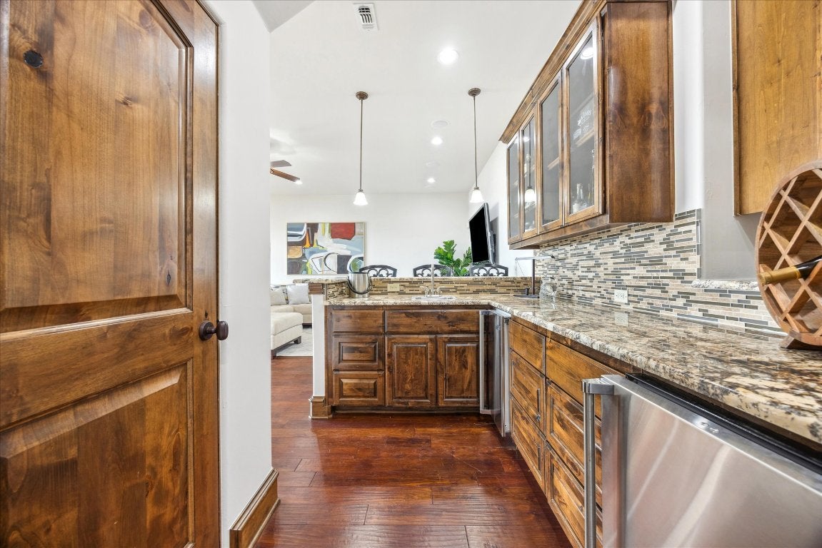 - Bar Fridge, Built-In Gas Range, Built-In Oven, Dishwasher, Disposal, Double Oven, Exhaust Fan, Gas Cooktop, Ice Maker, Microwave, Range Hood, Stainless Steel Appliance(s), Vented Exhaust Fan, Wine Refrigerator