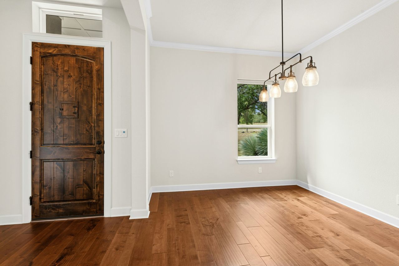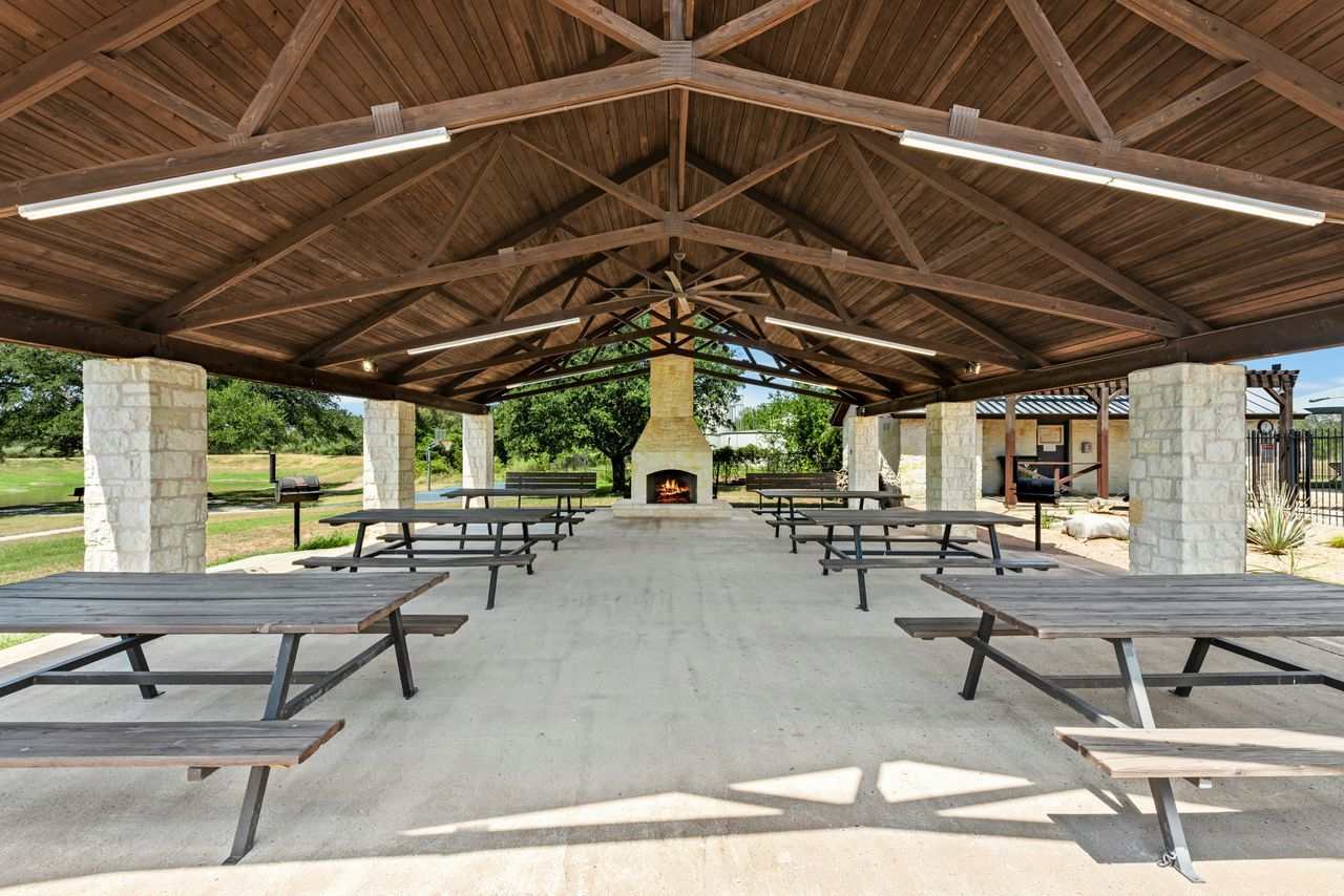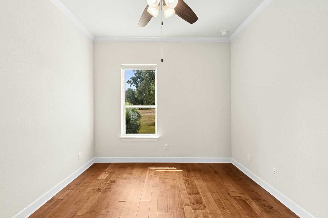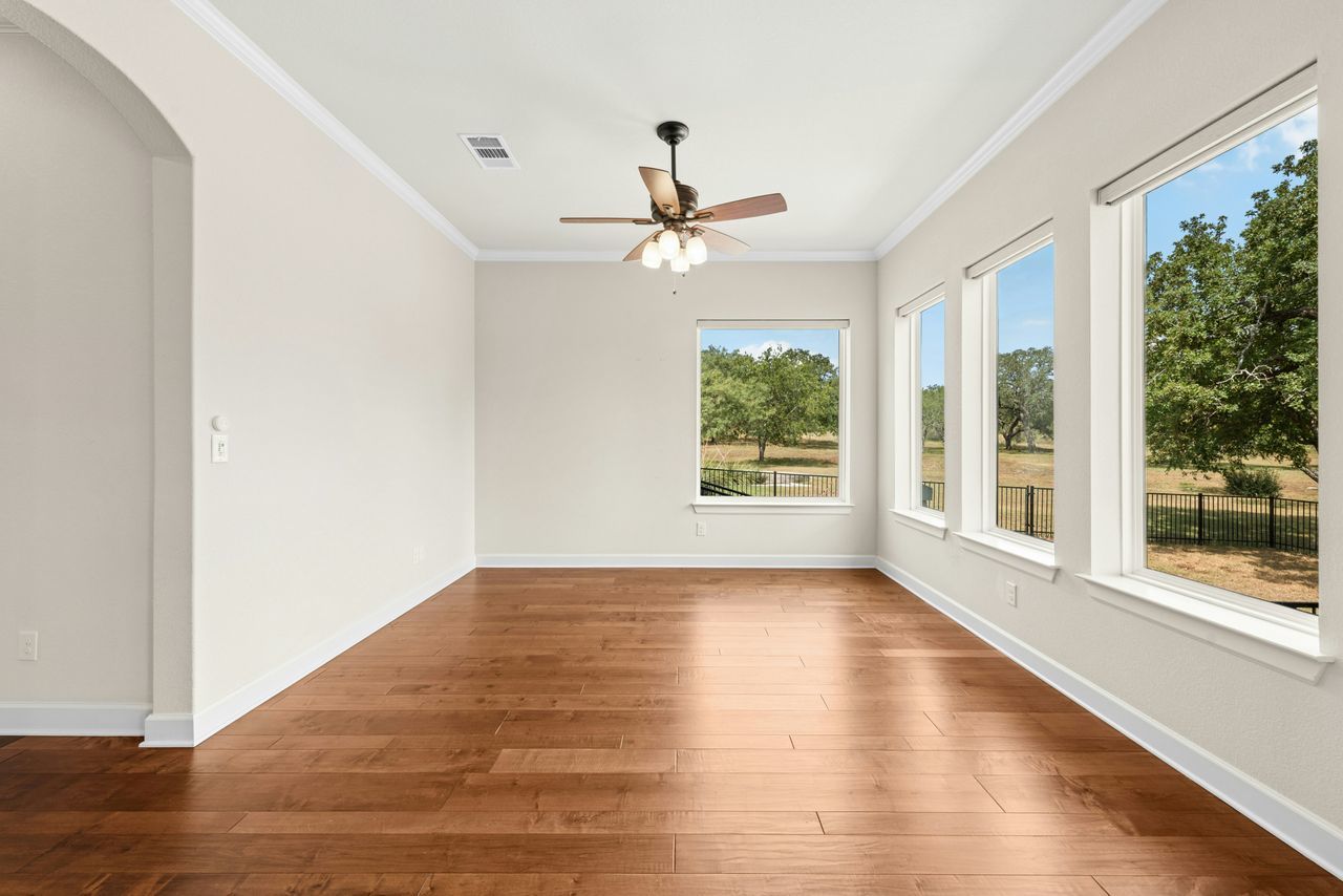 Tucked beneath a canopy of more than 100 live oaks, this stunning 2,730 sq. ft. David Weekley custom home sits on 6.89 spectacular acres in the sought-after gated community of Double Horn. The one-of-a-kind lot is cleared, private, has a lovely wet weather creek, and is at the end of a cul-de-sac. With modern upgrades and an easy flow for entertaining, the single story stunner blends Hill Country tranquility with everyday convenience. Inside, wide-plank hardwood floors, soaring ceilings, and natural light softened by custom Hunter Douglas automatic shades create an inviting ambiance. The chef’s kitchen boasts high-end Stainless Steel appliances, a generous island with space for seating, and seamless connection to open living spaces. Gather in the family room around the focal point fireplace on cool evenings. Host holidays or gatherings in the spacious dining room. Work from home in the separate front office with French doors for privacy. Ceiling fans throughout, deep crown molding, a built-in Ring system, and a thoughtfully designed 3-car garage with built-in cabinetry add comfort and practicality. Wrought iron fencing around both the patio and up close backyard area, plus a summer kitchen, enhances outdoor living. Beyond the home, Double Horn’s amenities elevate your lifestyle: a resort-style pool, playground, sand volleyball court, serene pond, and a pavilion with grills and stone fireplace for community gatherings. With tree-dotted landscapes, larger lots, and gated privacy, Double Horn is a rare balance of retreat and connection. Close to lakes, golf, wineries, hospital, services and shopping.