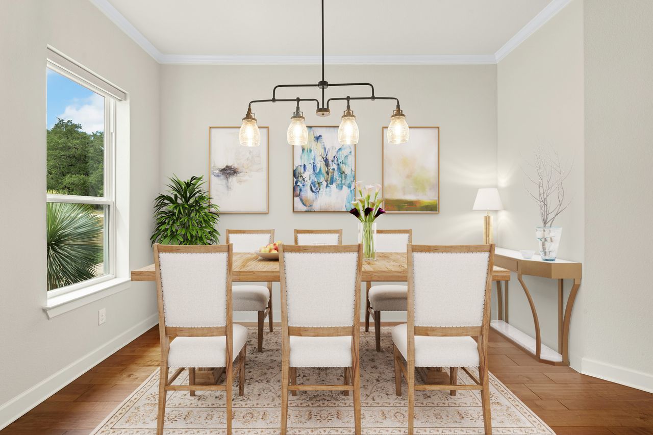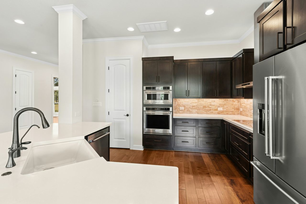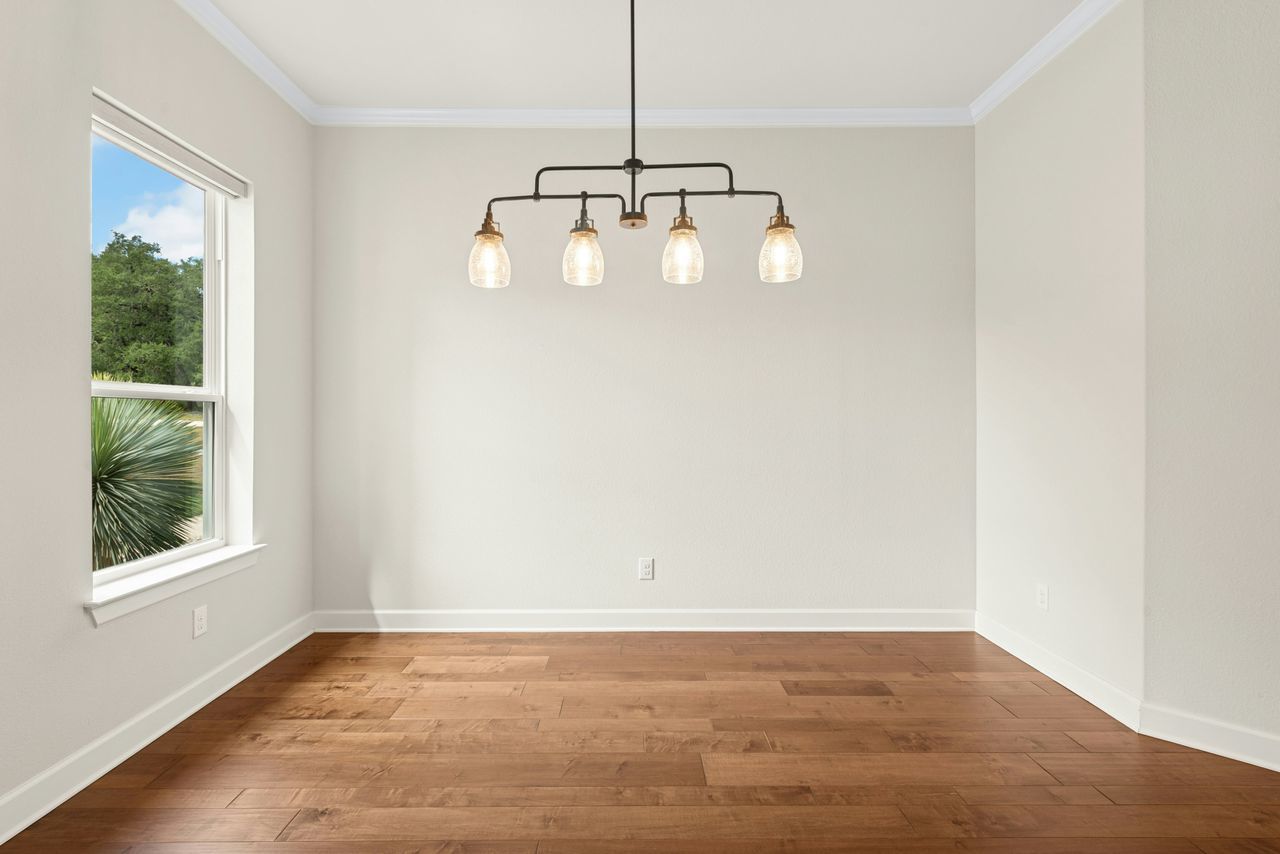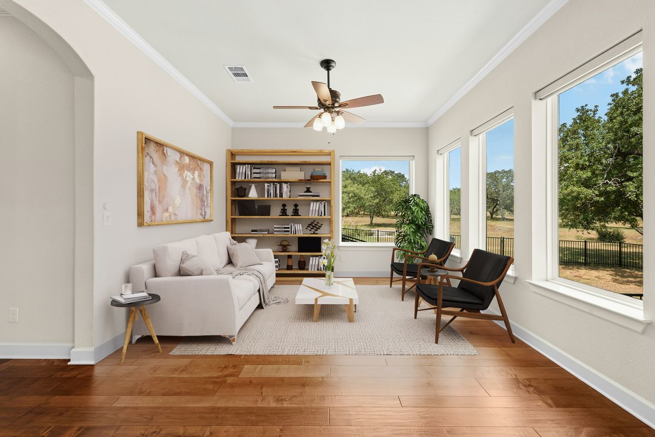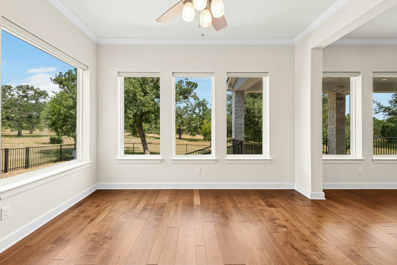 Tucked beneath a canopy of more than 100 live oaks, this stunning 2,730 sq. ft. David Weekley custom home sits on 6.89 spectacular acres in the sought-after gated community of Double Horn. The one-of-a-kind lot is cleared, private, has a lovely wet weather creek, and is at the end of a cul-de-sac. With modern upgrades and an easy flow for entertaining, the single story stunner blends Hill Country tranquility with everyday convenience. Inside, wide-plank hardwood floors, soaring ceilings, and natural light softened by custom Hunter Douglas automatic shades create an inviting ambiance. The chef’s kitchen boasts high-end Stainless Steel appliances, a generous island with space for seating, and seamless connection to open living spaces. Gather in the family room around the focal point fireplace on cool evenings. Host holidays or gatherings in the spacious dining room. Work from home in the separate front office with French doors for privacy. Ceiling fans throughout, deep crown molding, a built-in Ring system, and a thoughtfully designed 3-car garage with built-in cabinetry add comfort and practicality. Wrought iron fencing around both the patio and up close backyard area, plus a summer kitchen, enhances outdoor living. Beyond the home, Double Horn’s amenities elevate your lifestyle: a resort-style pool, playground, sand volleyball court, serene pond, and a pavilion with grills and stone fireplace for community gatherings. With tree-dotted landscapes, larger lots, and gated privacy, Double Horn is a rare balance of retreat and connection. Close to lakes, golf, wineries, hospital, services and shopping.