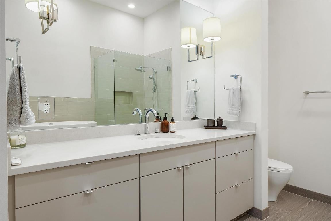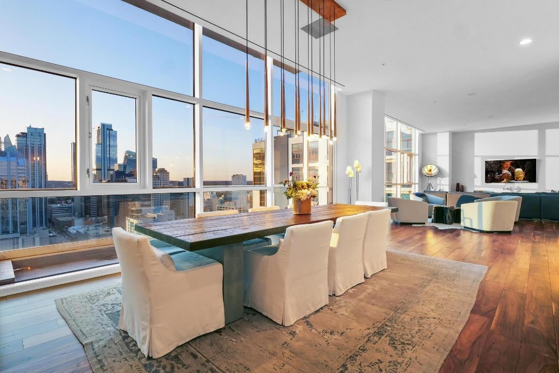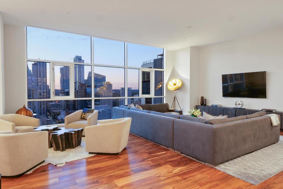 Luxury penthouse living on the 30th floor of 5FiftyFive in the heart of downtown Austin. One of the largest floor plans in the building, this expansive residence spans 3,638 square feet with soaring 12-foot ceilings, offering a rare sense of scale rarely found in high-rise living. Floor-to-ceiling windows wrap nearly every room, capturing sweeping panoramic views of downtown Austin, Lady Bird Lake, and the surrounding skyline. A coveted western exposure floods the home with natural light throughout the day and delivers breathtaking sunset views each evening—among the most dramatic and unobstructed in the city. The thoughtfully designed layout features three spacious bedrooms, three full bathrooms, and a dedicated office, ideal for remote work, a private study, or creative space. The expansive primary suite offers serene city views, a generous walk-in closet, and a spa-inspired en-suite bath. Designed for elevated entertaining, the open-concept living and dining areas flow seamlessly into the chef’s kitchen, appointed with Wolf and Sub-Zero appliances, including a 6-burner gas range, double ovens, and a full-size Sub-Zero refrigerator. A built-in wet bar with wine refrigerator, dedicated laundry room, and refined luxury finishes throughout enhance both function and sophistication. Residents enjoy a full-service lifestyle with concierge and doorman services, rooftop pool, resident lounge, state-of-the-art fitness center, Topgolf Swing Suite, and on-site F45 training. Ideally positioned near the ground-up redevelopment of East 6th Street and the new Austin Convention Center district, which will feature entertainment venues, dining destinations, and a live dance hall, this residence offers exceptional walkability and long-term appeal in one of downtown Austin’s most transformative locations. A rare opportunity to own a premier penthouse combining iconic views, generous square footage, and true luxury living.