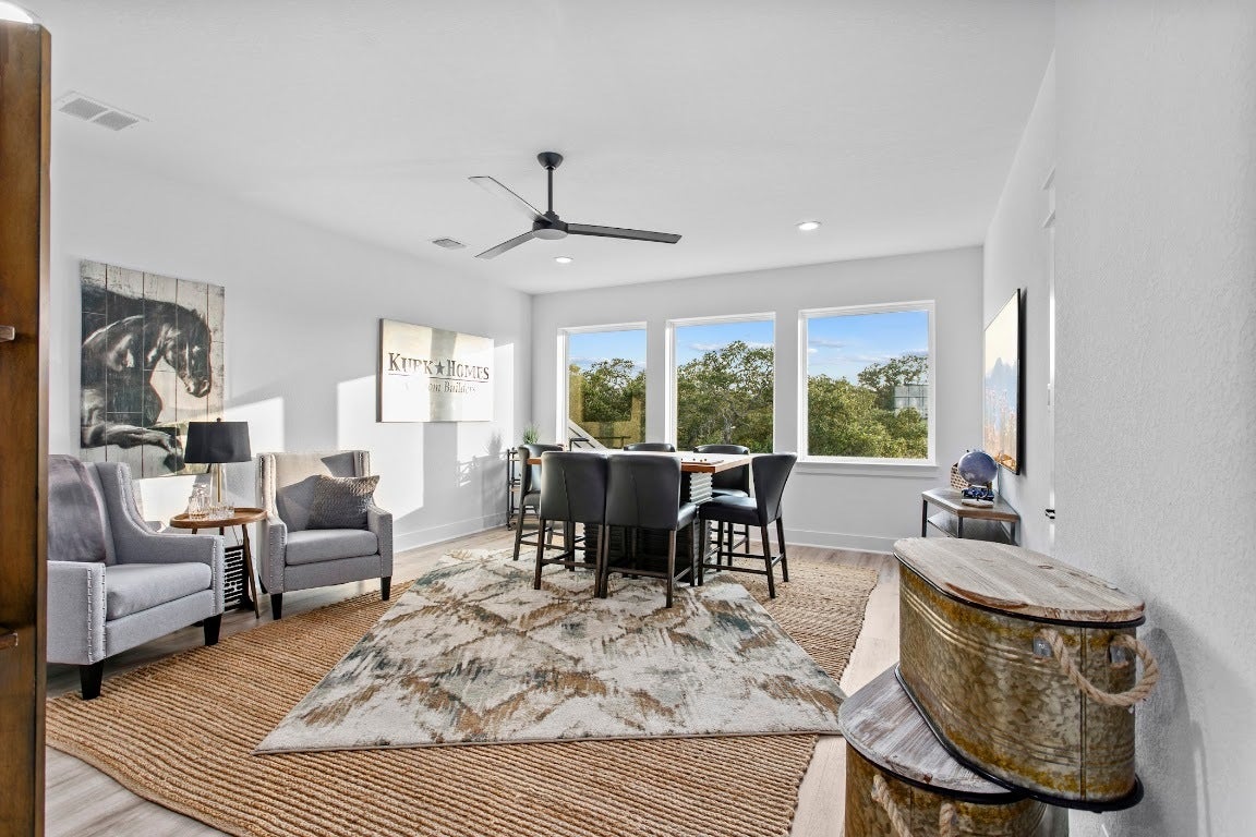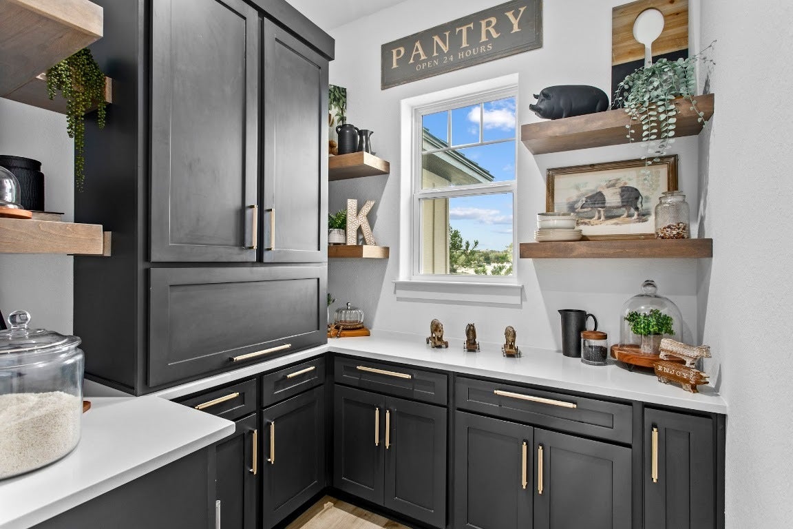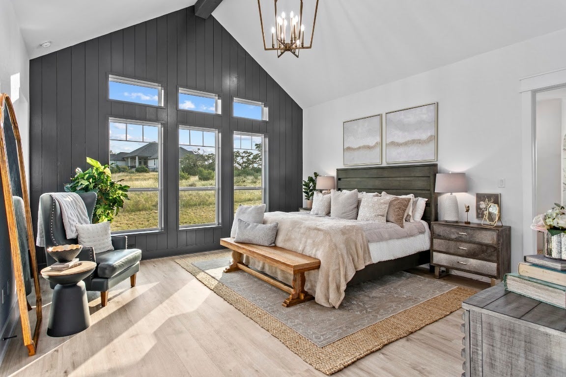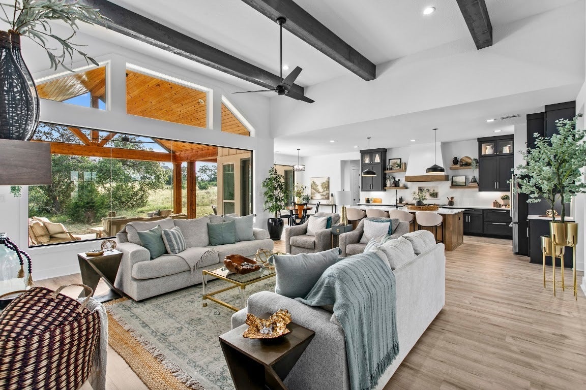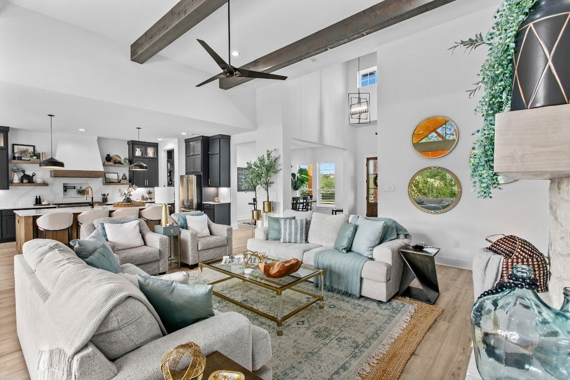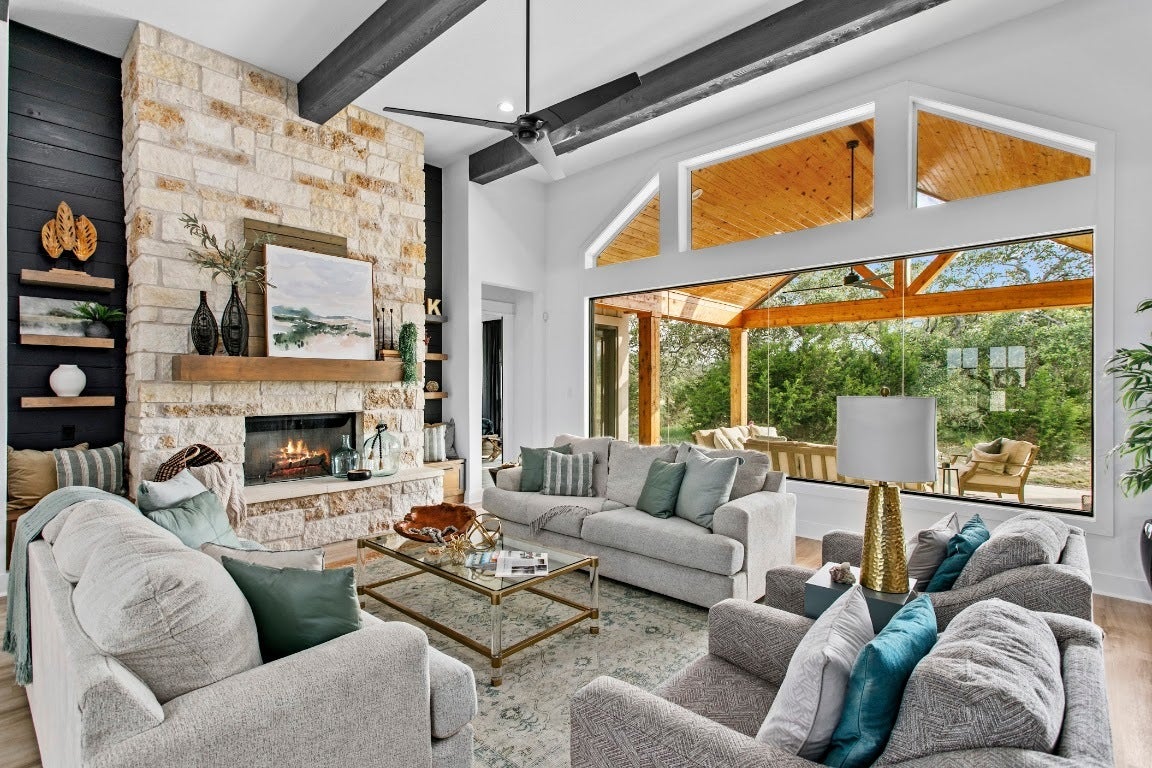 A Rare Opportunity to Own a Custom Model Home by Kurk Homes! From the moment you walk through the double front doors, the two-story foyer with herringbone tongue & groove ceiling sets a welcoming tone. Thoughtful details are found throughout—from unique designer lighting, LVT floors, the private study with sliding doors open and the open concept living room anchored by a striking fireplace and accented with wood beamed ceilings. The kitchen is a true centerpiece, featuring an oversized island, quartz countertops, pot filler, floor-to-ceiling two toned cabinetry, and rich finishes. Large seamless windows showcase views of the spacious covered patio and surrounding landscape. The owner’s suite is tucked away with vaulted ceilings, vertical shiplap, a spa-like bath with a freestanding tub, walk-in shower with tiled archway, and a wrap-around vanity with dedicated sitting space. A custom room sized closet with island connects directly to the utility room for added convenience. Upstairs, a spacious game room and private guest suite offer room to unwind or host. Additional highlights include a mudroom with built-ins, powder bath, charming doggie nook, custom metal stair railing, an exterior of stucco and natural full-dimensional stone, and an oversized three-car garage. Every space was designed with care—this home is truly special.
