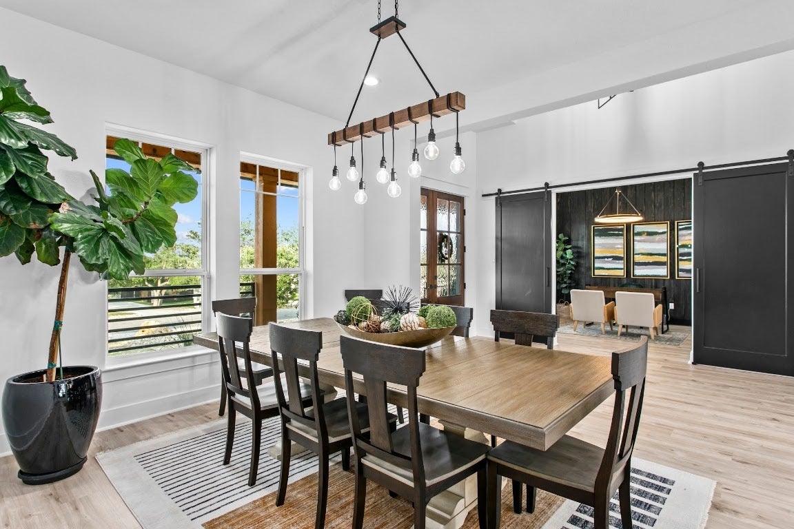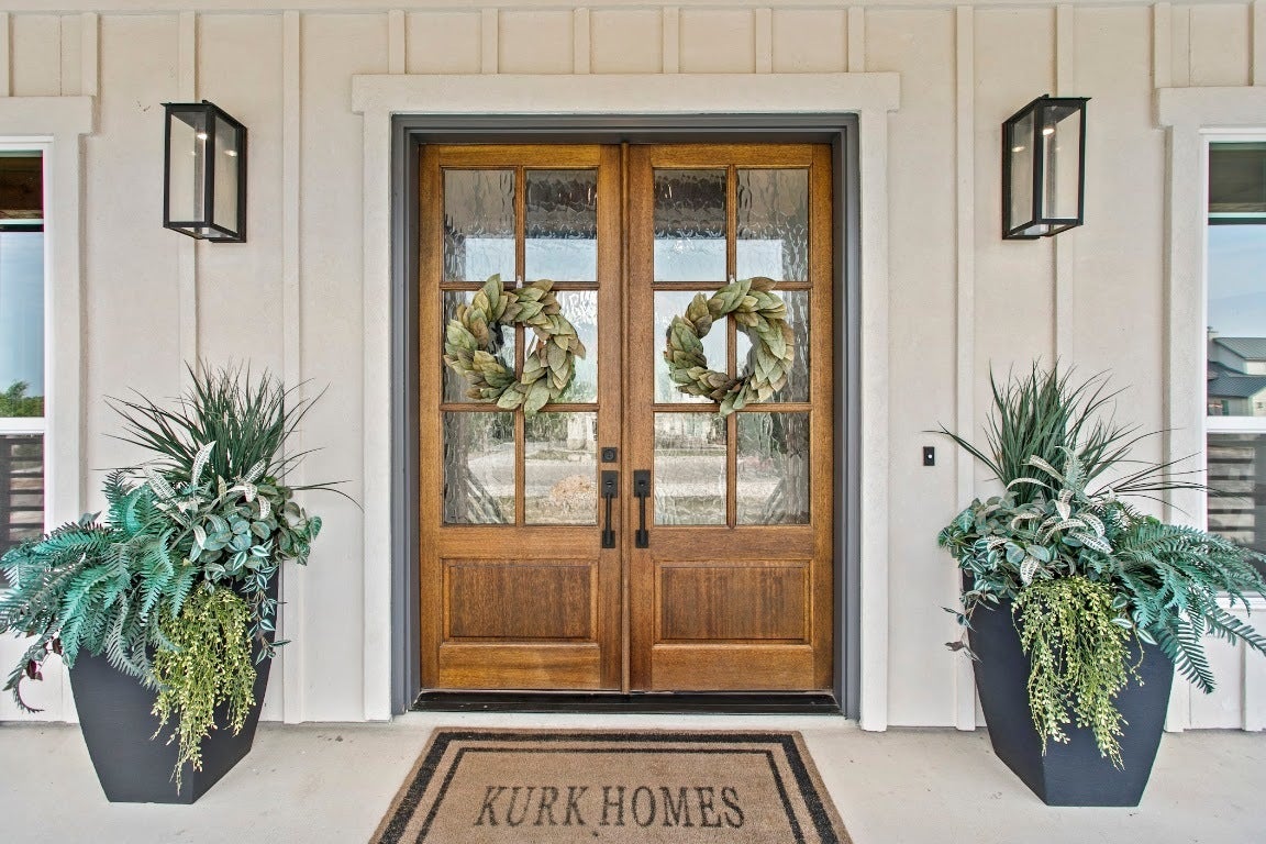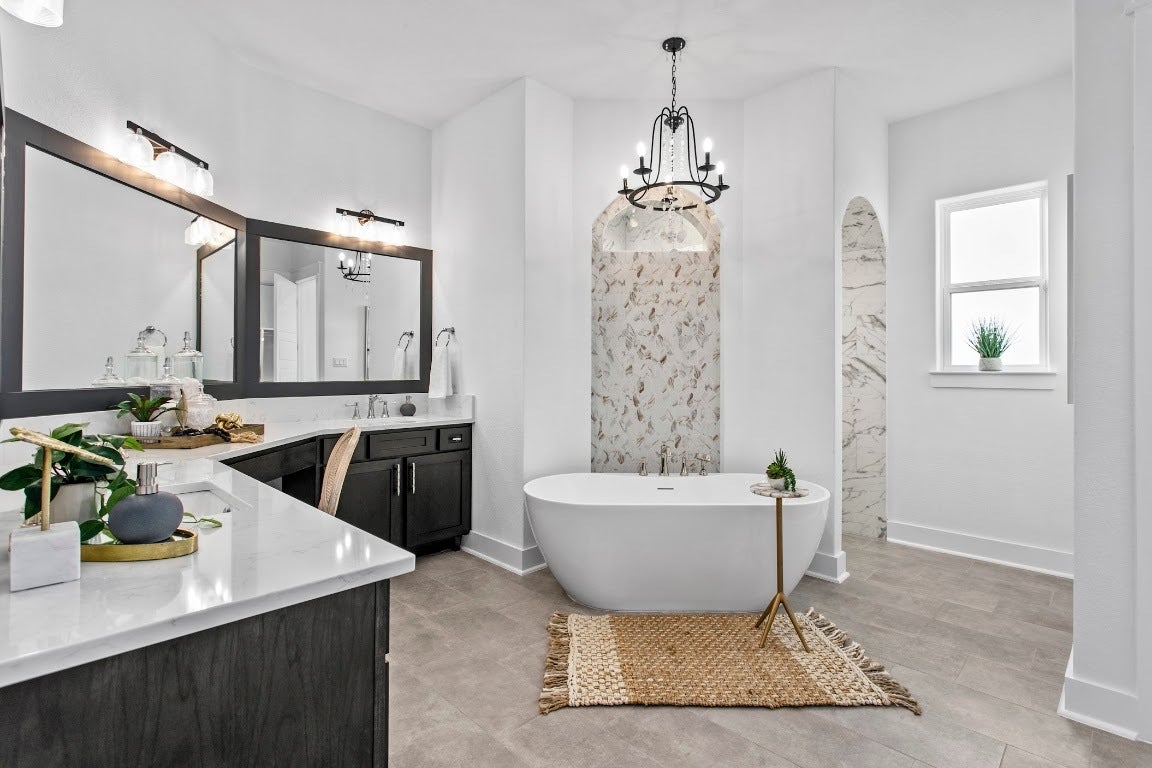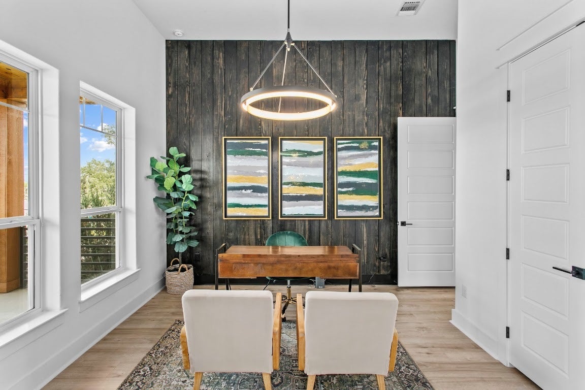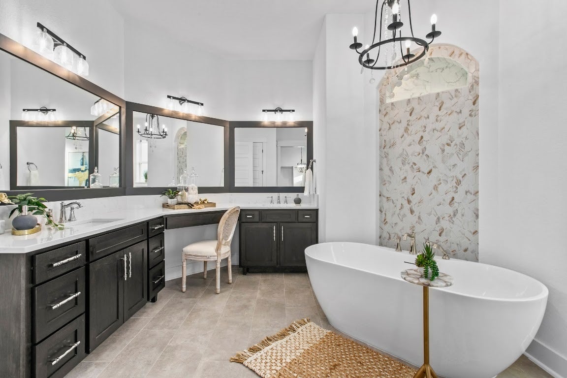 A Rare Opportunity to Own a Custom Model Home by Kurk Homes! From the moment you walk through the double front doors, the two-story foyer with herringbone tongue & groove ceiling sets a welcoming tone. Thoughtful details are found throughout—from unique designer lighting, LVT floors, the private study with sliding doors open and the open concept living room anchored by a striking fireplace and accented with wood beamed ceilings. The kitchen is a true centerpiece, featuring an oversized island, quartz countertops, pot filler, floor-to-ceiling two toned cabinetry, and rich finishes. Large seamless windows showcase views of the spacious covered patio and surrounding landscape. The owner’s suite is tucked away with vaulted ceilings, vertical shiplap, a spa-like bath with a freestanding tub, walk-in shower with tiled archway, and a wrap-around vanity with dedicated sitting space. A custom room sized closet with island connects directly to the utility room for added convenience. Upstairs, a spacious game room and private guest suite offer room to unwind or host. Additional highlights include a mudroom with built-ins, powder bath, charming doggie nook, custom metal stair railing, an exterior of stucco and natural full-dimensional stone, and an oversized three-car garage. Every space was designed with care—this home is truly special.