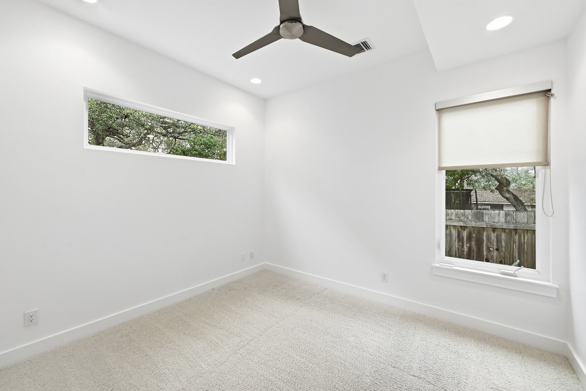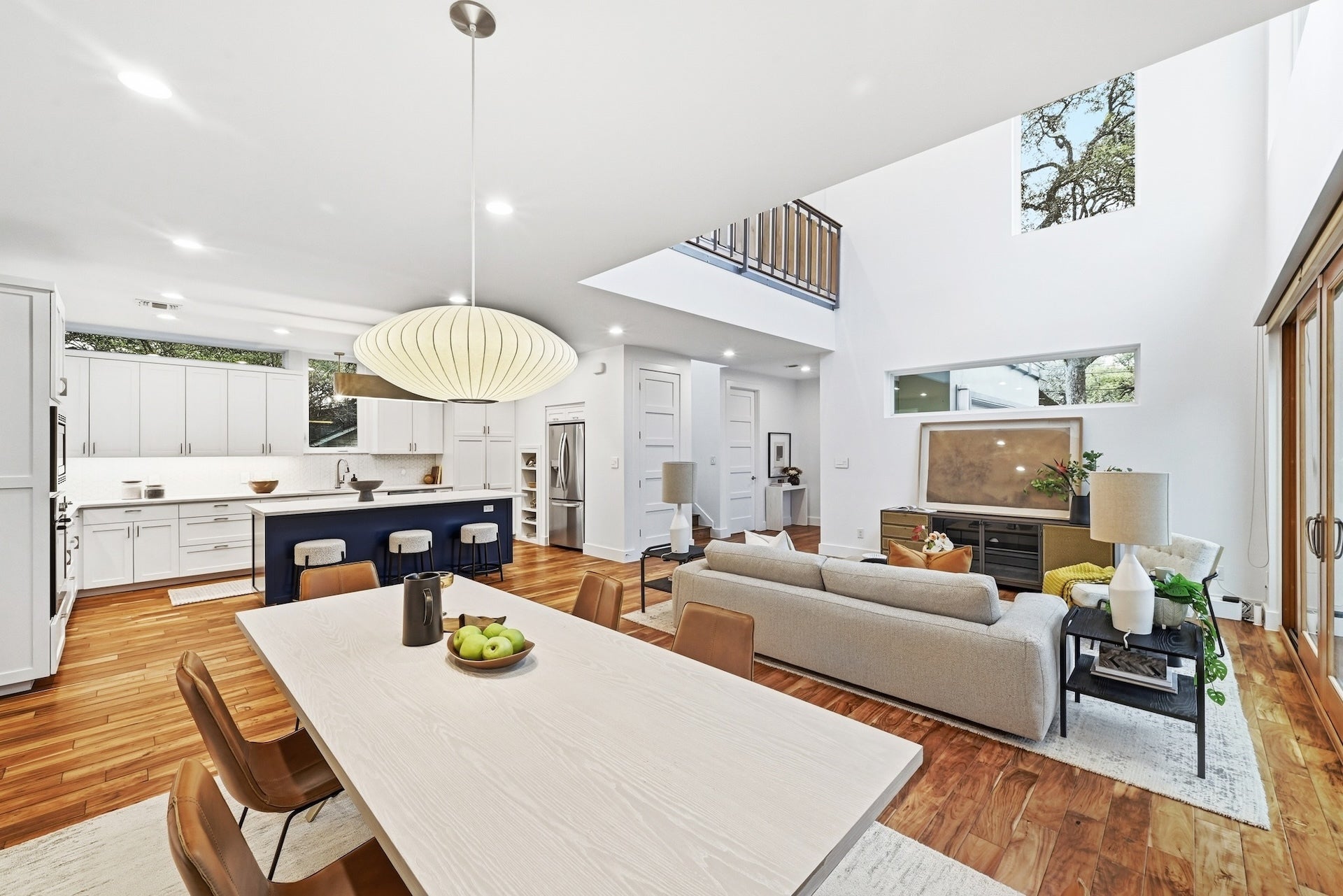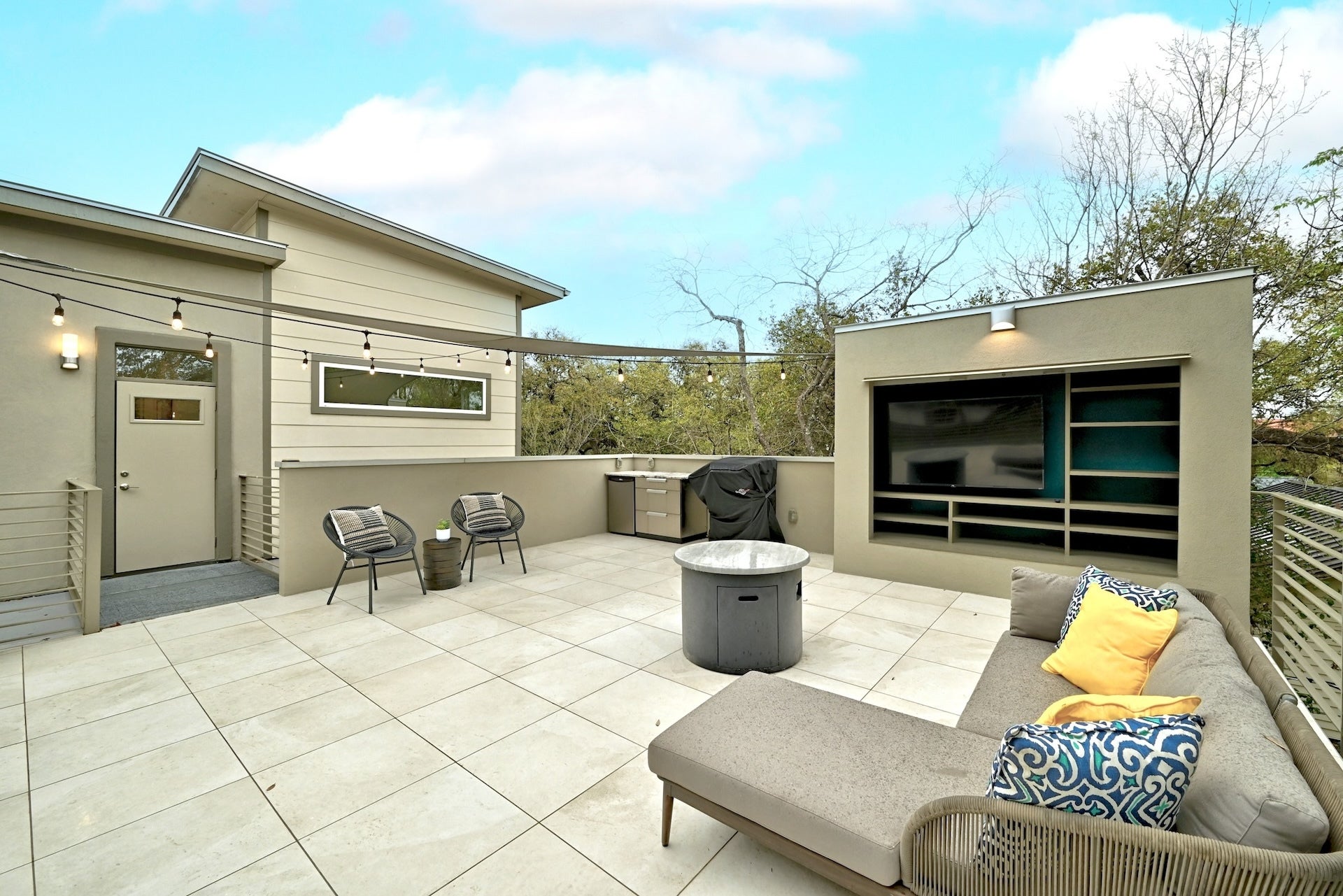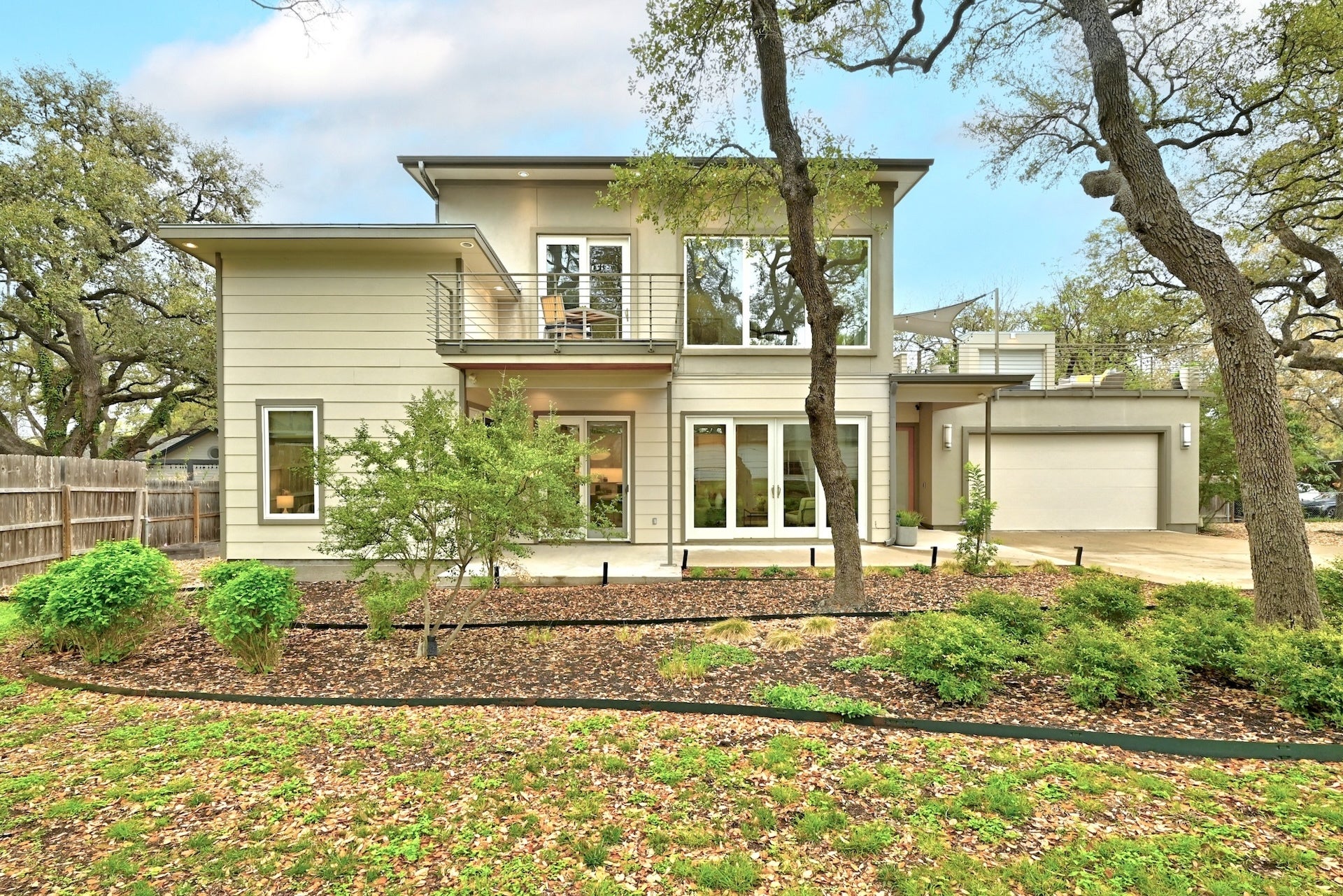 Tucked into a large, private wooded lot in the heart of 78704, The Loft is a 3-bedroom, 2-bath home with soaring ceilings and walls of windows that fill the interior with natural light. Built in 2012 and set on a generous .24-acre lot, the property offers rare privacy while remaining close to the energy of South Austin. Acacia wood floors add warmth throughout the living spaces, and the kitchen has been updated with new countertops and backsplash tile. The primary suite includes a renovated bathroom, a custom closet, and a dramatic loft-style connection to the living space below, with a custom wood-and-metal handrail catwalk that leads to one of the home’s outdoor decks and a luxury outdoor living area. A recently built 20x20 rooftop deck over the garage, designed by architect François Lévy and constructed by R Builders, creates a standout entertaining space. The deck features an industrial-grade sunshade, a built-in roll-top cabinet with a mounted 65” TV, and a granite counter with stainless storage and a new outdoor refrigerator. Behind the house, a custom 12x8 detached office/gym (Tuff Shed, custom designed) provides flexible space for work or fitness. The structure includes French doors, LVP flooring, LED lighting, a modern porch light, mini-split climate control (Mr. Cool), and full insulation and drywall. The property also includes a two-car garage, custom landscaping upgrades, and multiple outdoor living areas. Located just minutes from South Lamar and South First, the home offers easy access to many of the restaurants, shops, and destinations that define 78704 living.