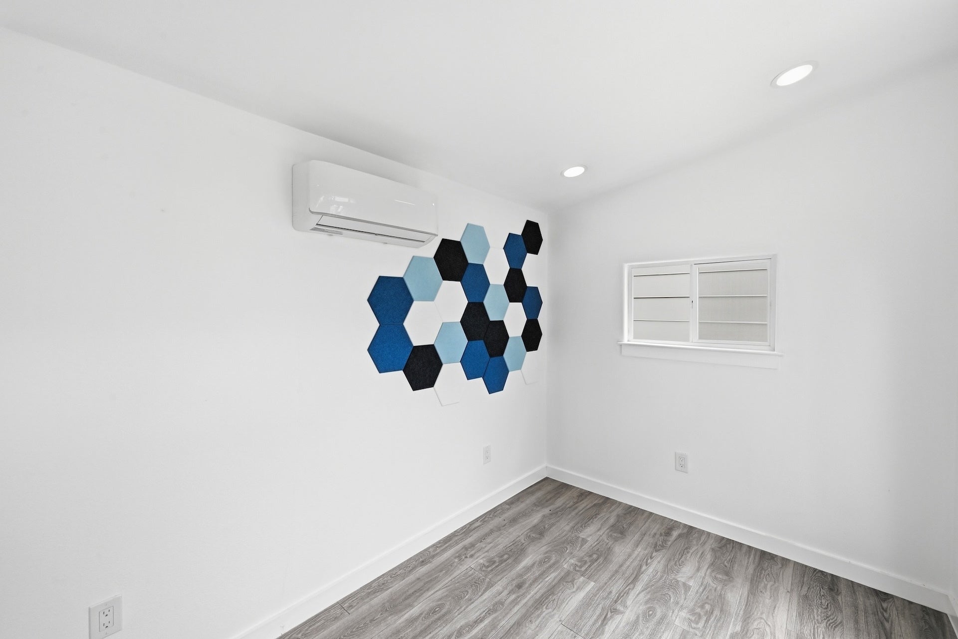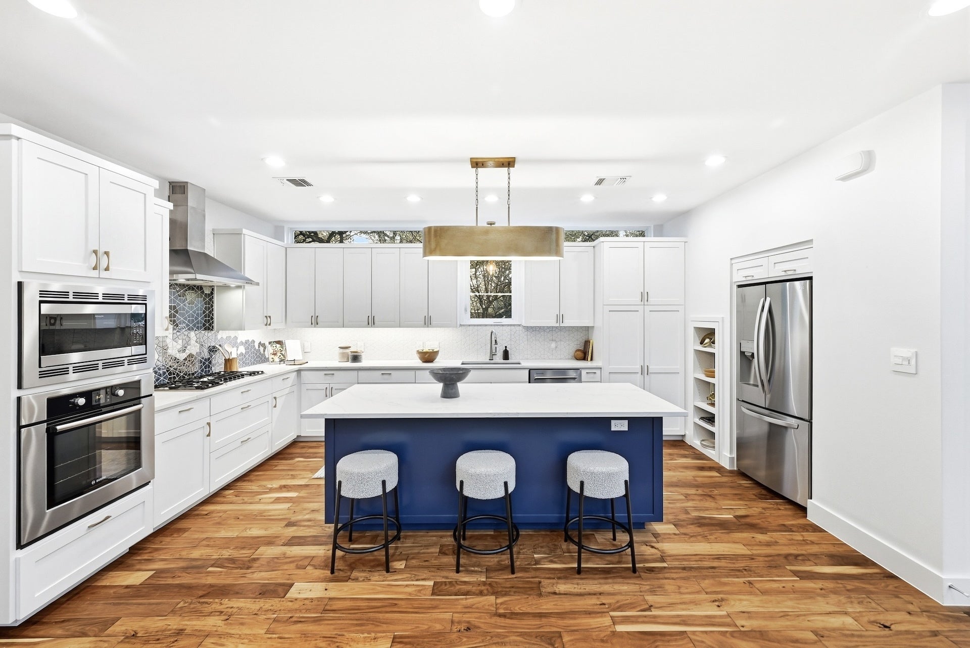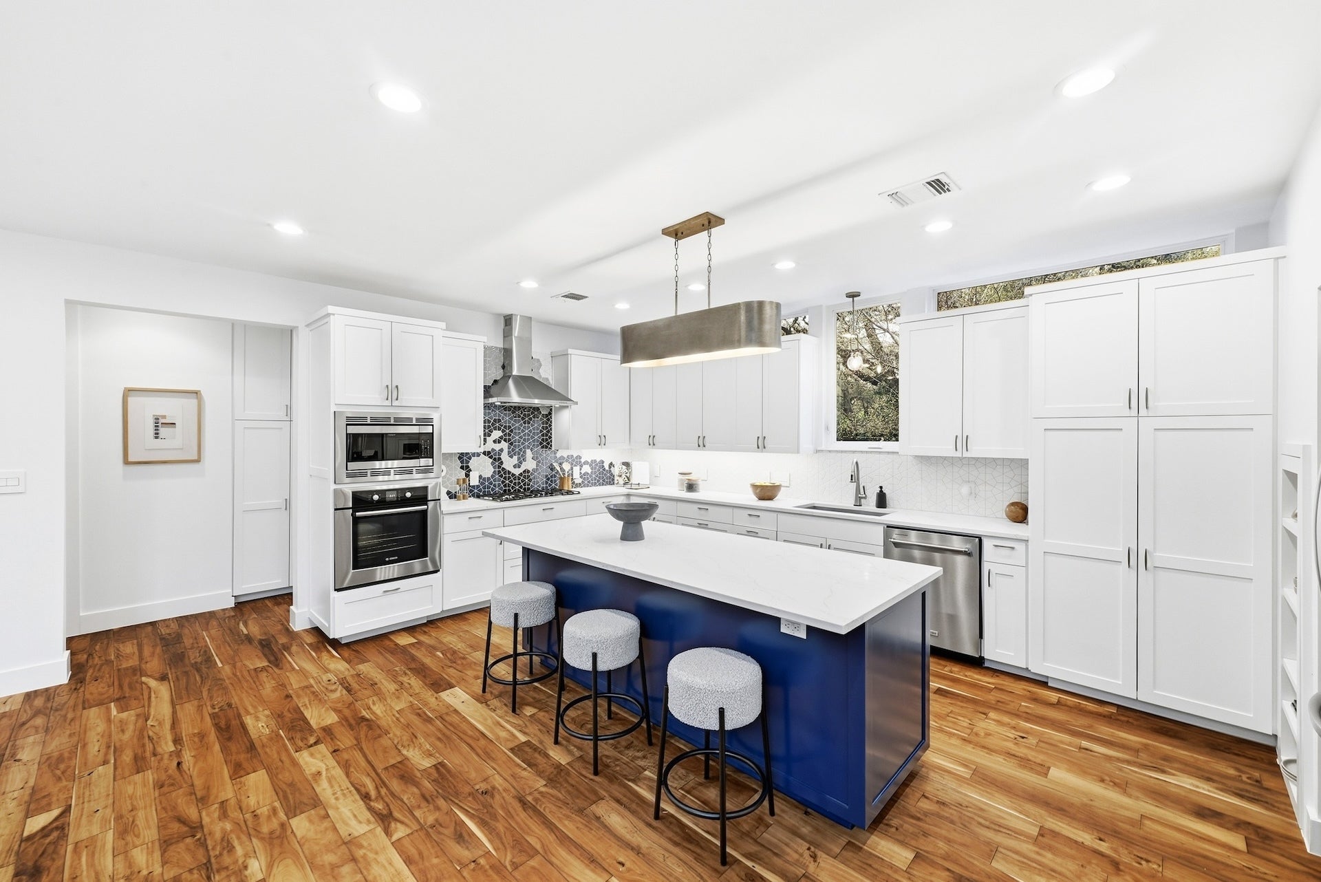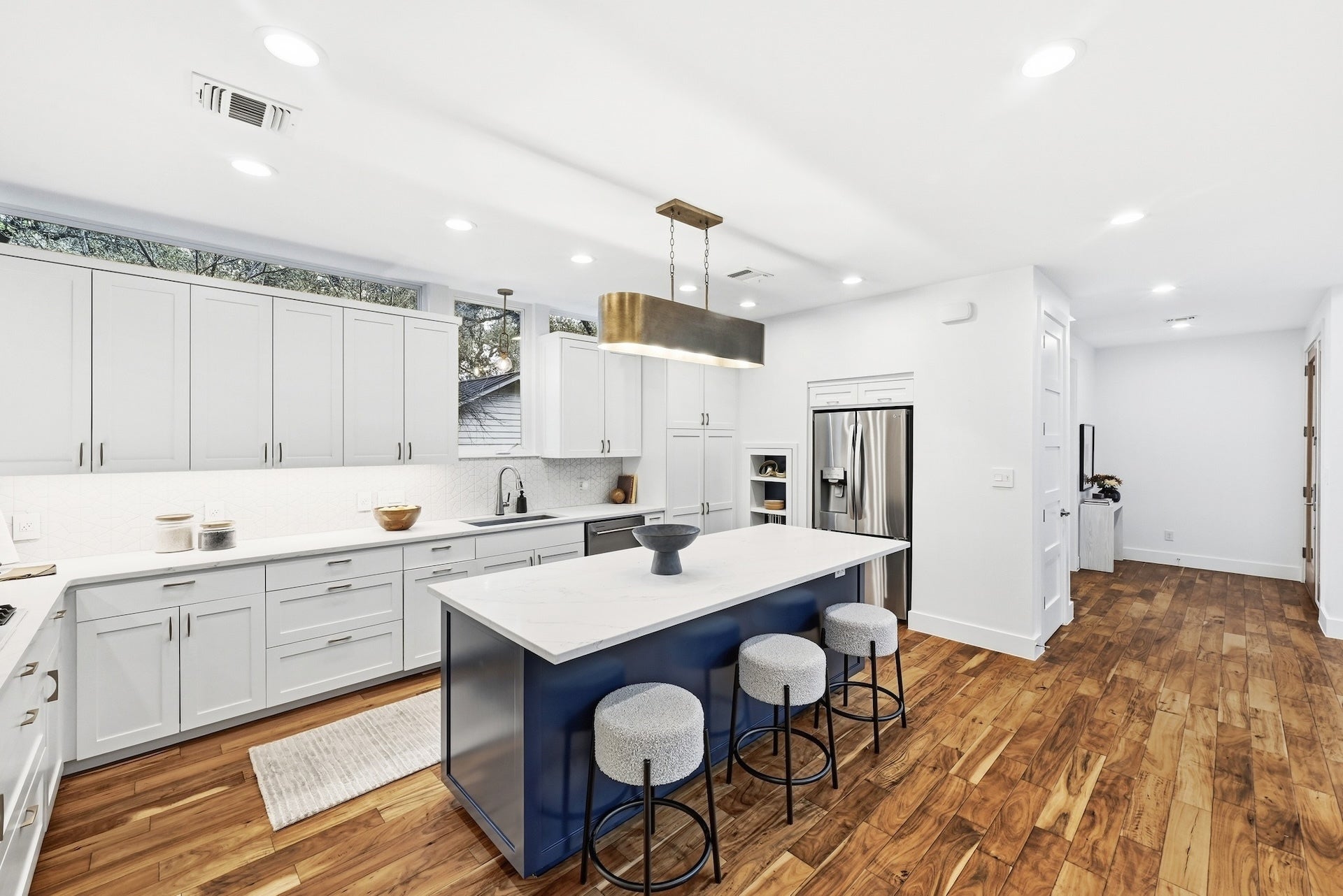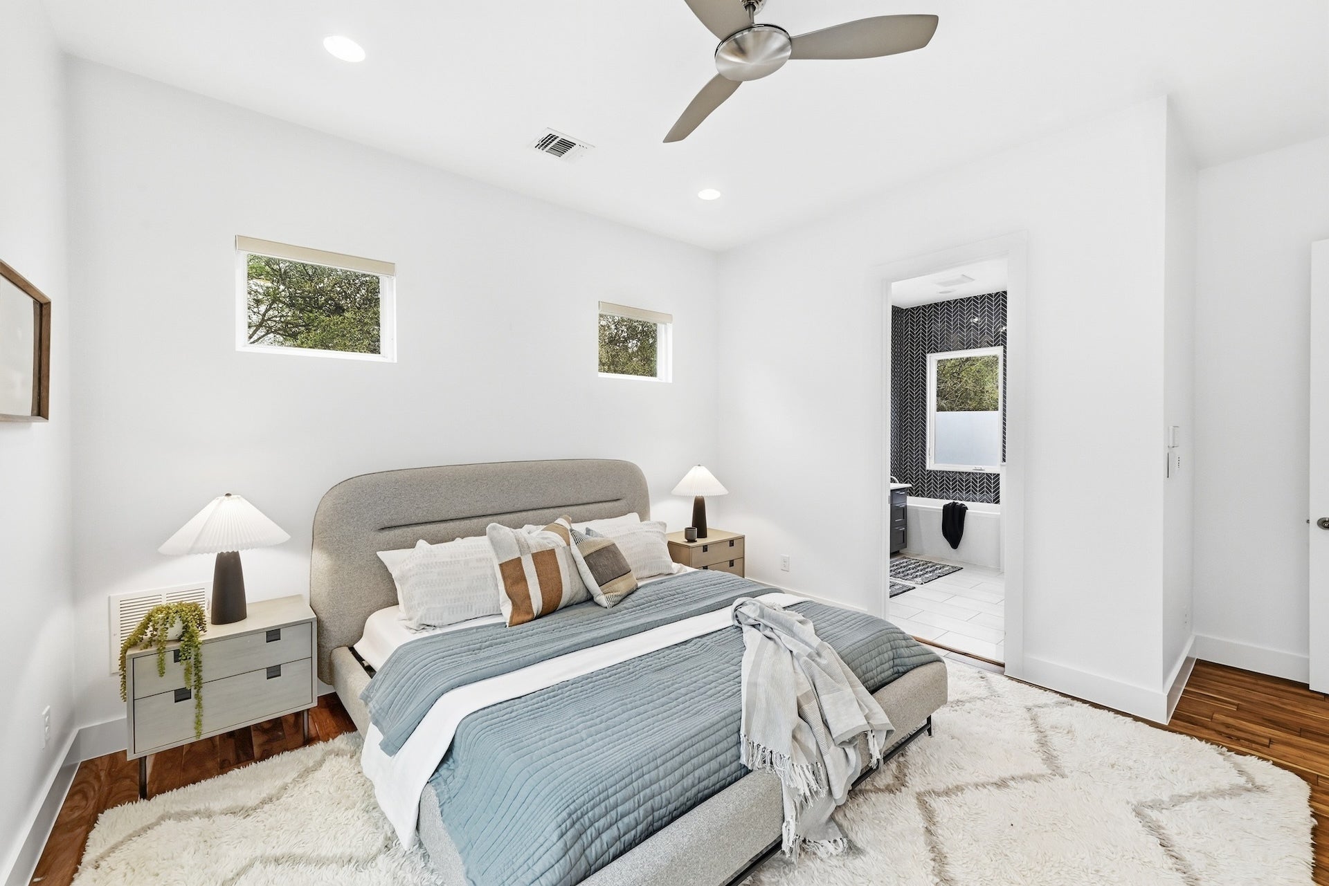 Tucked into a large, private wooded lot in the heart of 78704, The Loft is a 3-bedroom, 2-bath home with soaring ceilings and walls of windows that fill the interior with natural light. Built in 2012 and set on a generous .24-acre lot, the property offers rare privacy while remaining close to the energy of South Austin. Acacia wood floors add warmth throughout the living spaces, and the kitchen has been updated with new countertops and backsplash tile. The primary suite includes a renovated bathroom, a custom closet, and a dramatic loft-style connection to the living space below, with a custom wood-and-metal handrail catwalk that leads to one of the home’s outdoor decks and a luxury outdoor living area. A recently built 20x20 rooftop deck over the garage, designed by architect François Lévy and constructed by R Builders, creates a standout entertaining space. The deck features an industrial-grade sunshade, a built-in roll-top cabinet with a mounted 65” TV, and a granite counter with stainless storage and a new outdoor refrigerator. Behind the house, a custom 12x8 detached office/gym (Tuff Shed, custom designed) provides flexible space for work or fitness. The structure includes French doors, LVP flooring, LED lighting, a modern porch light, mini-split climate control (Mr. Cool), and full insulation and drywall. The property also includes a two-car garage, custom landscaping upgrades, and multiple outdoor living areas. Located just minutes from South Lamar and South First, the home offers easy access to many of the restaurants, shops, and destinations that define 78704 living.