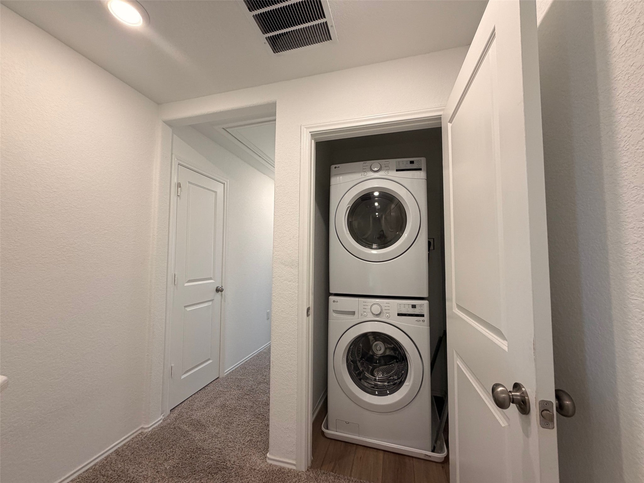 - Washer/Dryer Stacked, Dishwasher, Free-Standing Refrigerator, Gas Range, Microwave, Range Hood, Stainless Steel Appliance(s)