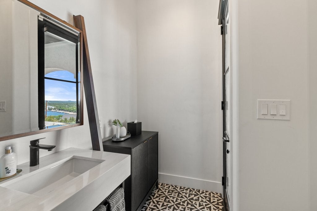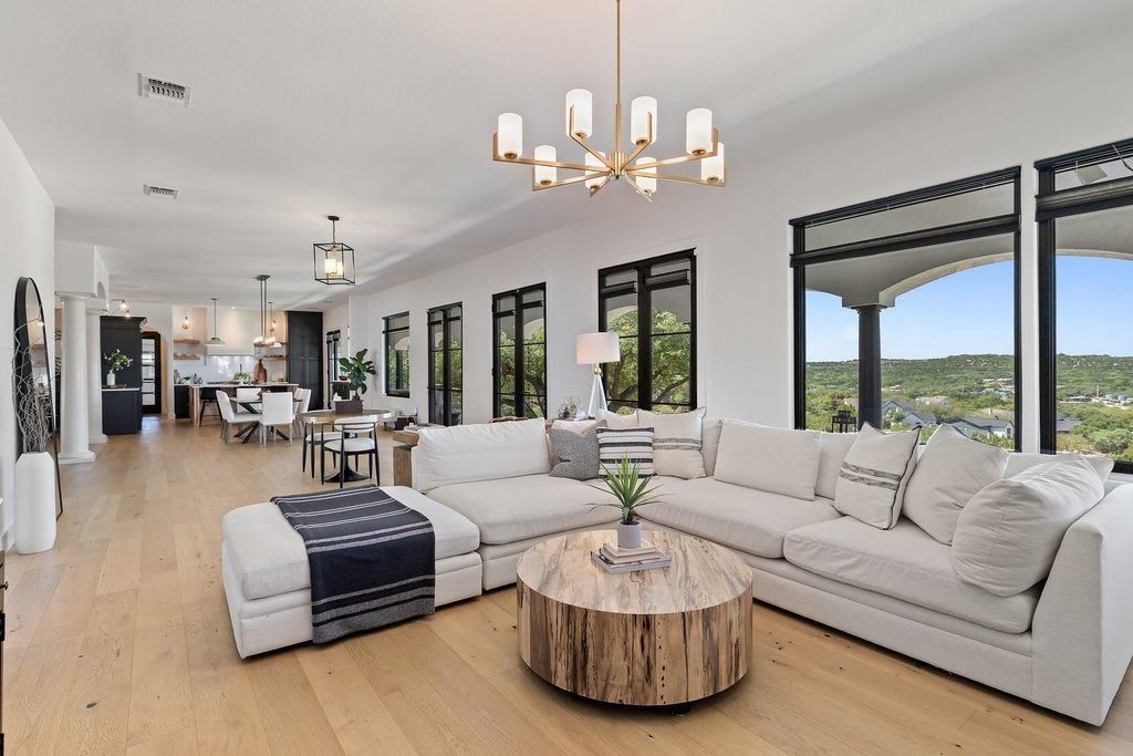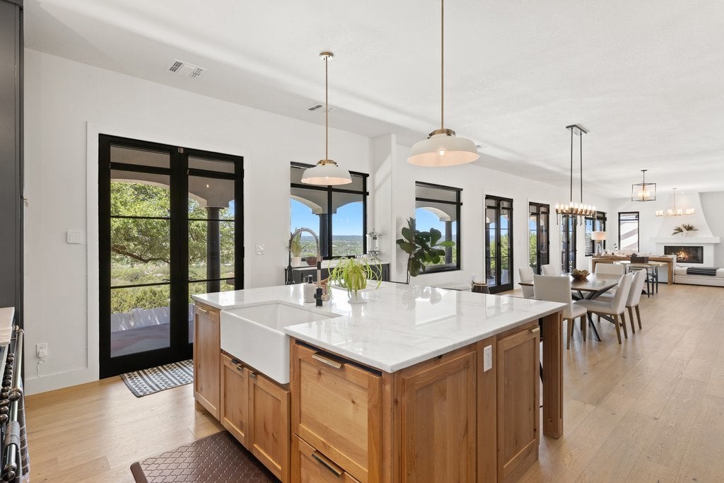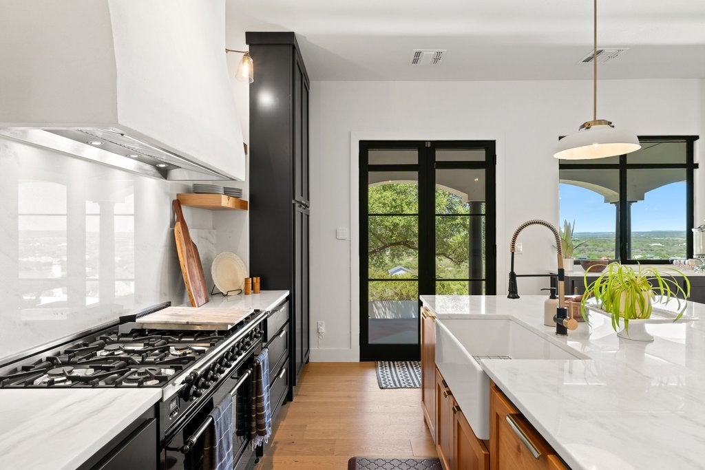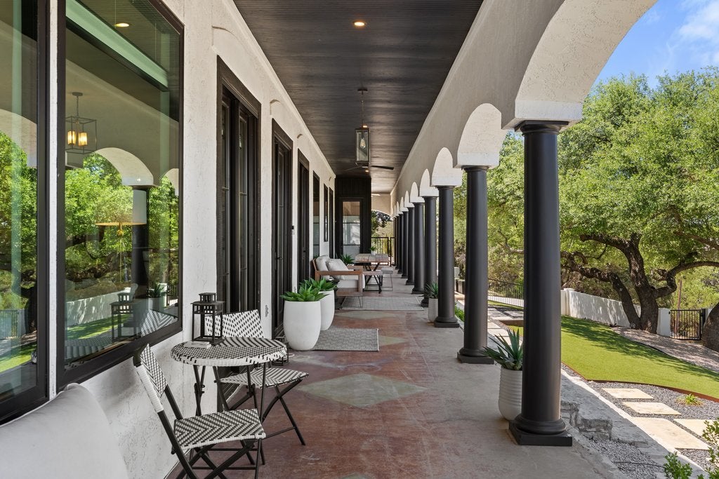 Lake Travis Getaway Estate: Santa Barbara Charm with Guest House & Lake Views. Perched above the rolling Hill Country with sweeping Lake Travis views, this rare double-lot estate embodies elevated indoor-outdoor living. From arrival, it feels less like a home and more like a permanent retreat. A stunning 90-foot veranda stretches across the front, framing panoramic vistas and extending the living space, perfect for sunrise coffee or evenings under painted skies. Outdoor living unfolds from a pergola-shaded lounge and private back porch to a front terrace with year-round hot tub and chiller, plus a fully fenced turf yard offering polished, low-maintenance enjoyment. Inside, the 3,738 sq ft residence is thoughtfully reimagined with wide-plank hardwoods, soaring 10-foot ceilings, expansive windows, and curated designer finishes. The main living area centers on a custom stucco fireplace and flows seamlessly into dining, a chef’s kitchen, and outdoor spaces. The kitchen features Brazilian marble, a large island, Dacor built-in refrigerator, double-drawer dishwasher, 48” professional range, plus a butler’s pantry, mudroom, and powder bath. The private primary suite offers a spa-like bath, in-suite laundry, and attached sunroom or office. Beyond three bedrooms, flexibility abounds with an upstairs bonus room (optional fourth bedroom), dedicated study, and art studio or hobby space. A fully equipped guest suite with private entrance, complete with kitchen, living, laundry, and Gaggenau refrigerator is ideal for multigenerational living or STR income. Extensively rebuilt, upgrades include a new flex room, custom garage storage, walk-in attic, Tesla charger, whole-home filtration, heat pump, dual tankless heaters, and Class 4 impact-resistant roof. Located in Briarcliff near the marina, dining, wineries, golf, pickleball, and Hill Country Galleria, within acclaimed Lake Travis ISD. A front-row seat to breathtaking views, designed to be lived, shared, and enjoyed daily.