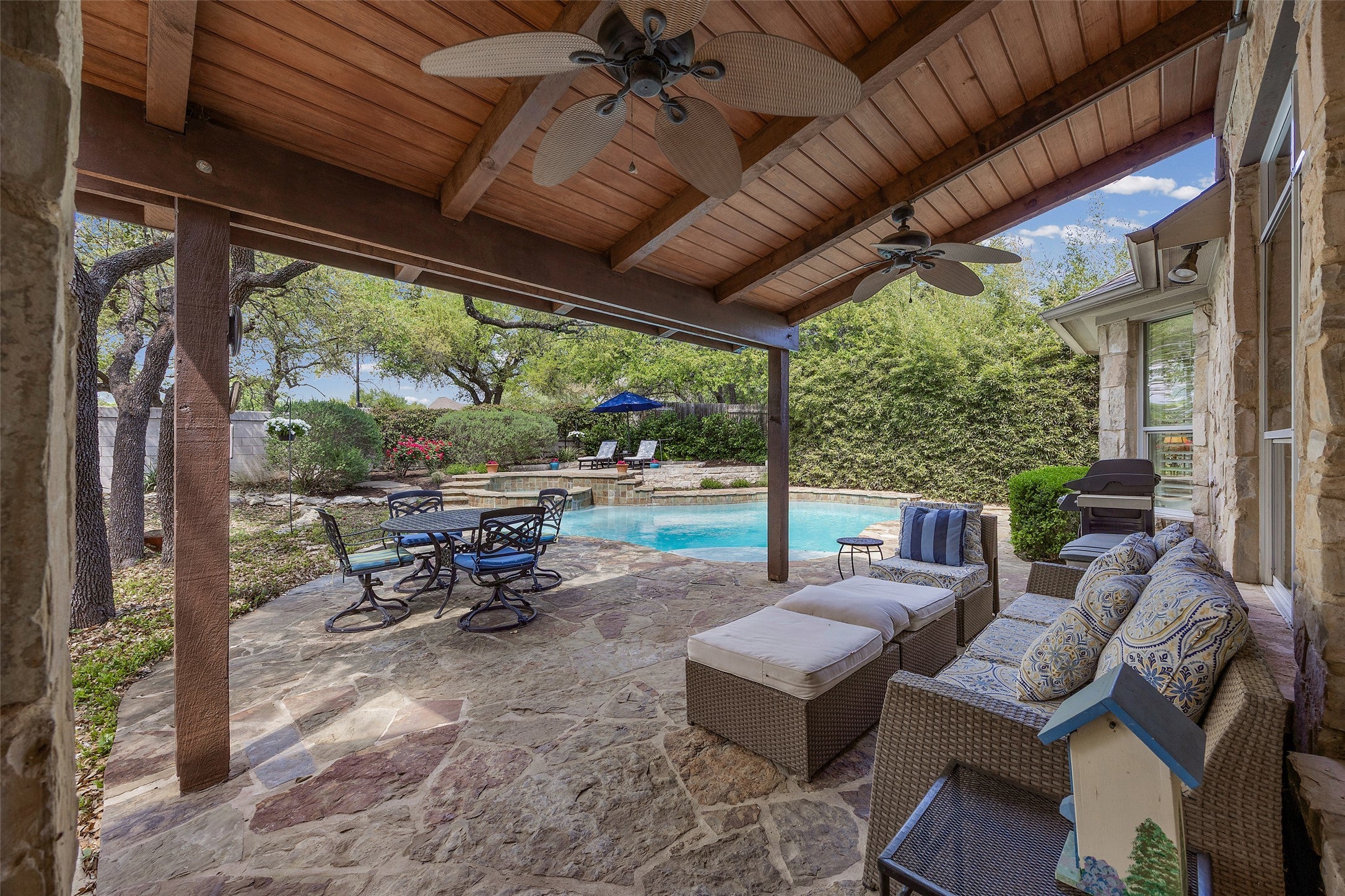 Set on a desirable east-facing lot in Steiner Ranch, this beautifully remodeled Morrison Homes residence pairs timeless curb appeal with an inviting backyard retreat complete with a heated pool, spa, flagstone patio, and mature shade trees. The 4-bedroom, 3.5-bath floor plan offers approximately 3,003 square feet with the primary suite on the main level, a dedicated study, multiple living and dining areas, and a flexible upstairs bedroom with private en suite bath that works beautifully for guests. Numerous builder upgrades were selected when built, including bay windows in the study, kitchen, and a secondary bedroom, extended kitchen cabinetry, added linen storage in the primary bath and near the Jack and Jill bath, and the upgraded en suite secondary bath. Natural light fills the living spaces, while a bright row of windows overlooks the backyard pool and spa. Recent improvements include full interior paint except closets, fresh exterior paint to the stucco, wood trim, and garage door, recently installed owner’s suite bath countertops, Kohler sinks, mirrors, and Moen faucets, downstairs HVAC replaced in June 2025, pool and spa replastered in 2022, new Kohler toilets in 2022, plus both water heaters, Bosch dishwasher, and roof replaced within the last 6 to 7 years. The east-facing front allows for soft morning light, while the backyard offers lovely evening sunset views in sought-after Steiner Ranch. Steiner Ranch is served by Leander ISD schools including Laura Welch Bush Elementary, Canyon Ridge Middle, and Vandegrift High. Steiner Ranch residents also enjoy abundant shopping and dining options within the neighborhood along with access to community amenities including parks, trails, pools, tennis and pickleball courts, and the Lake Club on Lake Austin.
