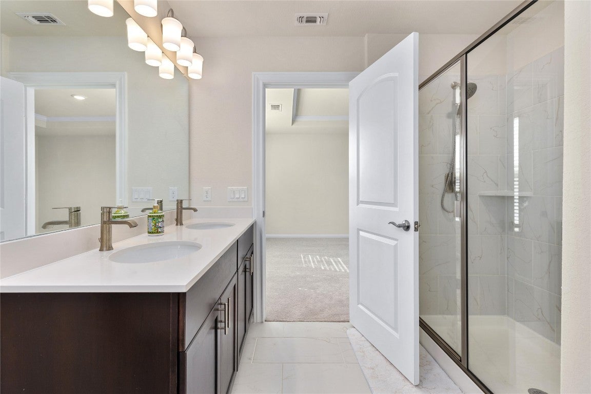 Located in the vibrant community of East Parke, 5513 Durango Pass is a modern, thoughtfully designed home built by Pulte Homes, offering a blend of style, comfort, and functionality. This four-bedroom, three-bathroom residence provides 2,081 sq ft of living space on a 0.13 acre lot, creating plentiful room inside and outside. Upon entering, you are welcomed by a bright, open layout which flows seamlessly from the entryway into the living and dining areas. The chef-inspired kitchen features quartz countertops, a large island, stainless steel appliances, a gas range, and abundant storage, making it a central gathering space for meals and conversation. A main-level bedroom with a full bath including a standing shower provides flexibility for guests, a home office, or multigenerational living. Upstairs, you are met by a spacious, versatile second living room with a tray ceiling, offering room for a media area, play area, or lounge. The primary suite serves as a private retreat with a tray ceiling, large walk-in closet, and dual-vanity ensuite bathroom, while two additional bedrooms, a second full bath, and a conveniently located laundry room complete the upper floor. The thoughtful details throughout the home elevate its design and function. The covered patio and bountiful backyard provide a private retreat, perfect for relaxing evenings, weekend gatherings, or gardening. Durable brick and HardiePlank siding, along with a two-car, front-facing garage, ensuring curb appeal and practicality. East Parke offers the best of Austin living with quick access to Highway 183, providing easy commutes to Downtown Austin, The Domain, UT, Mueller, and top-rated schools, including LASA and Kealing. The neighborhood is welcoming, with green spaces and modern suburban charm that complement the home’s contemporary design. This move-in ready home combines elegance, flexible living, and a prime location, delivering excellent opportunities for families in East Austin.