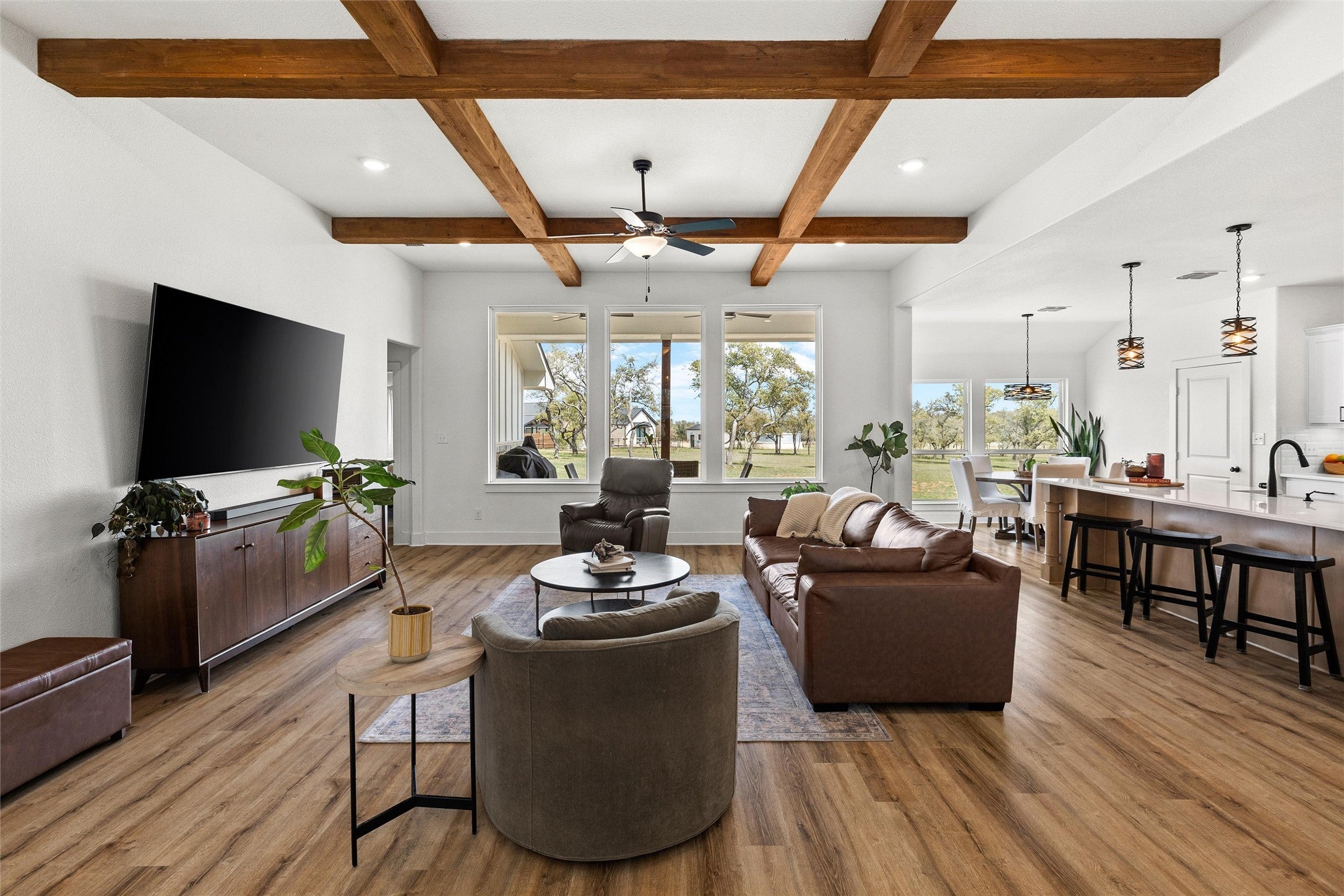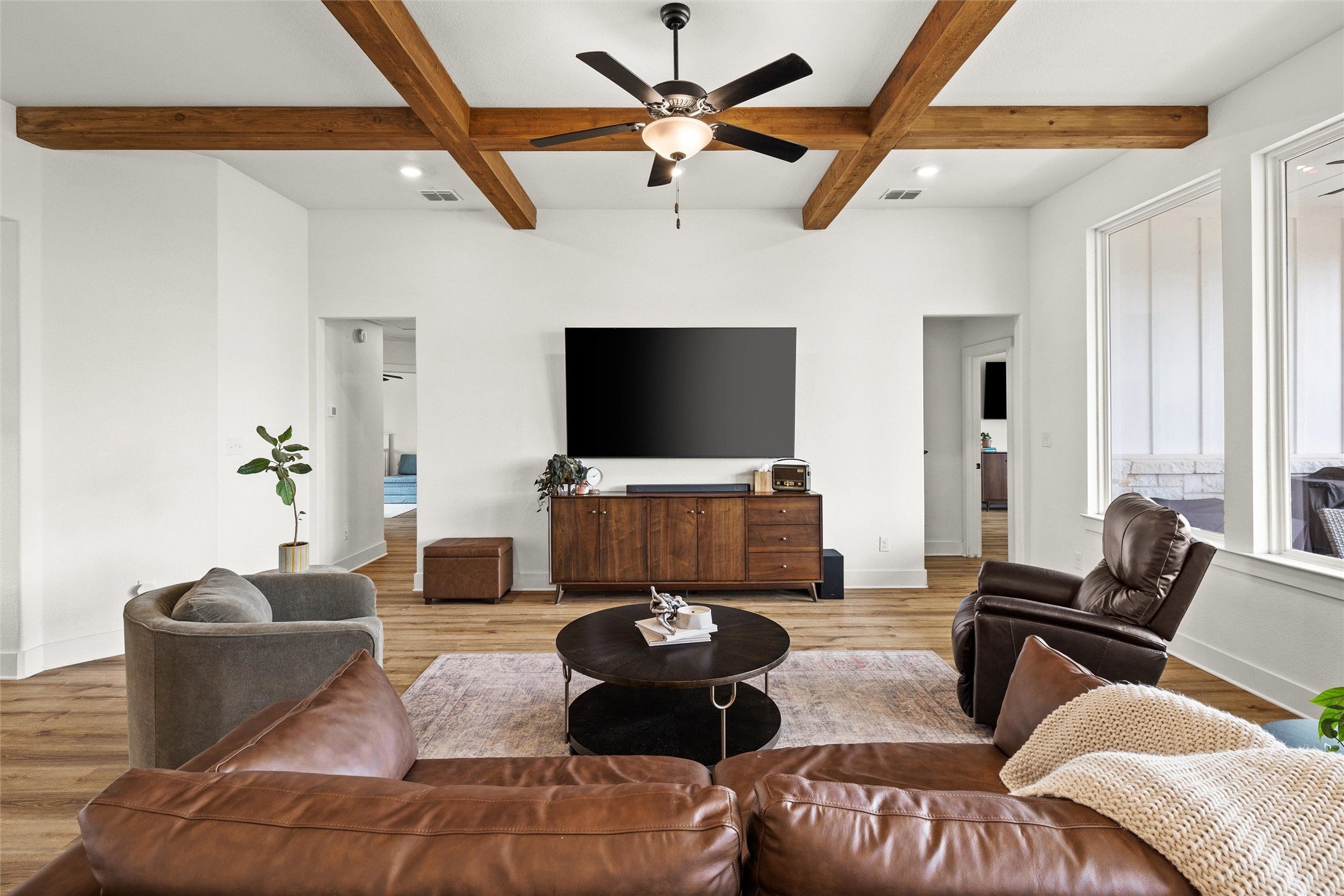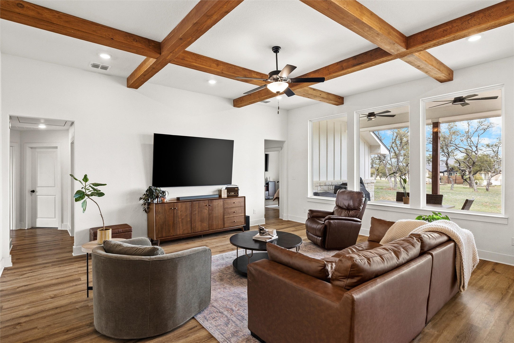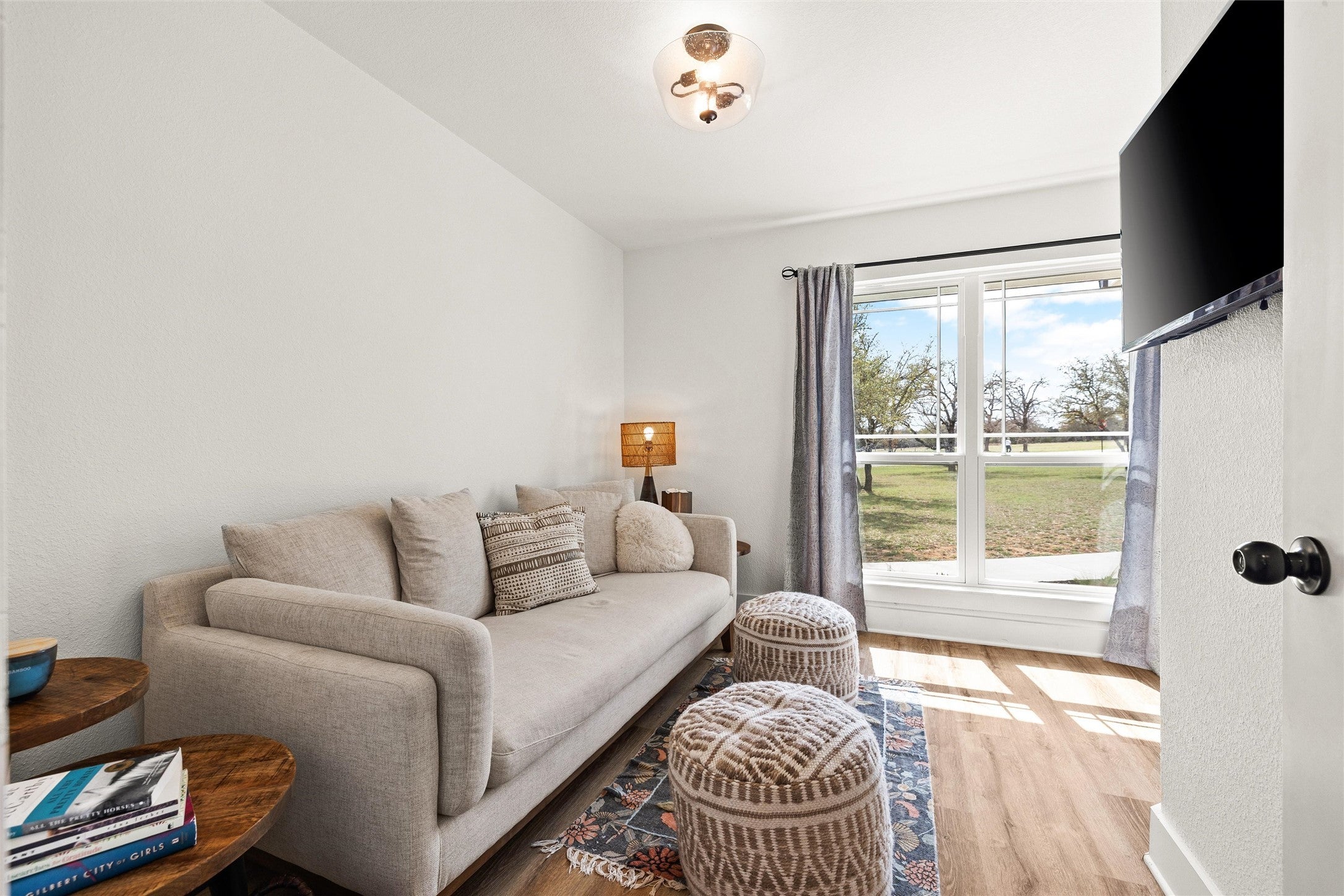 Set within the private gated community of Trinity Oaks Preserve in Round Mountain known for its large estate lots and beautifully manicured streets, 345 Morning Dew Drive offers a rare opportunity to own a newer luxury home in one of the Hill Country’s most peaceful and scenic settings. Built in 2023, this thoughtfully designed single story residence blends modern comfort with relaxed Hill Country living, all surrounded by wide-open skies and natural beauty. Inside, the home features five spacious bedrooms and four full bathrooms, with an open, flowing layout designed for both everyday living and effortless entertaining. The kitchen opens seamlessly to the main living area, creating a welcoming central gathering space with generous room for family and guests. Luxury vinyl plank flooring runs throughout the home, providing both durability and style while tying the spaces together with a clean, contemporary feel. One of the standout features of this property is the attached guest quarters, offering a private living area, large bedroom, and full bath—perfect for extended family, visiting guests, or a comfortable multi-generational living arrangement. The primary suite is generously sized, offering a quiet retreat, while the secondary bedrooms are equally spacious and thoughtfully positioned. Outdoor living is just as inviting, with both front and back porches that capture the charm of Hill Country life—ideal for morning coffee, evening sunsets, and enjoying the peaceful surroundings. With its combination of newer construction, lower taxes, privacy, large homesites, and quality finishes, 345 Morning Dew Drive represents a rare luxury offering in Round Mountain—where space, comfort, and a slower pace of life come together beautifully.
