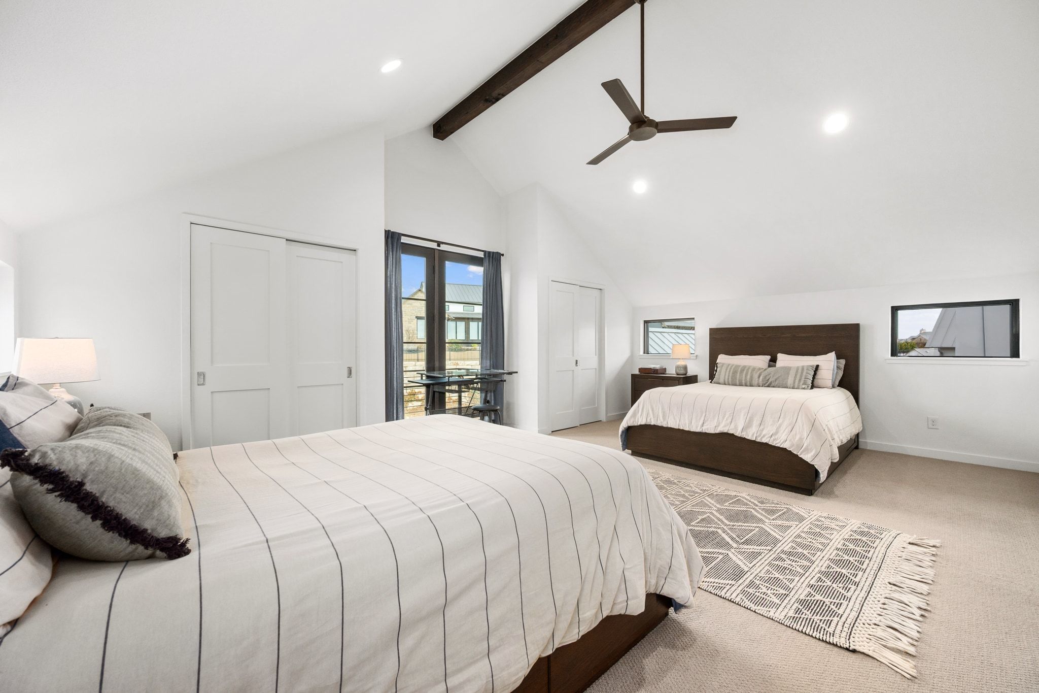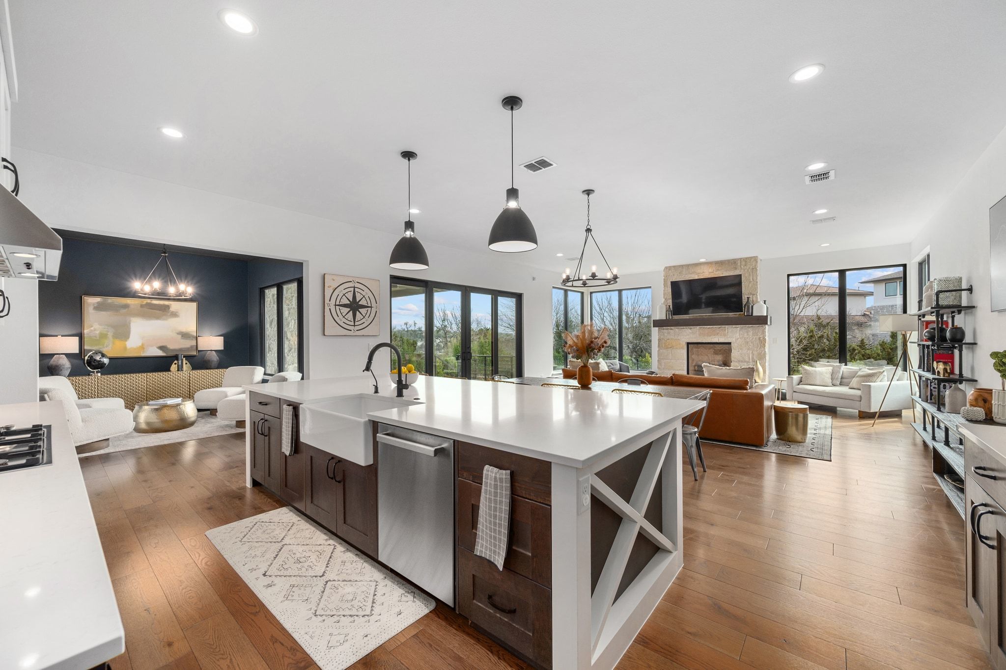 Experience refined living in this Legacy Builders Sycamore floor plan, positioned on .527-acre lot within the gated lakefront enclave of Westside Landing at Rough Hollow. This residence offers 4 bedrooms, 4.5 baths, 3 expansive living areas & soaring ceilings. Andersen windows & doors flood the home with natural light while framing views of the lush backyard. The great room is anchored by a floor-to-ceiling stone fireplace, wide-plank hardwood flooring, and sliding glass doors create seamless indoor-outdoor flow. The chef’s kitchen is a true statement space, w/custom soft-close cabinetry, under-cabinet lighting, oversized quartz island & professional-grade Bertazzoni appliances- including five-burner gas range & double ovens. Designer tile backsplashes, curated lighting and a farmhouse sink complete the space. A walk-in pantry ensures both beauty & function. The private primary suite features beamed ceilings & tranquil backyard views. The spa-inspired bath showcases an oversized walk-in shower with frameless glass enclosure, dual vanities topped in quartz, & generous walk-in closet. This exceptional floorplan offers a private, detached casita with ensuite bath & walk-in closet. Secondary bedrooms are spacious with each offering private ensuite baths. A secondary upstairs living area provides flexible space for a media room, game room, or private lounge — enhancing the home’s 3 distinct living spaces. Outdoors, the property transforms into a private resort. The expansive half-acre lot offers exceptional privacy, highlighted by a sparkling pool, covered patio, built-in outdoor kitchen, & gas fire pit — perfectly designed for year-round gatherings. Located in the heart of Rough Hollow, residents enjoy world-class amenities including lake access, resort-style pools, fitness center, tennis & pickleball courts, hiking trails & private marina. Westside Landing has private lake access to the Kayak Club via a private trail. HOA maintains all landscaping