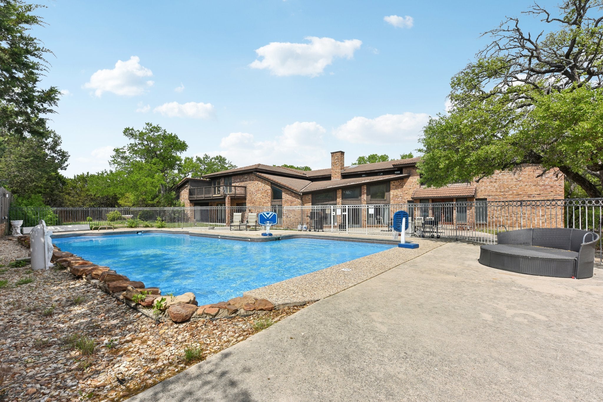 Nestled on five private, tree-covered acres at the end of a quiet cul-de-sac, this extraordinary Copperas Cove estate offers the ultimate blend of luxury, space, and versatility. Accessed by a private road with a gated entrance, the property welcomes you with a circular drive, expansive carport, and a true sense of arrival. Spanning approximately 7,800 square feet, the main residence features 5 spacious bedrooms and 4.5 bathrooms, thoughtfully designed for both everyday living and large-scale entertaining. Multiple living and entertainment areas, a generous dining room, and even an indoor basketball court create a one-of-a-kind lifestyle experience. All main living spaces open seamlessly to a resort-style outdoor setting, complete with a large fenced pool and beautiful decking, perfect for hosting or relaxing in total privacy. A separate 1,000-square-foot guest home with a full kitchen and bath adds incredible flexibility, ideal for multigenerational living, guests, or rental income. Being sold fully furnished, this property is truly move-in ready. It's currently operating as a successful short-term rental, offering immediate income potential or the opportunity to create your own private family compound. Priced to sell. A rare opportunity you don’t want to miss.