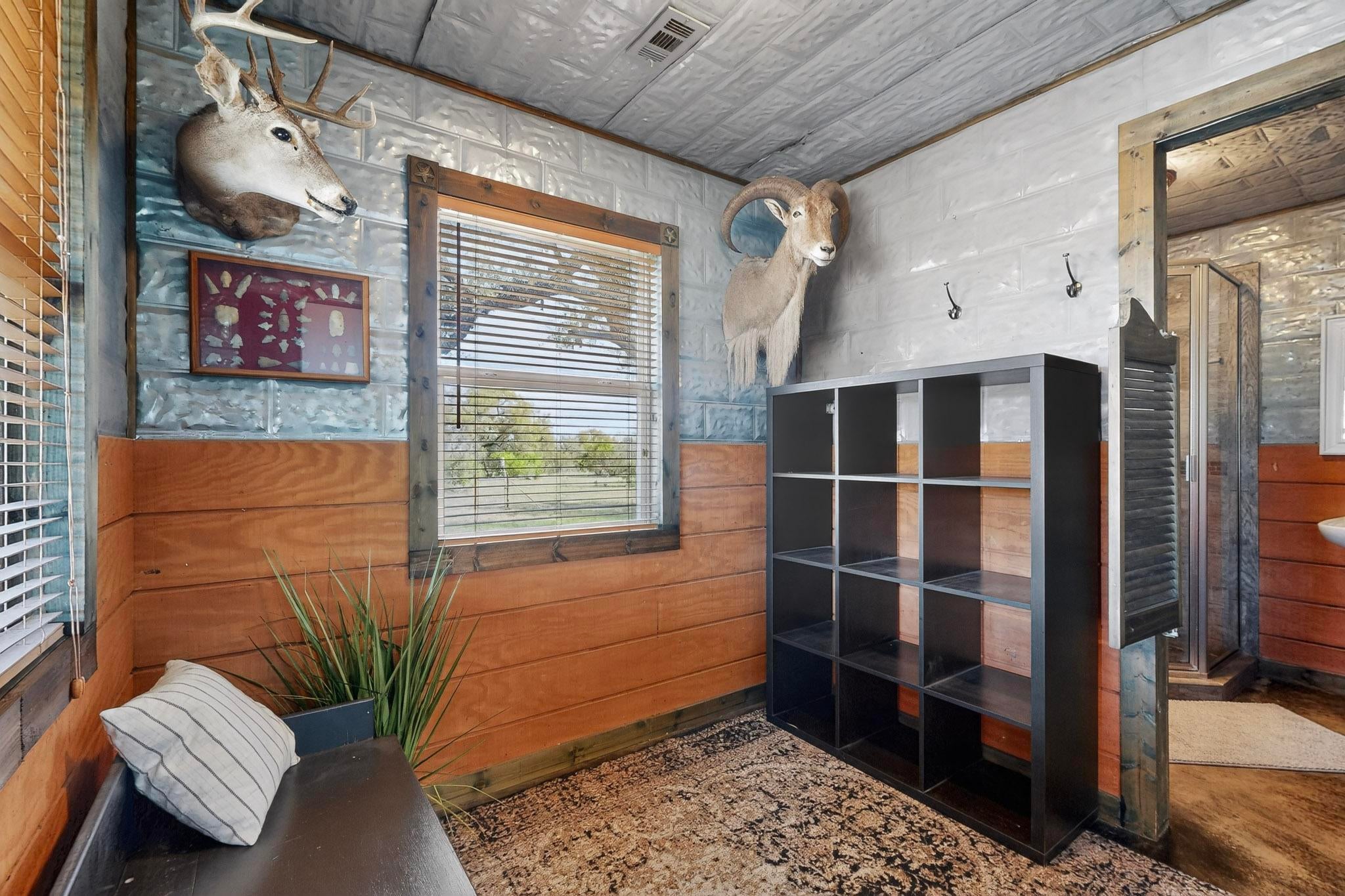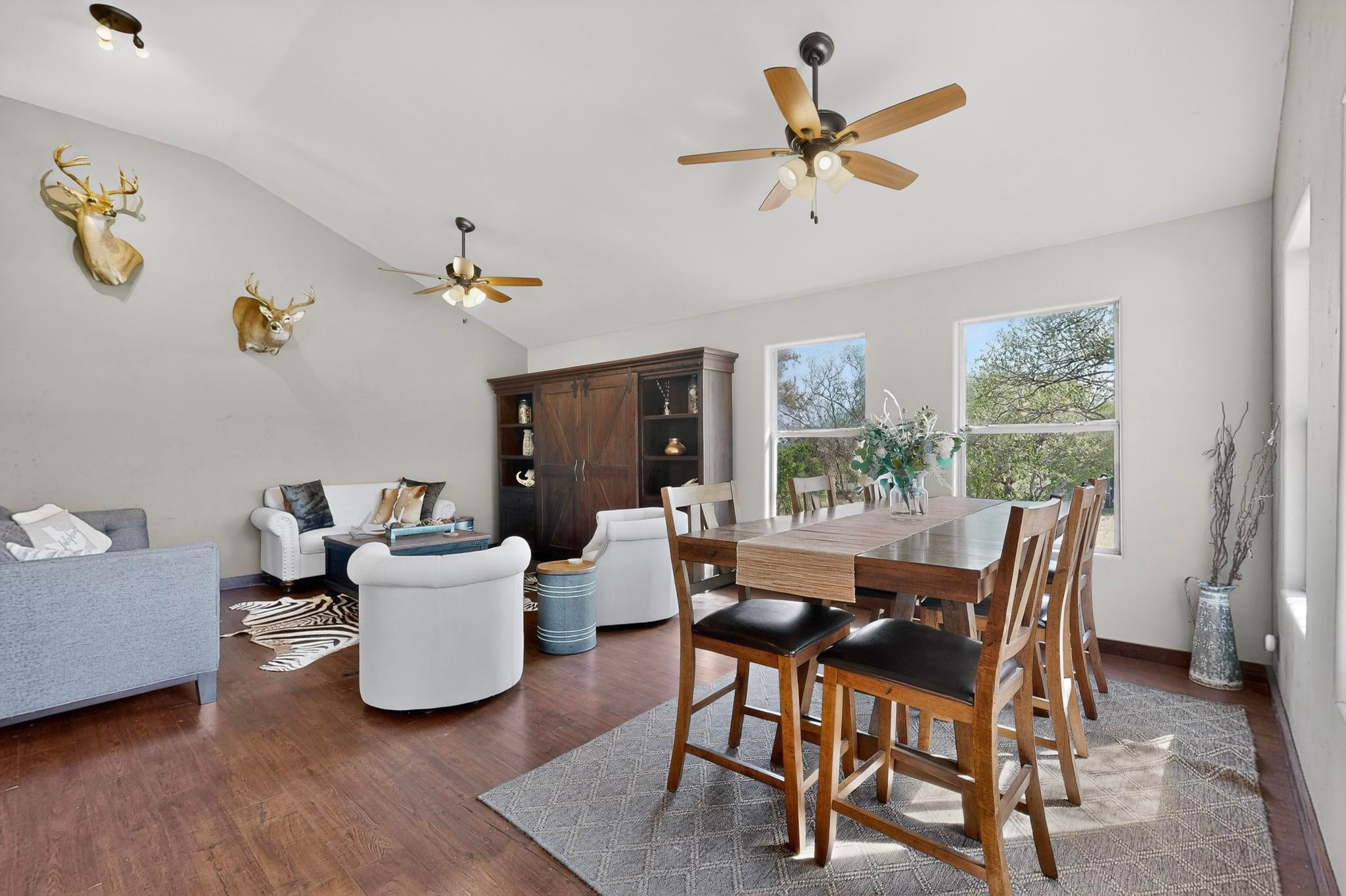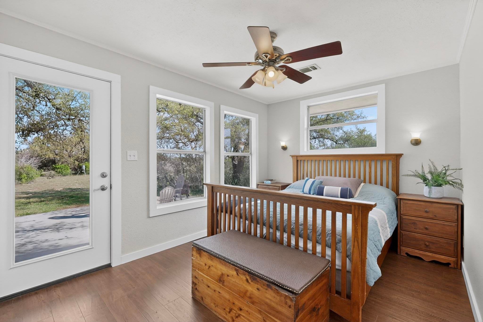 Set in the Texas countryside, the land offers open meadows, mature oaks, and natural privacy. It’s an ideal backdrop for a custom home, with space to design around the views, the trees, and the way you want to live. The existing home is a great starting point and works well as a guest house, weekend retreat, or a comfortable place to enjoy while your vision comes to life. Inside, you’ll find hardwood floors, vaulted ceilings, and an open living, dining, and kitchen area filled with natural light. The primary bedroom and two full baths are on the main level, with a loft bedroom above accessed by a spiral staircase. Outdoor living feels easy here. A covered patio with wood beams, an outdoor kitchen, built-in gas grill, sink, and bar is ideal for gathering. In contrast, a second patio tucked beneath the shade of towering oaks offers a quieter place to relax and take in the surroundings. The property is well-equipped with a detached two-car garage that includes an office and workspace, a separate hobby or art studio, two fenced dog runs, and covered parking for an RV or boat, offering flexibility for hobbies, storage, or weekend projects. An agricultural exemption will be in place this year, making the property eligible for a wildlife exemption filing in 2027.