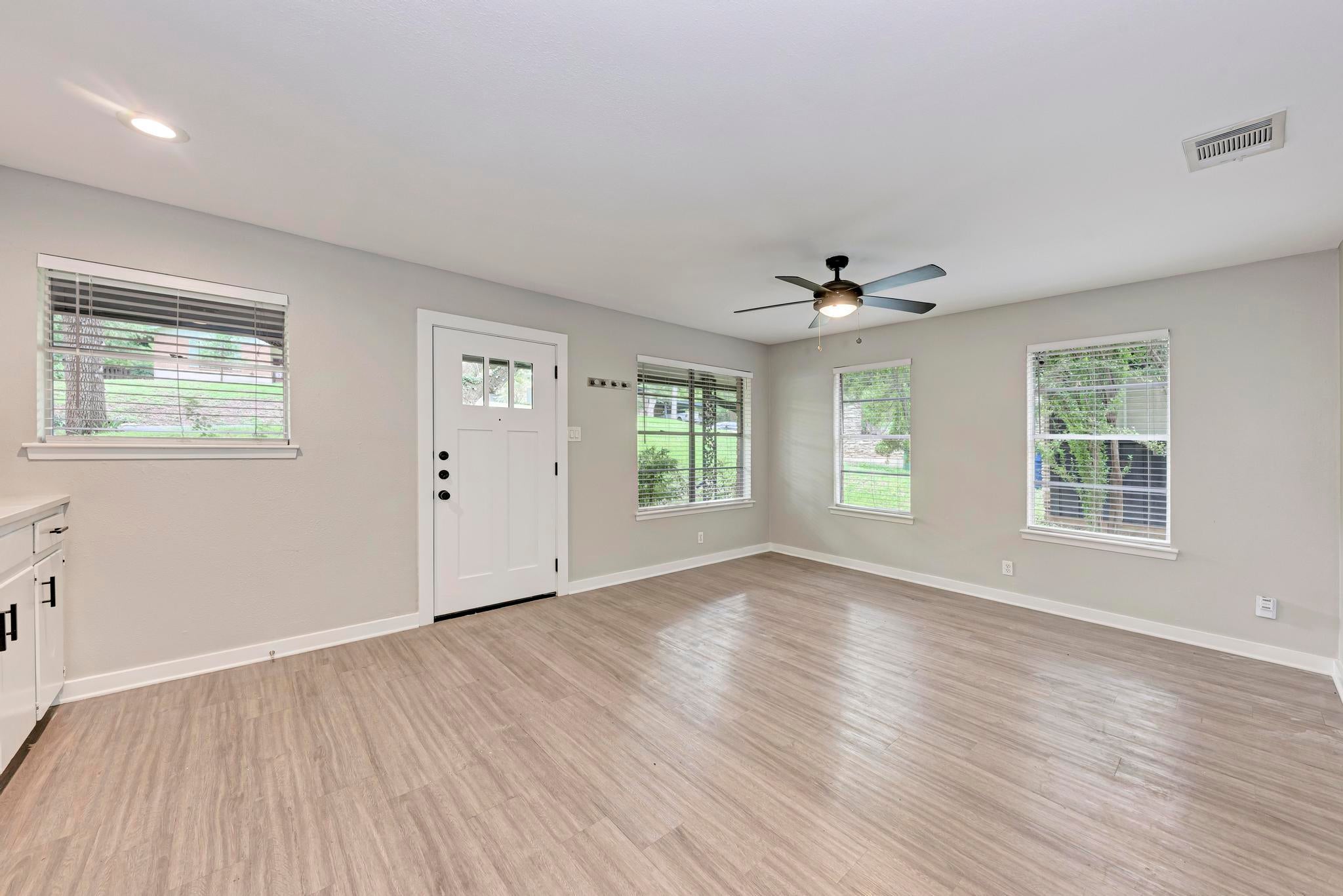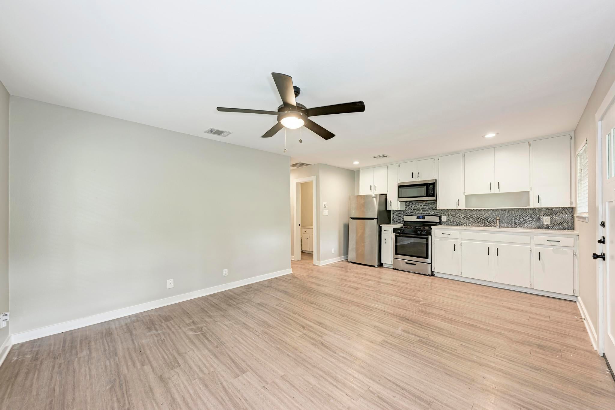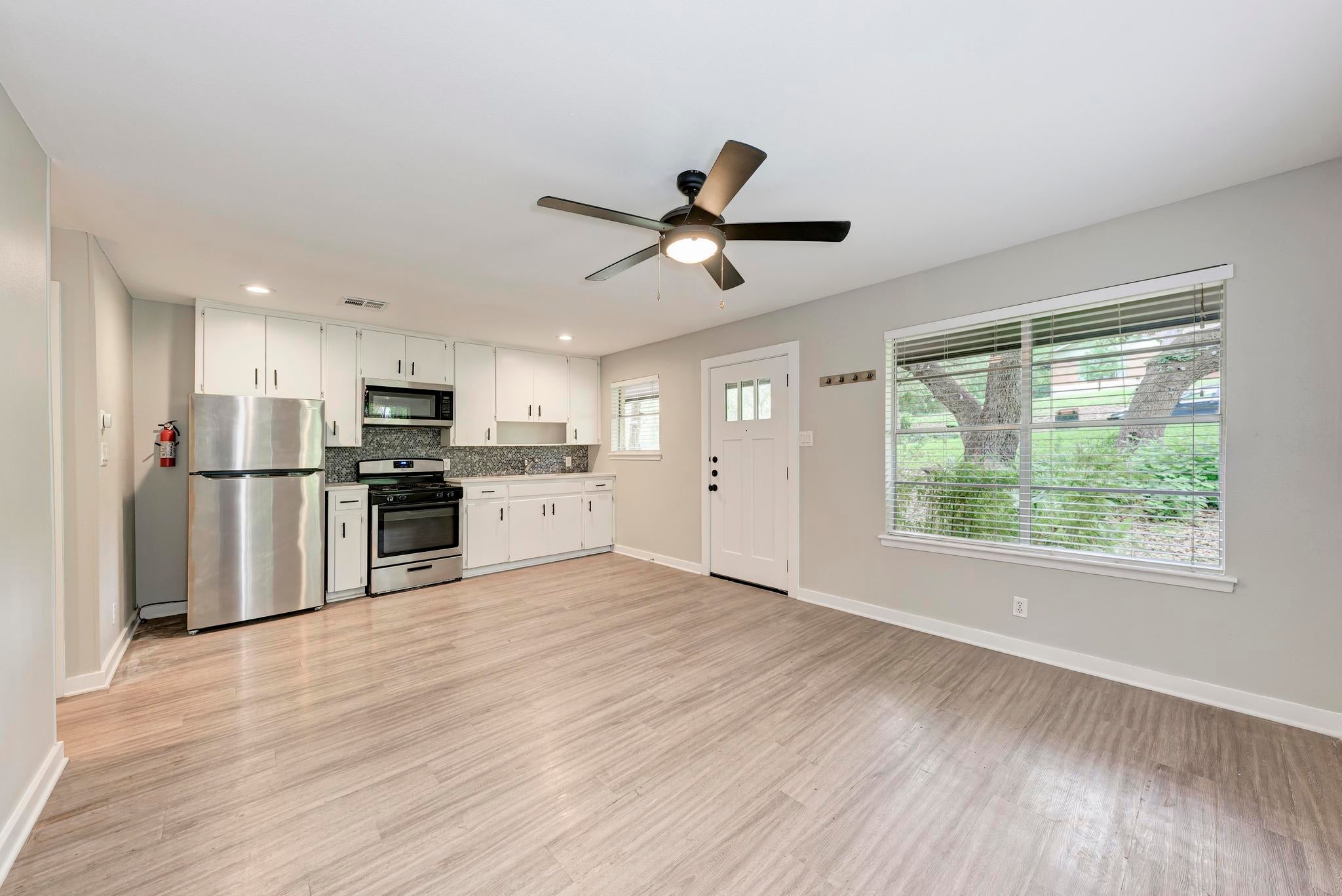 Welcome to this charming updated 1 bed/1 bath duplex located at 1612 Elmhurst Drive - Unit A, in the heart of Austin, TX. This updated home boasts a cozy 576 square feet of living space and is ideally situated less than 2 miles from downtown Austin, right next to the greenbelt - which can be enjoyed from a private, newly fenced-in backyard. (Fence installed Feb. 2024) Step inside to discover a thoughtfully designed floor plan featuring durable yet beautiful laminate flooring, wainscoting in the living room, and an abundance of windows that flood the space with natural light. The kitchen comes equipped with a refrigerator and microwave; there's also a stacked washer and dryer on the property for added convenience. Central air and heat ensure year-round comfort, and yard maintenance is included, taking the hassle out of outdoor upkeep. With easy access to I-35 and just 7 miles from the Airport, this home offers both convenience and serenity. Take advantage of the nearby South Congress and East Austin restaurants, perfect for indulging in local cuisine, and explore the nearby Ladybird Lake trails, ideal for hiking and biking adventures. Don't miss out on the opportunity to lease this delight!