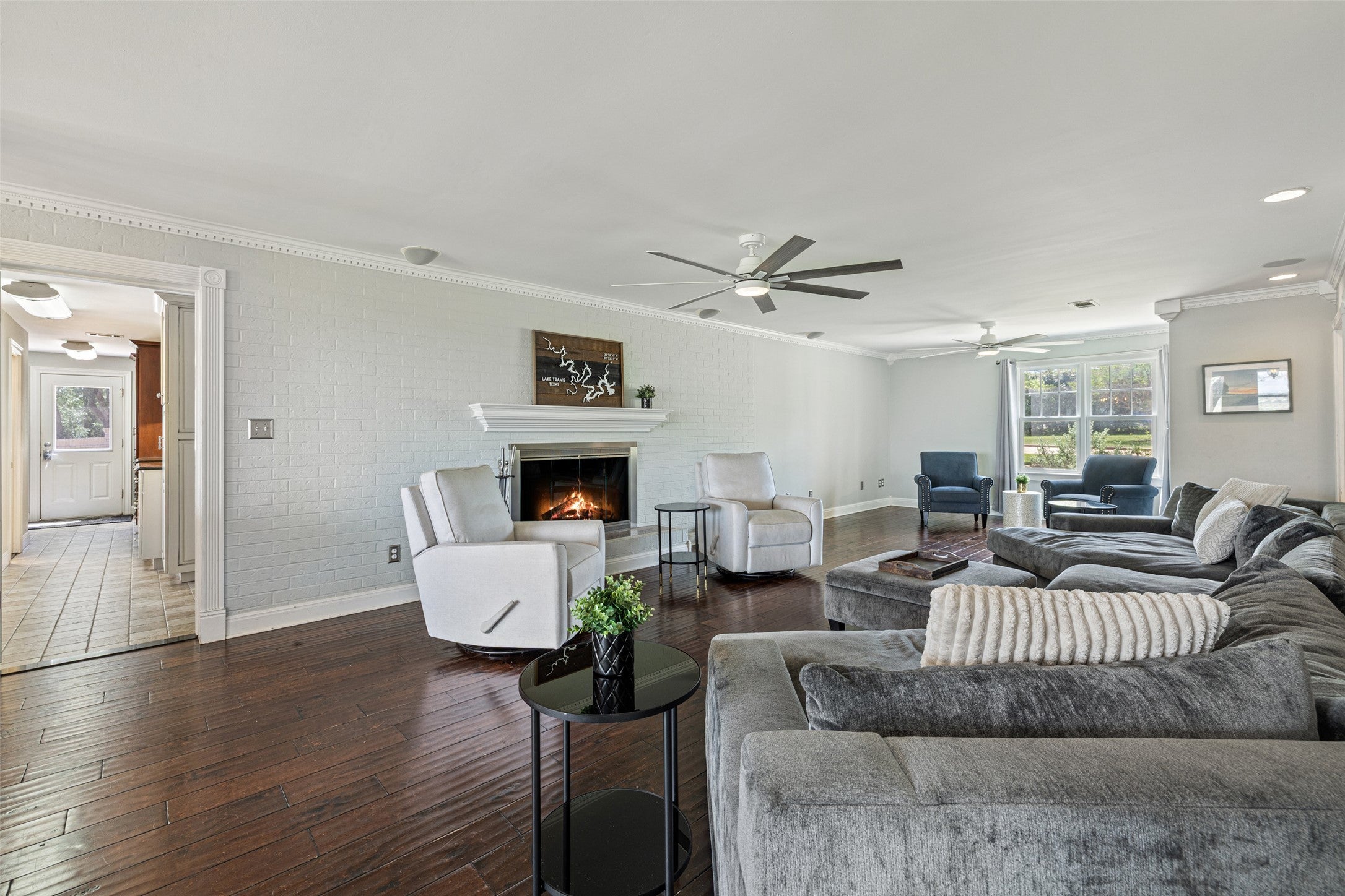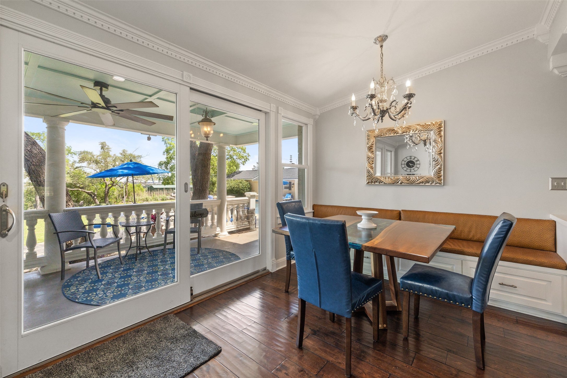 - Family Room, Living Room, Outside, Raised Hearth, Stone, Dining Room, Glass Doors, Masonry