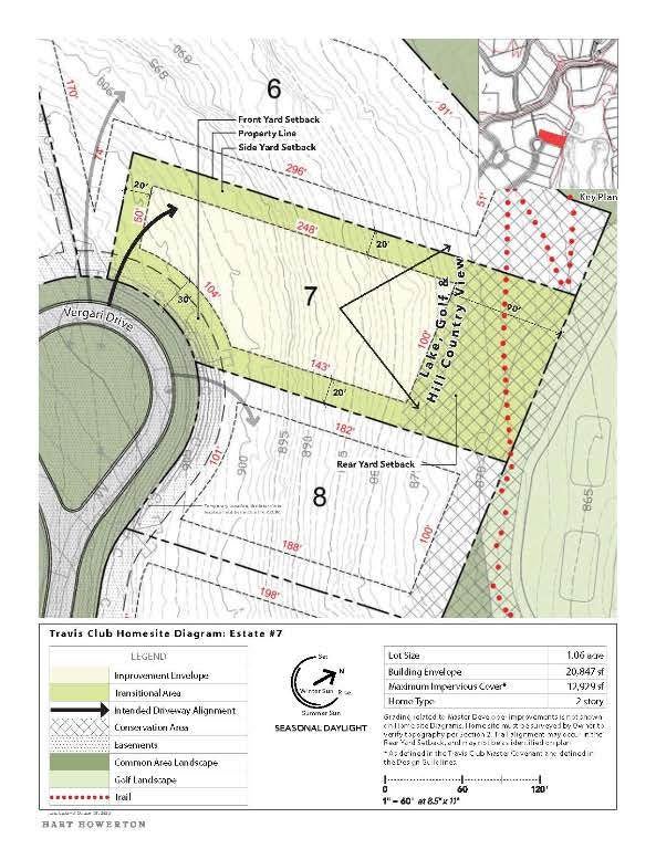 Located in the heart of Phase 1 at Travis Club, Homesite #7 offers sweeping views of the 17th hole and the surrounding Texas Hill Country. Positioned along a gentle curve of Vergari Drive, the site orientation captures ideal morning and afternoon light. With ample flexibility and a well defined driveway approach, this homesite provides an exceptional opportunity to design a private retreat in one of the most scenic locations within Travis Club. Travis Club is a 1500-acre private, family centric luxury community nestled in the rolling hills and stately oaks along the shores of Lake Travis. The community will feature an 18-hole golf course, designed by Beau Welling, 10,000 feet of lake frontage, and over 30 miles of private hiking and biking trails. Future amenities will include a Clubhouse campus featuring the Golf House, a multi-functional facility, which will include a pro shop, bar and grille, indoor/outdoor dining, locker rooms, and hitting bays/simulator. The Peninsula Club will offer a range of family activities, from pools to racquet sports. Travis Club will also have a state of the art Fitness and Wellness Center as well as a Boat Club and Marina with private slips. Membership to Travis Club is mandatory upon application review and approval, and a property owner must join at a minimum as a Sport and Social Member of the Club with the option to upgrade to a Golf Membership. Membership offers access to dining, fitness, recreational amenities and/or golf. If accepted, owners must maintain an active membership in the Club at all times in accordance with the Membership Plan and governing documents.
