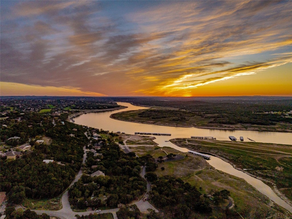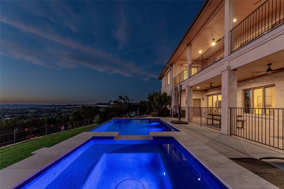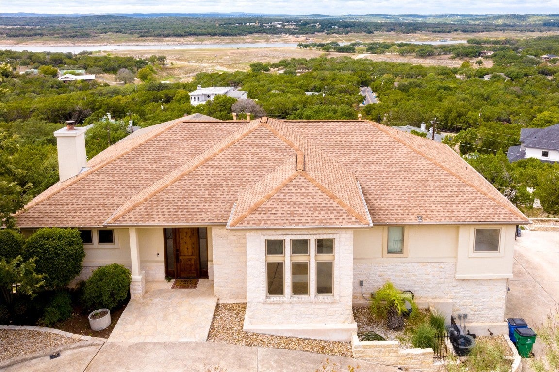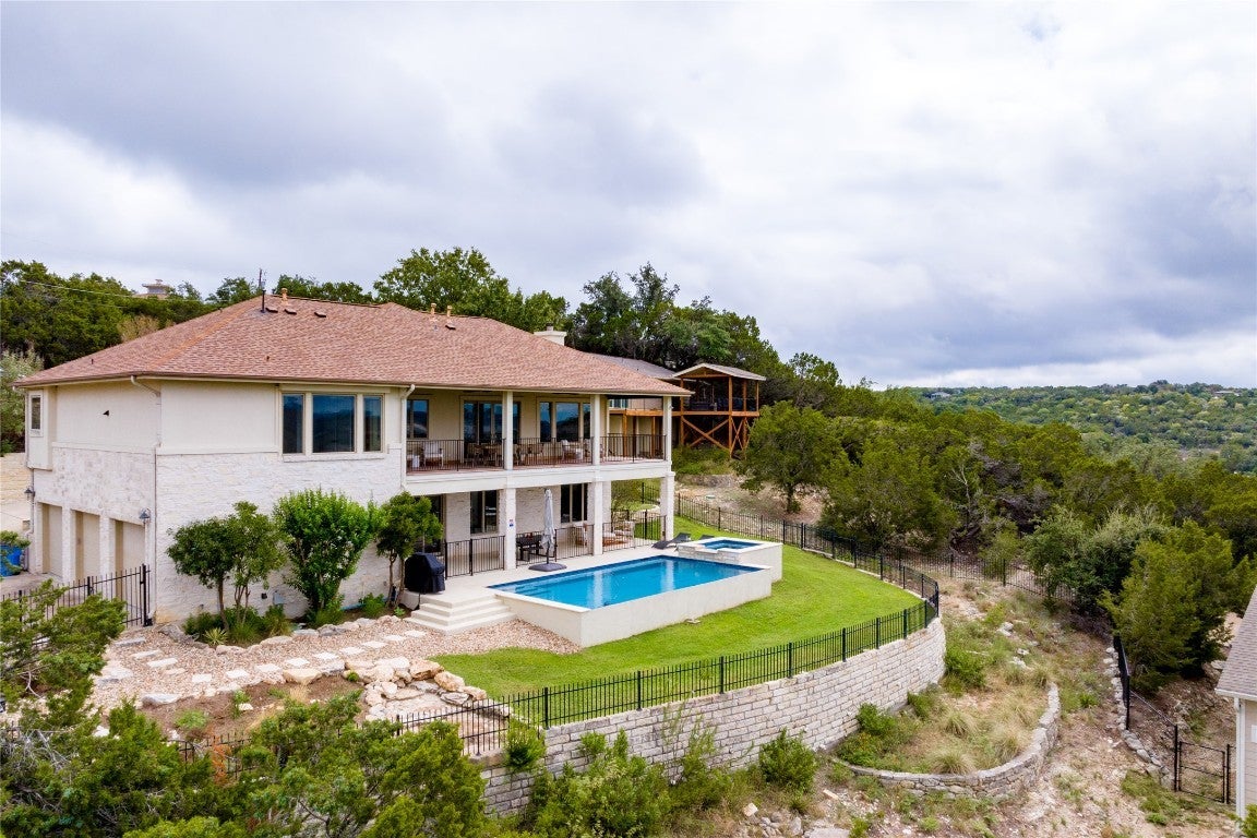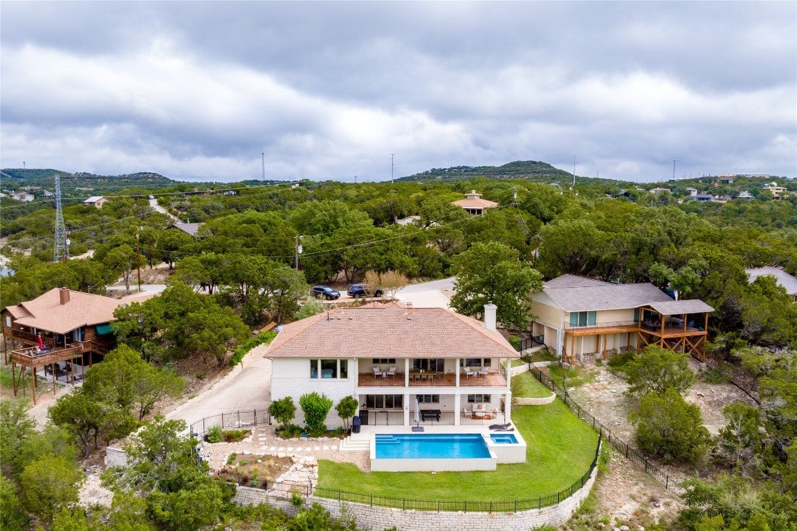 Step into your dream home located on just under 1/2 acre in the serene lake community of Lago Vista! This stunning 4 bed, 4 bath luxury residence boasts exquisite designer finishes, including gorgeous Saltillo tile. Upon entering you will be welcomed by soaring ceilings, an open-concept layout, and expansive windows that flood the home with natural light. The gourmet kitchen features high-end appliances including a built-in microwave and second oven, custom cabinetry, and a large center island perfect for entertaining. Take pleasure in dining in a spacious dining area, while relishing in the panoramic views of the hill country. The generous living room includes an attractive fireplace, and leads directly onto the upper balcony, the perfect place to take in phenomenal sunsets. The primary suite is situated on the main level, with private access to the balcony. The spa-like ensuite bath includes a double vanity, inviting soaking tub and a separate walk in shower. A secondary bedroom and full bath are also conveniently located on the main floor. The lower level of the home offers a second living area that leads out onto an oversized covered deck. Two additional bedrooms and two intricately designed full baths are also located on this level. The resort-style, heated infinity pool provides year round enjoyment! A 3 car garage allows for plenty of space for cars, entertaining areas and/or a workshop. The 2 sets of washers and dryers located in this area convey with the sell of the home. For ease of lawn maintenance, an automatic sprinkler system services both the front and back yards. Owning this home includes membership to the Lago Vista POA, allowing exclusive access to 9 private waterfront parks, basketball court, boat ramps, campground, disc golf course, fishing well, fitness center, hiking trail, marinas, parks, pavilions, pool, athletic field, tennis courts, pickle ball courts, playgrounds and more! This property can also be used as an STR.