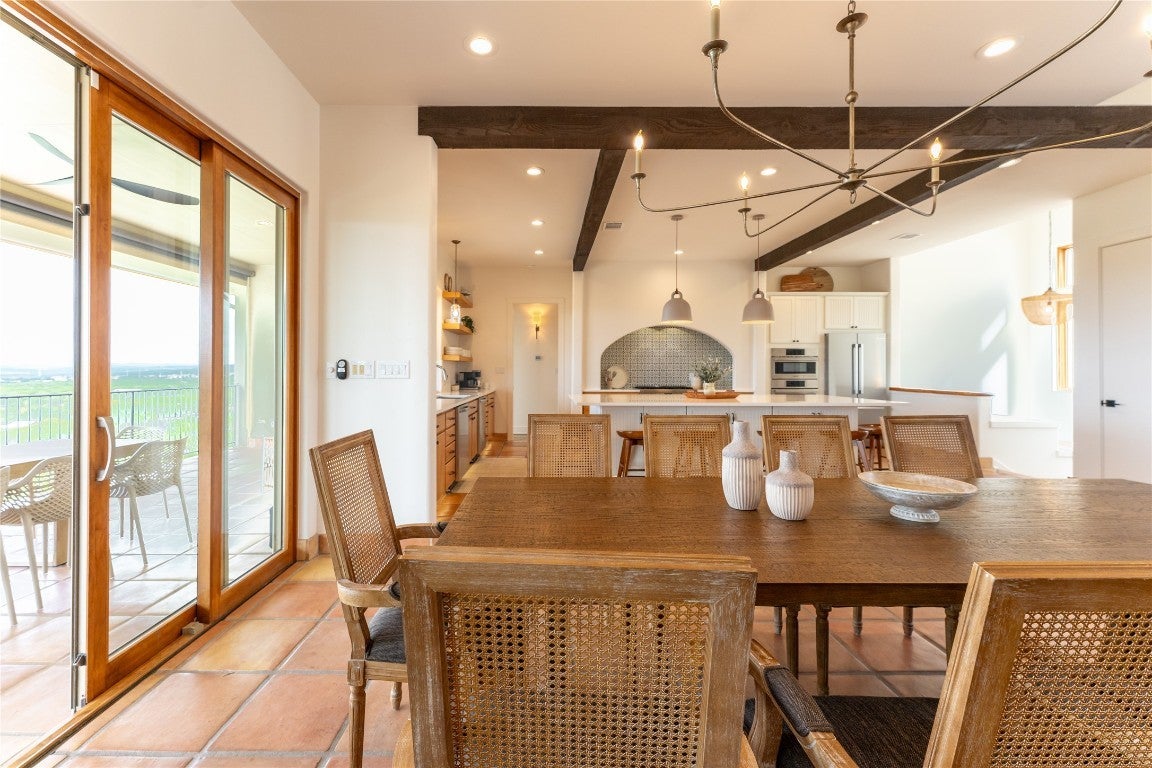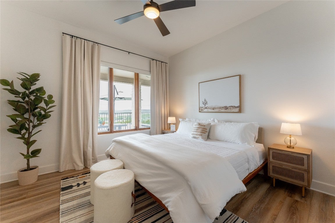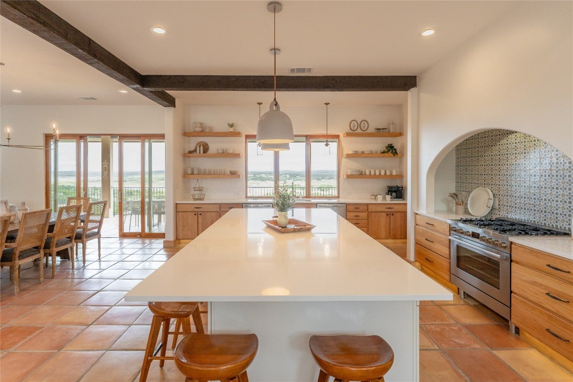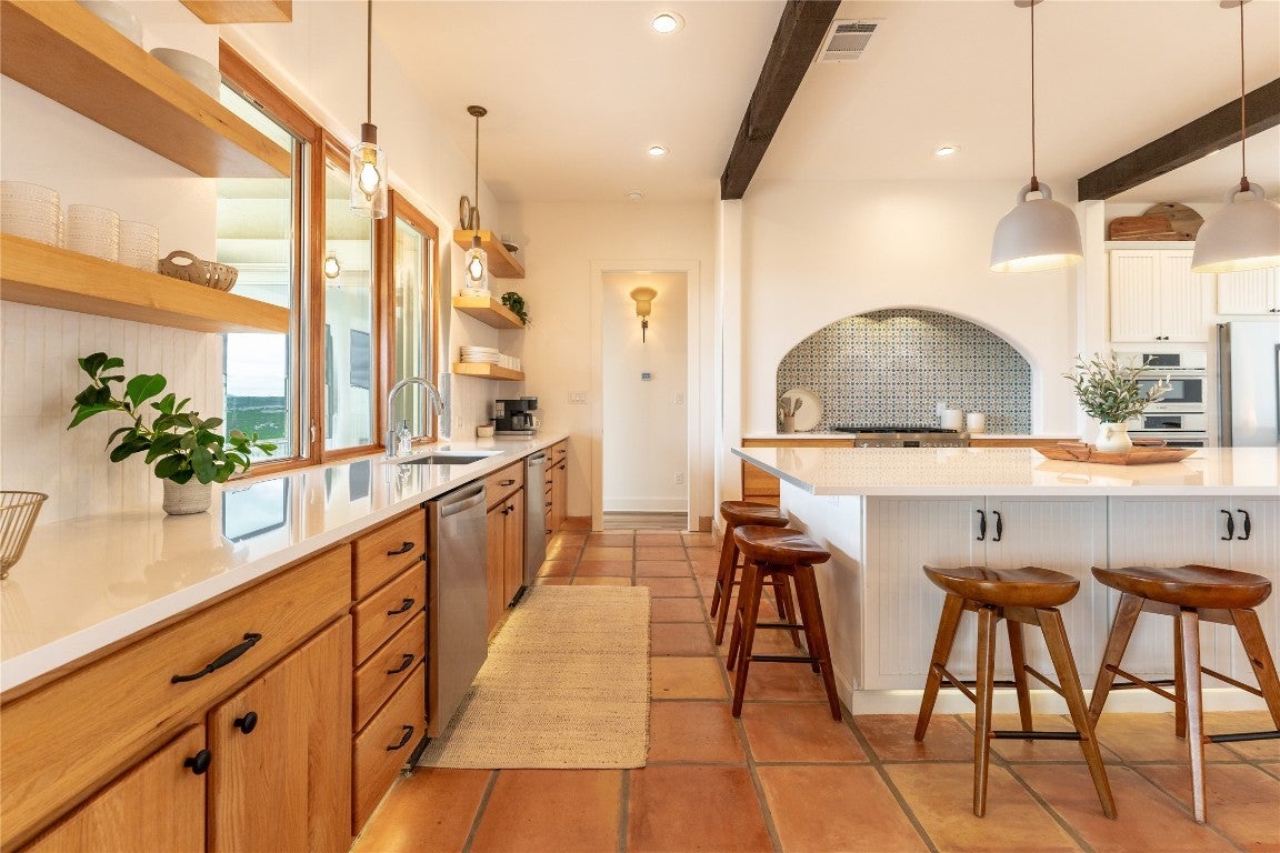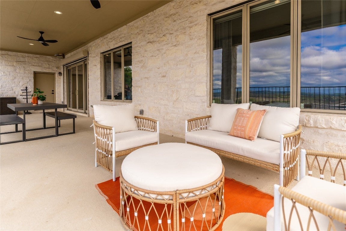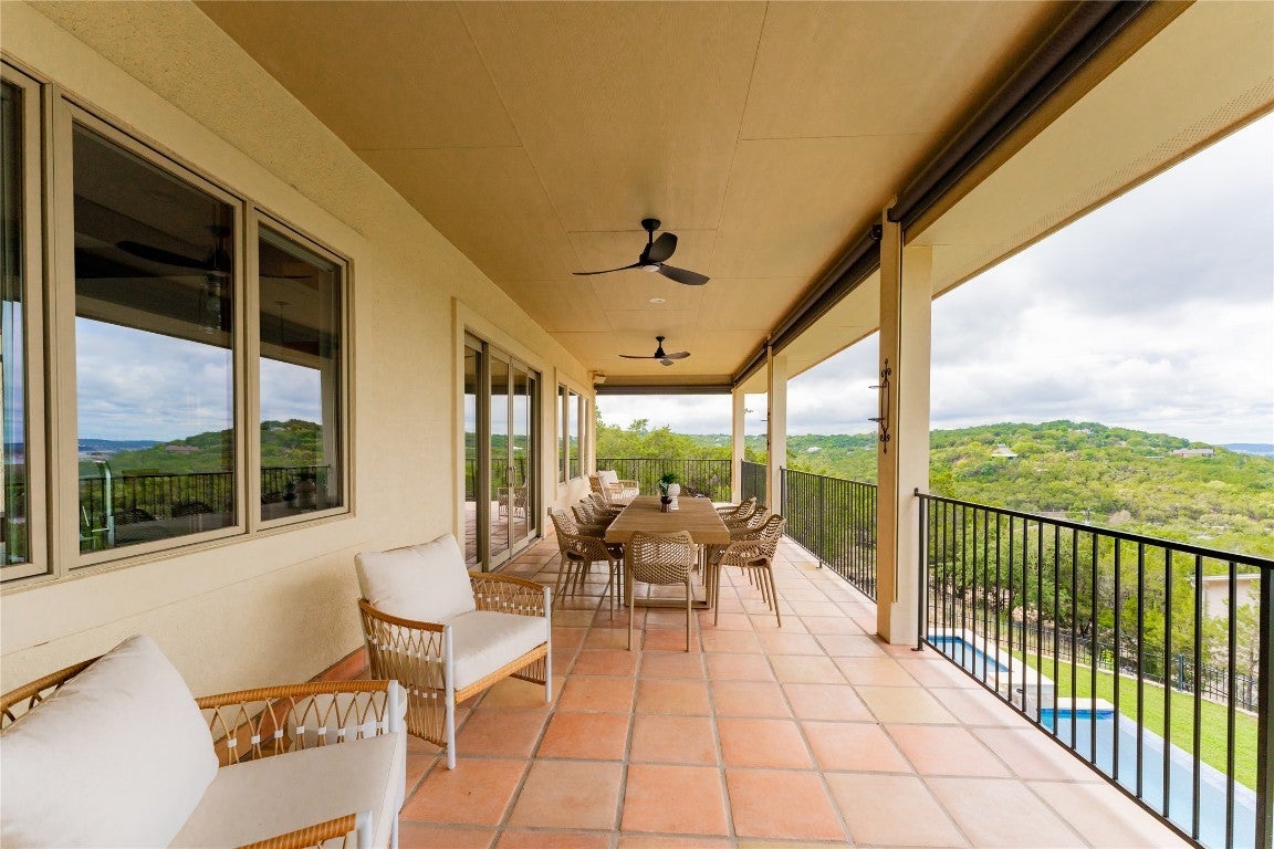 Step into your dream home located on just under 1/2 acre in the serene lake community of Lago Vista! This stunning 4 bed, 4 bath luxury residence boasts exquisite designer finishes, including gorgeous Saltillo tile. Upon entering you will be welcomed by soaring ceilings, an open-concept layout, and expansive windows that flood the home with natural light. The gourmet kitchen features high-end appliances including a built-in microwave and second oven, custom cabinetry, and a large center island perfect for entertaining. Take pleasure in dining in a spacious dining area, while relishing in the panoramic views of the hill country. The generous living room includes an attractive fireplace, and leads directly onto the upper balcony, the perfect place to take in phenomenal sunsets. The primary suite is situated on the main level, with private access to the balcony. The spa-like ensuite bath includes a double vanity, inviting soaking tub and a separate walk in shower. A secondary bedroom and full bath are also conveniently located on the main floor. The lower level of the home offers a second living area that leads out onto an oversized covered deck. Two additional bedrooms and two intricately designed full baths are also located on this level. The resort-style, heated infinity pool provides year round enjoyment! A 3 car garage allows for plenty of space for cars, entertaining areas and/or a workshop. The 2 sets of washers and dryers located in this area convey with the sell of the home. For ease of lawn maintenance, an automatic sprinkler system services both the front and back yards. Owning this home includes membership to the Lago Vista POA, allowing exclusive access to 9 private waterfront parks, basketball court, boat ramps, campground, disc golf course, fishing well, fitness center, hiking trail, marinas, parks, pavilions, pool, athletic field, tennis courts, pickle ball courts, playgrounds and more! This property can also be used as an STR.