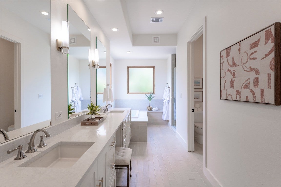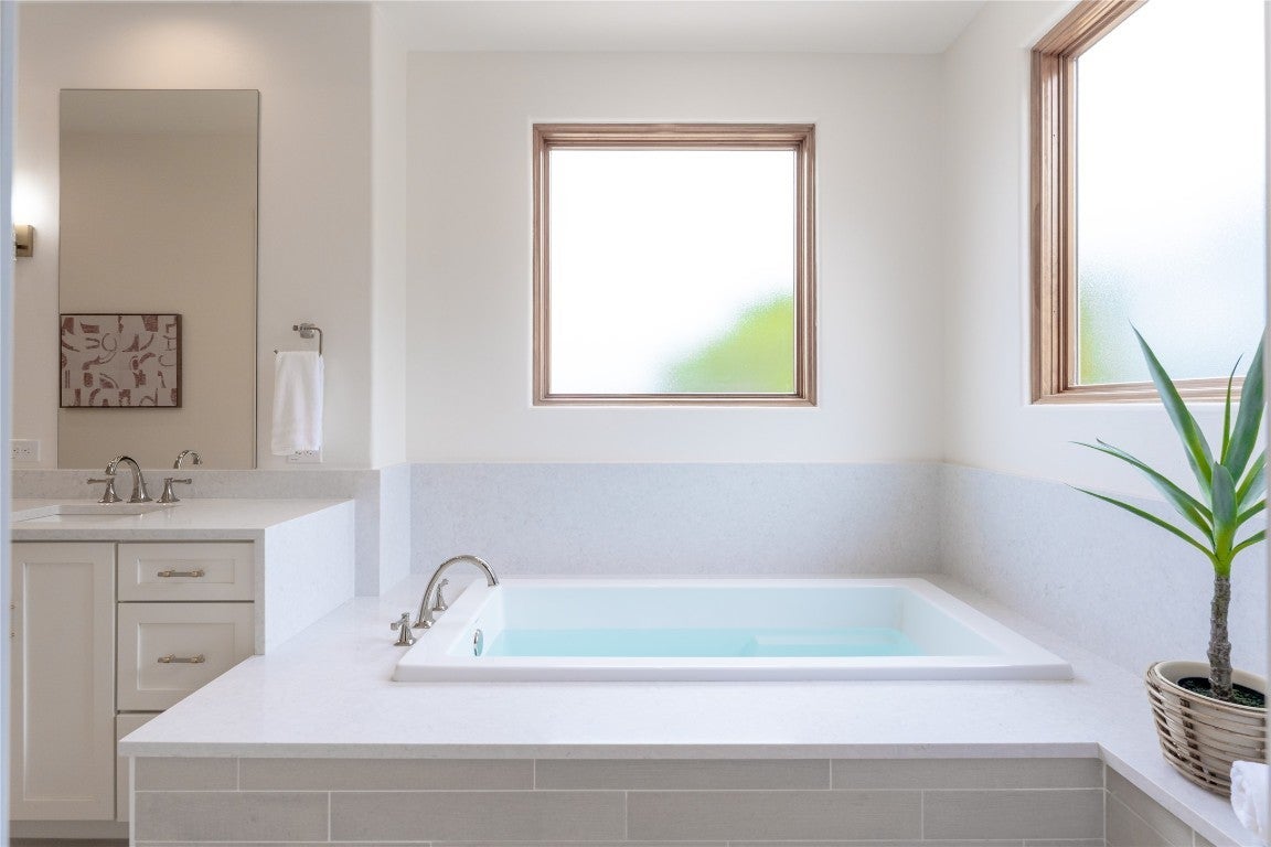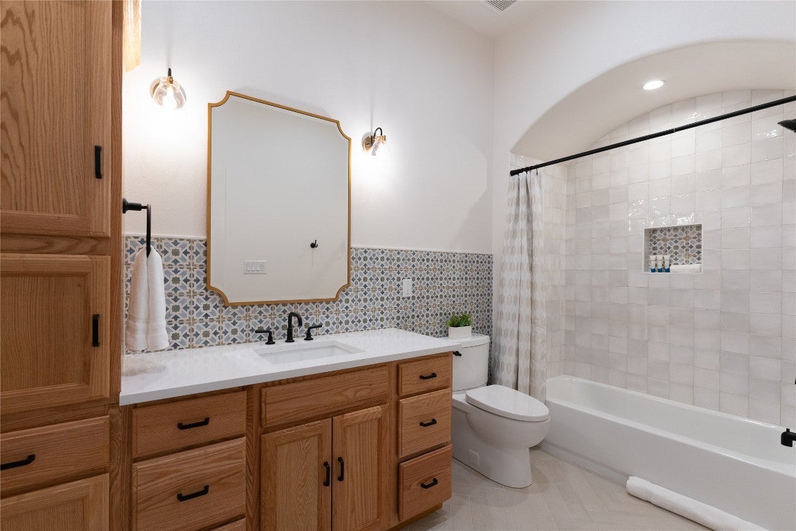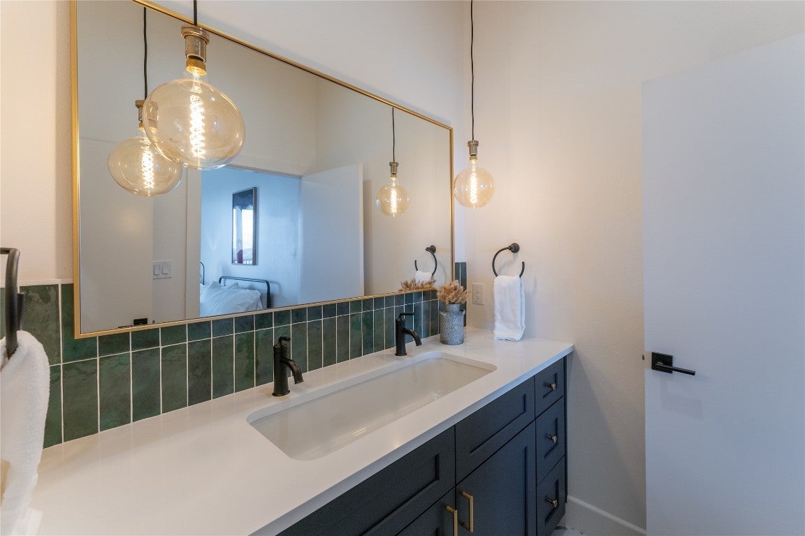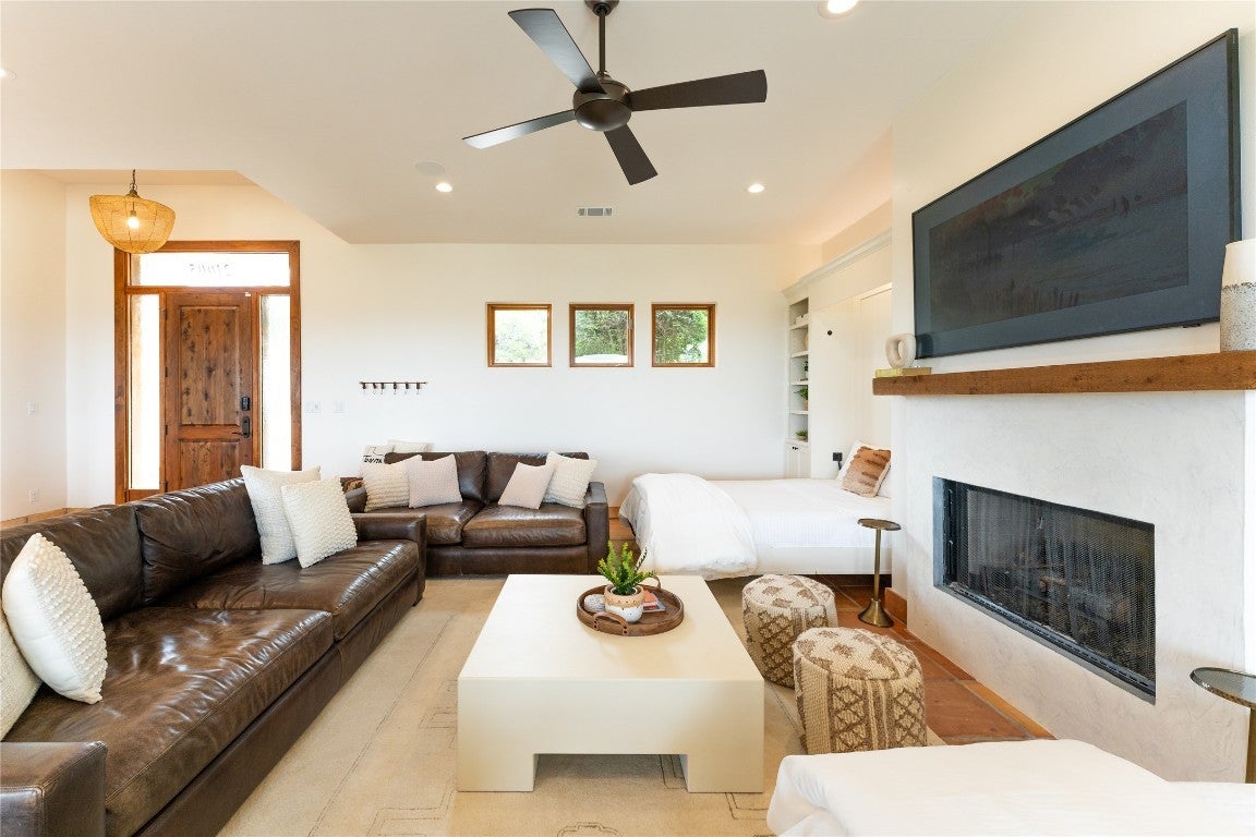 Step into your dream home located on just under 1/2 acre in the serene lake community of Lago Vista! This stunning 4 bed, 4 bath luxury residence boasts exquisite designer finishes, including gorgeous Saltillo tile. Upon entering you will be welcomed by soaring ceilings, an open-concept layout, and expansive windows that flood the home with natural light. The gourmet kitchen features high-end appliances including a built-in microwave and second oven, custom cabinetry, and a large center island perfect for entertaining. Take pleasure in dining in a spacious dining area, while relishing in the panoramic views of the hill country. The generous living room includes an attractive fireplace, and leads directly onto the upper balcony, the perfect place to take in phenomenal sunsets. The primary suite is situated on the main level, with private access to the balcony. The spa-like ensuite bath includes a double vanity, inviting soaking tub and a separate walk in shower. A secondary bedroom and full bath are also conveniently located on the main floor. The lower level of the home offers a second living area that leads out onto an oversized covered deck. Two additional bedrooms and two intricately designed full baths are also located on this level. The resort-style, heated infinity pool provides year round enjoyment! A 3 car garage allows for plenty of space for cars, entertaining areas and/or a workshop. The 2 sets of washers and dryers located in this area convey with the sell of the home. For ease of lawn maintenance, an automatic sprinkler system services both the front and back yards. Owning this home includes membership to the Lago Vista POA, allowing exclusive access to 9 private waterfront parks, basketball court, boat ramps, campground, disc golf course, fishing well, fitness center, hiking trail, marinas, parks, pavilions, pool, athletic field, tennis courts, pickle ball courts, playgrounds and more! This property can also be used as an STR.