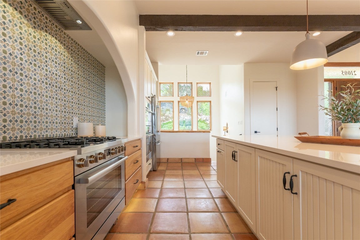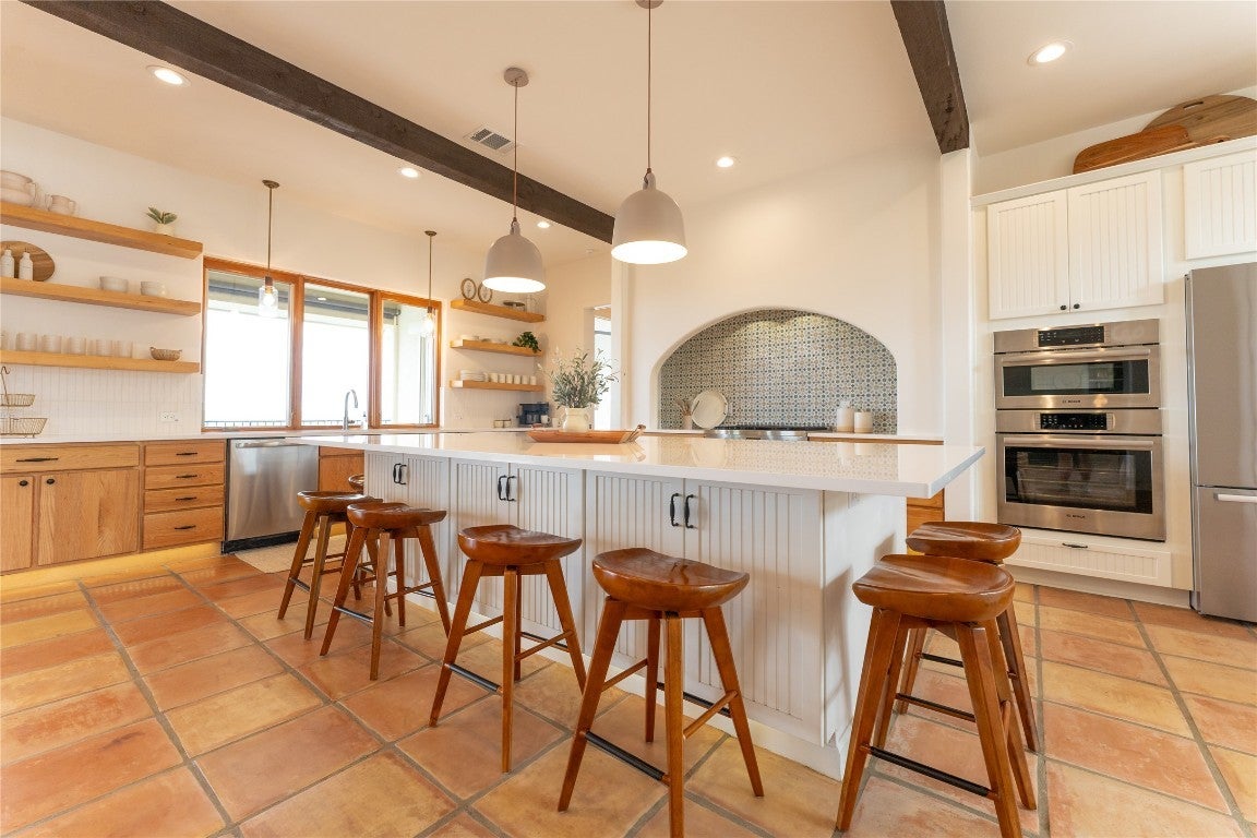 - Built-In Oven, Built-In Refrigerator, Dishwasher, Disposal, Electric Water Heater, Free-Standing Gas Range, Microwave, Stainless Steel Appliance(s), Vented Exhaust Fan