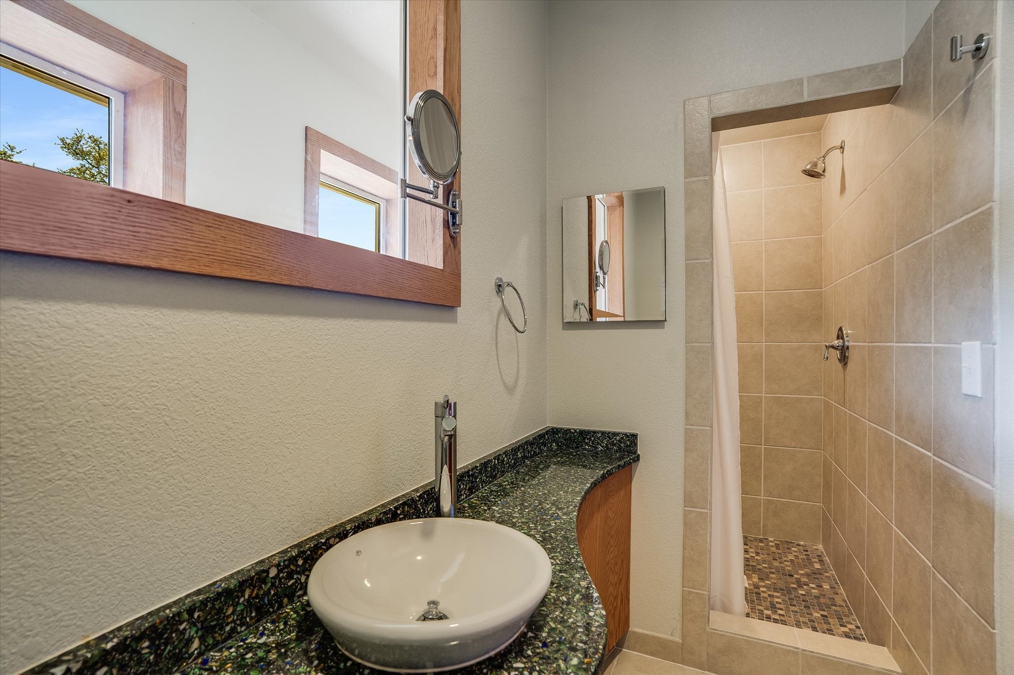 This gorgeous, custom-built retreat offers stunning views, abundant nature and wildlife, and the best of Texas Hill Country living! Situated in the coveted River Mountain Ranch Community that offers lower taxes (due to the community ag exemption) as well as community Blanco River access! Relax, swim, kayak or fish in the private HOA park on the river. The main home was designed to enjoy stunning hill country views from every room. There are 2 bedrooms, 2.5 baths, and the upstairs living area could easily be converted to a 3rd bedroom. The updated kitchen features quartz countertops, tile backsplash, bar seating & dining area. Walls of windows allow you to enjoy the stunning views! The family area features a fireplace and gorgeous built-ins. The primary bedroom is on the main level and offers vaulted ceilings with beautiful wood work. The updated bath offers a soaking tub, double vanity w/ quartz countertops, walk-in shower and walk-in closet. The utility room is on the main level, so everything you need for daily living is on the main floor. Upstairs is a full bath, bedroom and living area that could be converted into a 3rd bedroom, both with access to the balcony and views! The covered back porch is the perfect place to watch the sun go down and listen to nature around you. Energy-efficient sustainable building materials, rainwater collection, a Tesla Powerwall and heating/cooling by a geothermal heat pump. The guest casita has a living area, bedroom, loft, full bath, washer/dryer and kitchen with fridge, cabinets and sink. Perfect for guests, artists, caretakers,etc. Fenced backyard. Another unique feature is the wet-weather grotto you can walk to. Easy commute to Austin/Buda/ Kyle, with top rated Wimberley ISD schools. Just 15 minutes from DT Wimberley known for its arts, dining, live music & charming town square. Whether a full time residence, family compound or weekend retreat, it's a rare opportunity to embrace the very best of Hill Country Living!