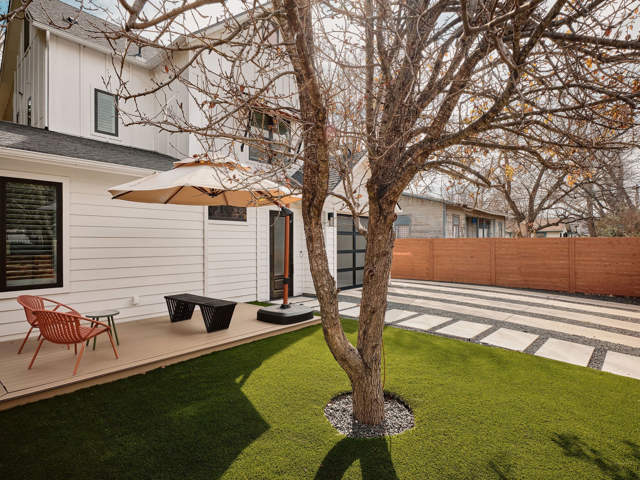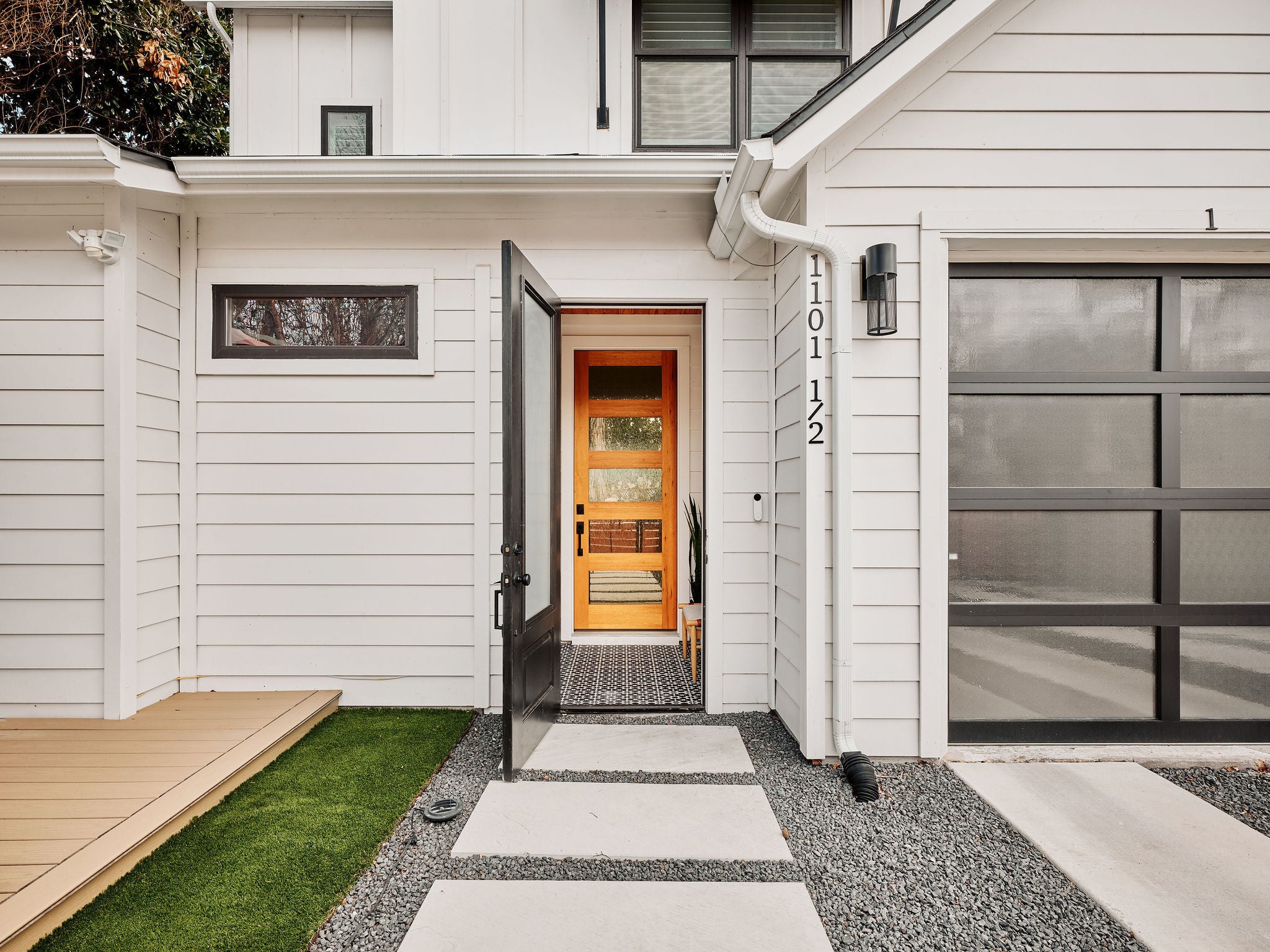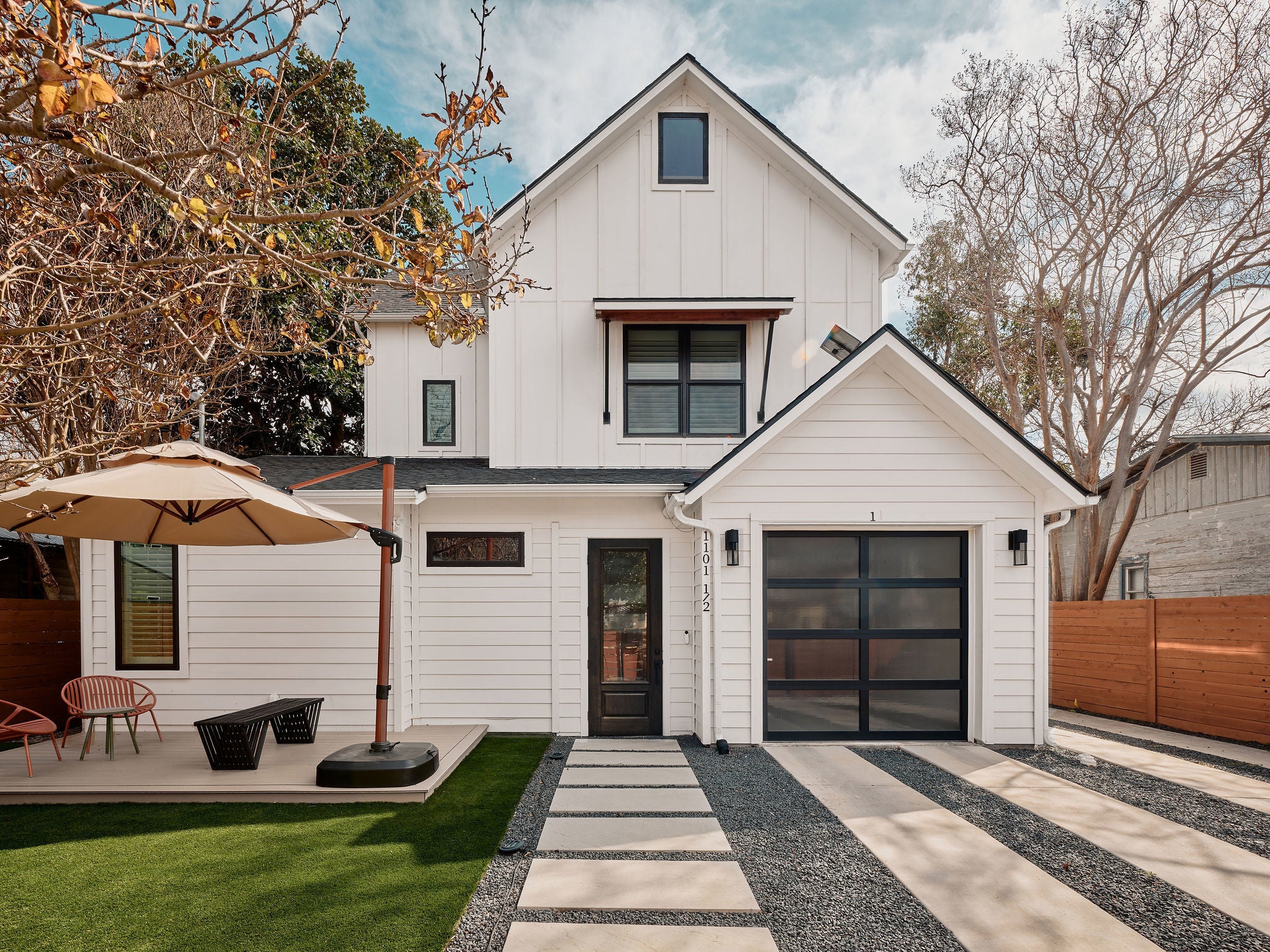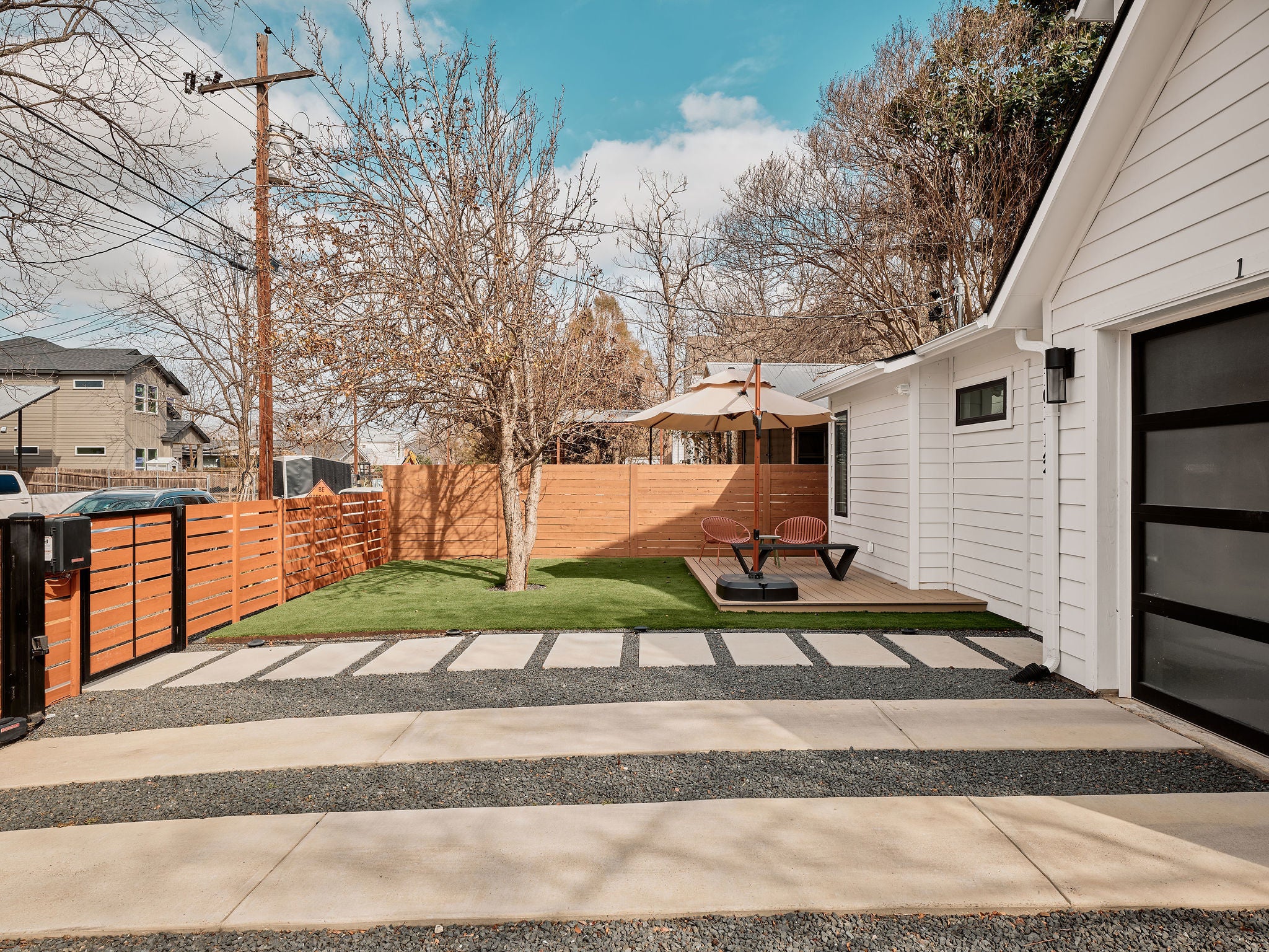 Located in the heart of East Austin, 1101 1/2 Fiesta Street #1 by CKN Homes offers a thoughtfully designed floor plan with over $100,000 in custom upgrades. Behind automatic gates, the property features a shaded Trex deck ideal for year-round sunset views and outdoor enjoyment. The home welcomes you with a rare mudroom-style entry, providing functional space for storage and added privacy. The main level includes a guest bedroom and full bathroom positioned for separation and convenience. The kitchen is enhanced with imported English wallpaper, upgraded lighting, and brass fixtures, along with California-style shutters featuring a transferable lifetime warranty and custom window treatments throughout. Outdoor living is elevated with a tiled back patio, automatic screens for added comfort, and professionally designed landscaping including turf, pavers, and custom lighting—perfect for entertaining. Upstairs, the well-designed layout ensures privacy with bedrooms that do not share walls. The primary suite features designer wallpaper, a customized closet system with adjustable shelving, and access to a private balcony. A versatile loft space offers a secondary living area filled with natural light, along with an additional bedroom ideal for an office, gym, or nursery. A built-in reading nook and generous storage space complete the upper level. This property combines thoughtful design, high-end finishes, and a prime East Austin location.