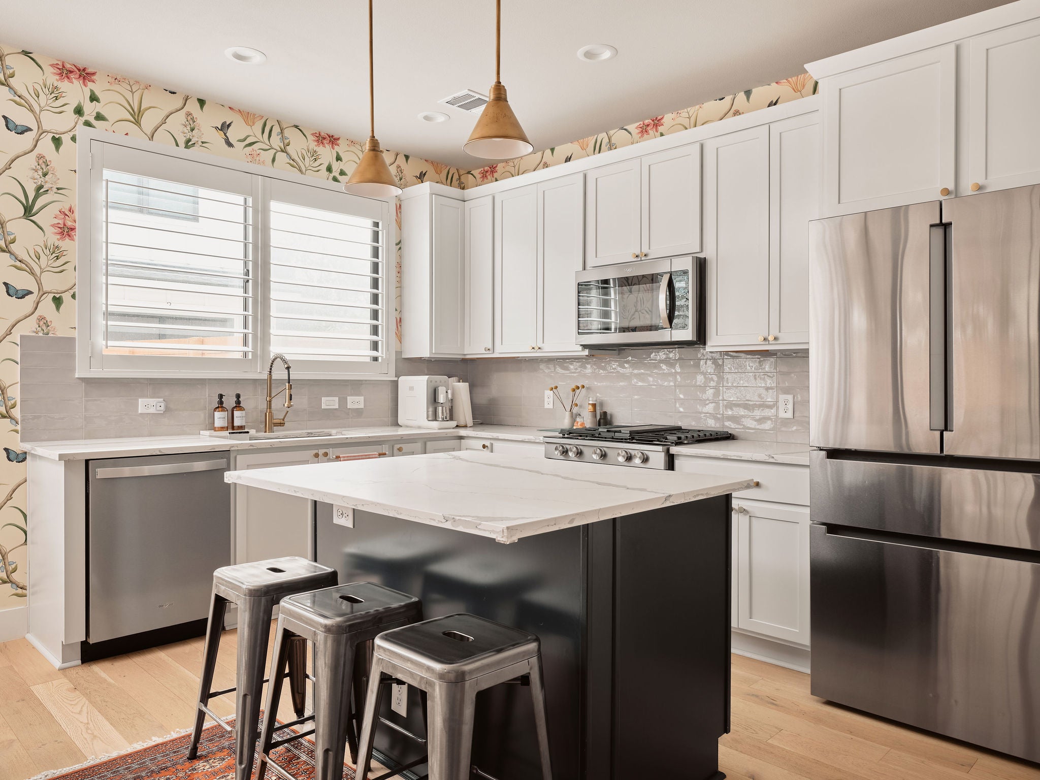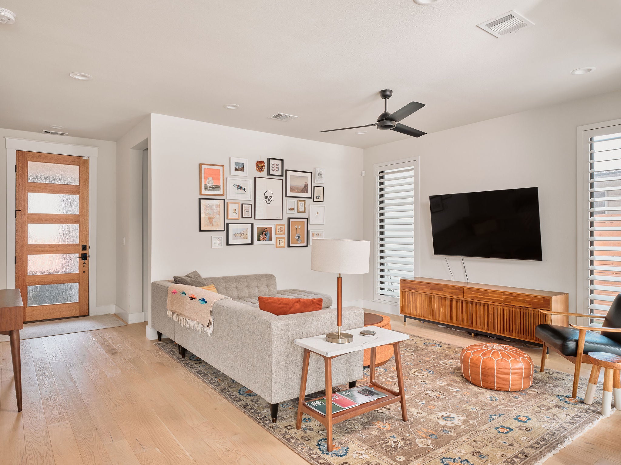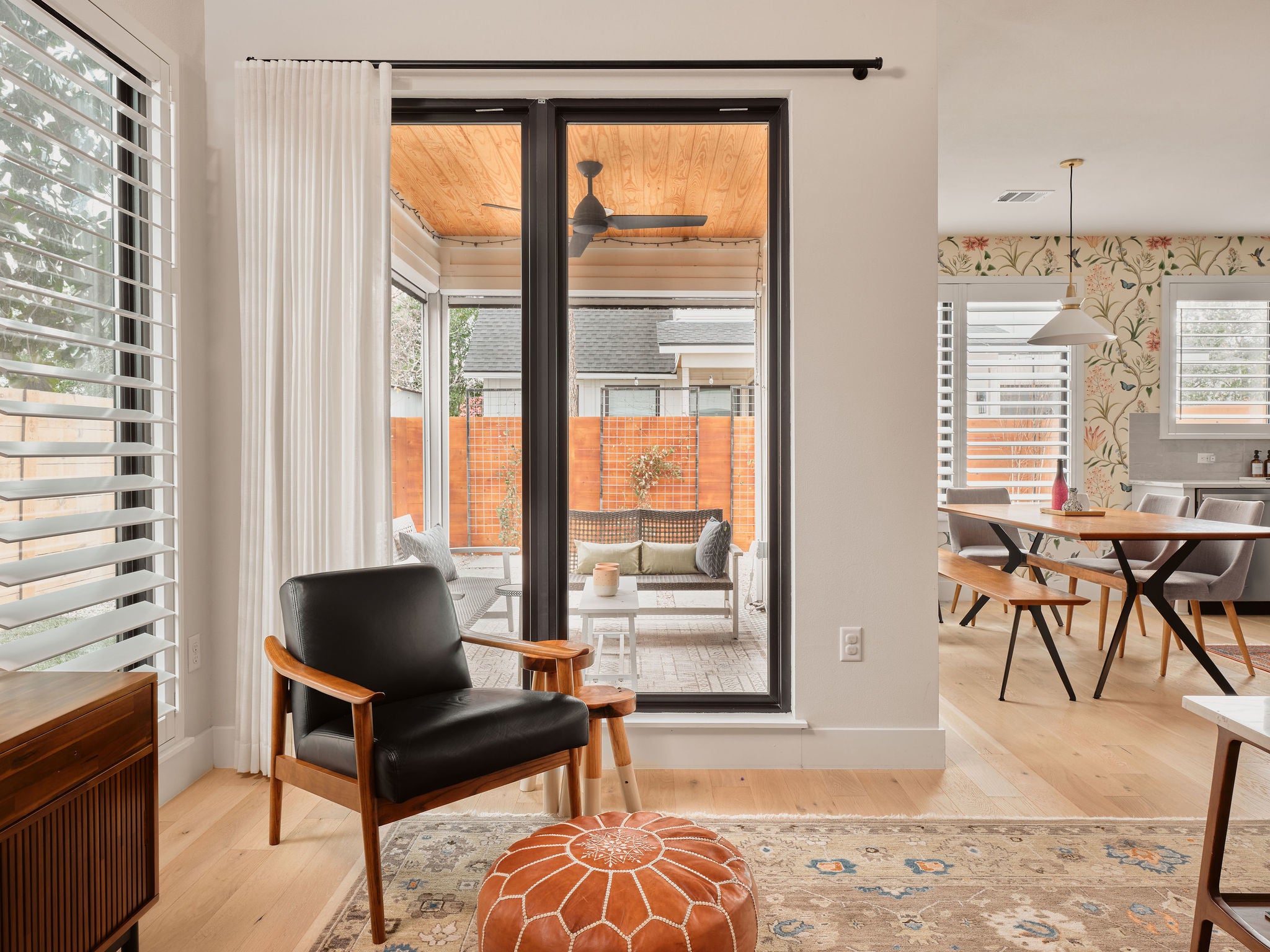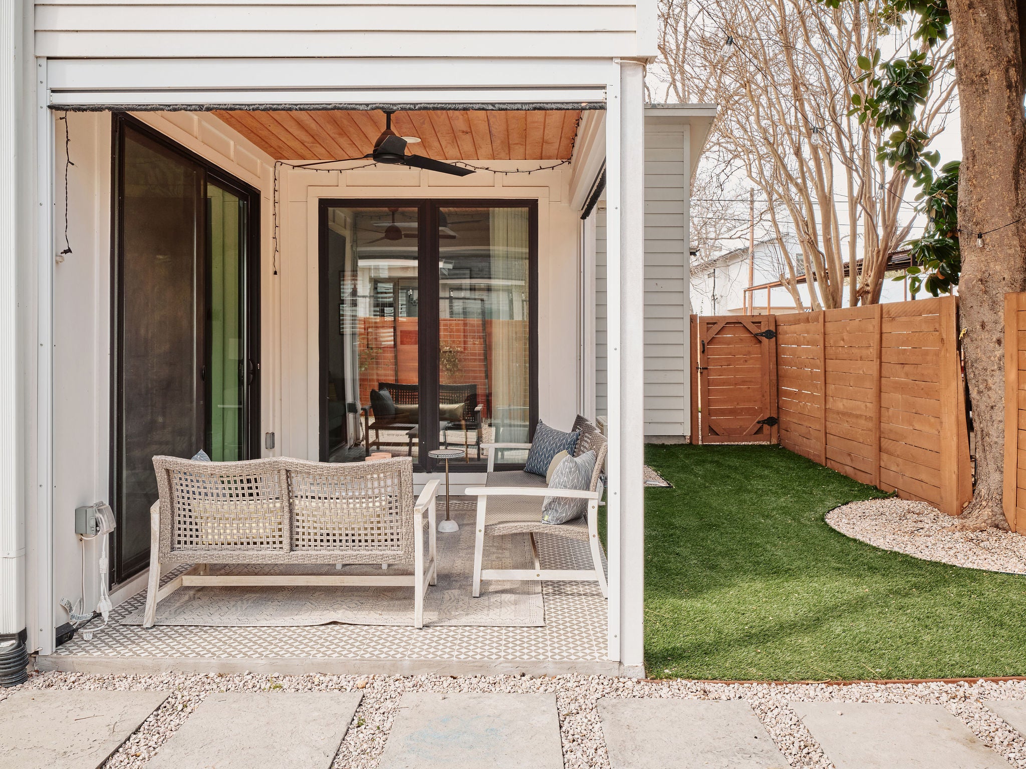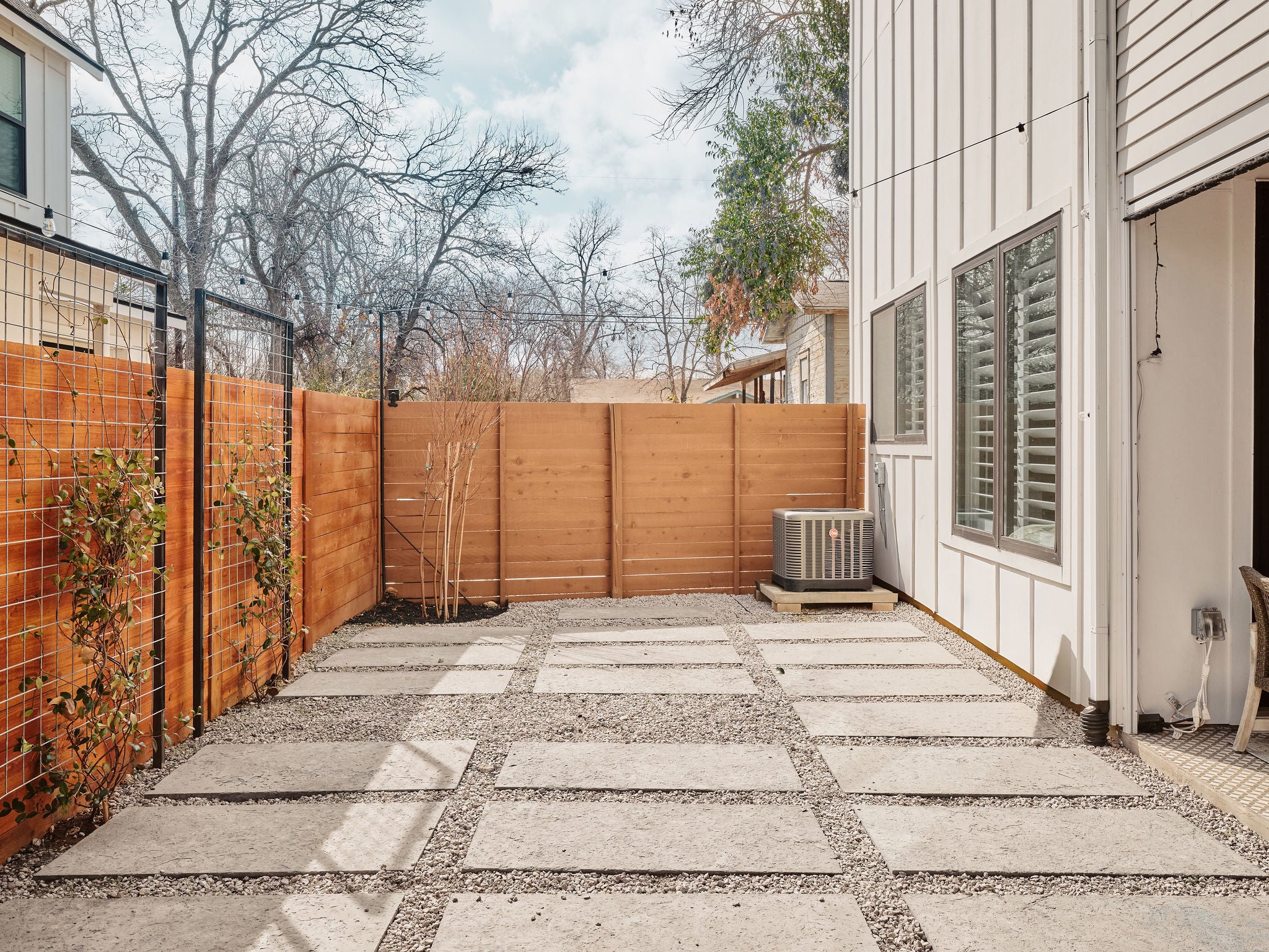 Located in the heart of East Austin, 1101 1/2 Fiesta Street #1 by CKN Homes offers a thoughtfully designed floor plan with over $100,000 in custom upgrades. Behind automatic gates, the property features a shaded Trex deck ideal for year-round sunset views and outdoor enjoyment. The home welcomes you with a rare mudroom-style entry, providing functional space for storage and added privacy. The main level includes a guest bedroom and full bathroom positioned for separation and convenience. The kitchen is enhanced with imported English wallpaper, upgraded lighting, and brass fixtures, along with California-style shutters featuring a transferable lifetime warranty and custom window treatments throughout. Outdoor living is elevated with a tiled back patio, automatic screens for added comfort, and professionally designed landscaping including turf, pavers, and custom lighting—perfect for entertaining. Upstairs, the well-designed layout ensures privacy with bedrooms that do not share walls. The primary suite features designer wallpaper, a customized closet system with adjustable shelving, and access to a private balcony. A versatile loft space offers a secondary living area filled with natural light, along with an additional bedroom ideal for an office, gym, or nursery. A built-in reading nook and generous storage space complete the upper level. This property combines thoughtful design, high-end finishes, and a prime East Austin location.
