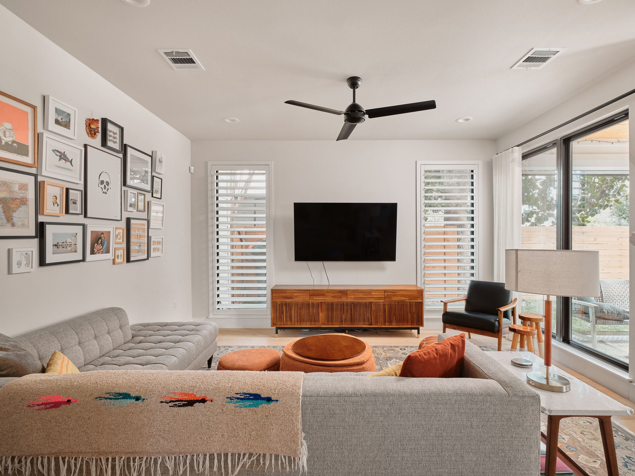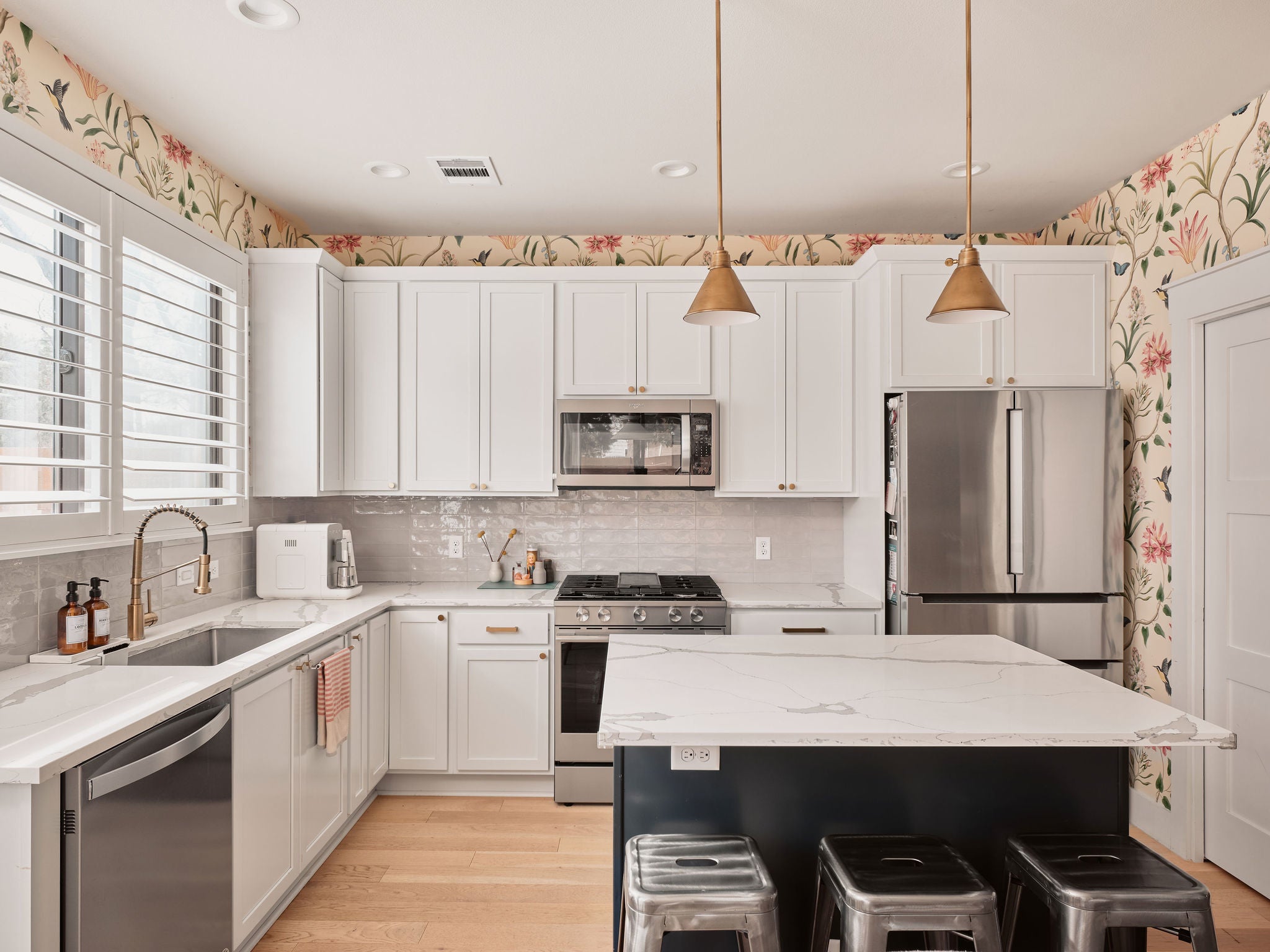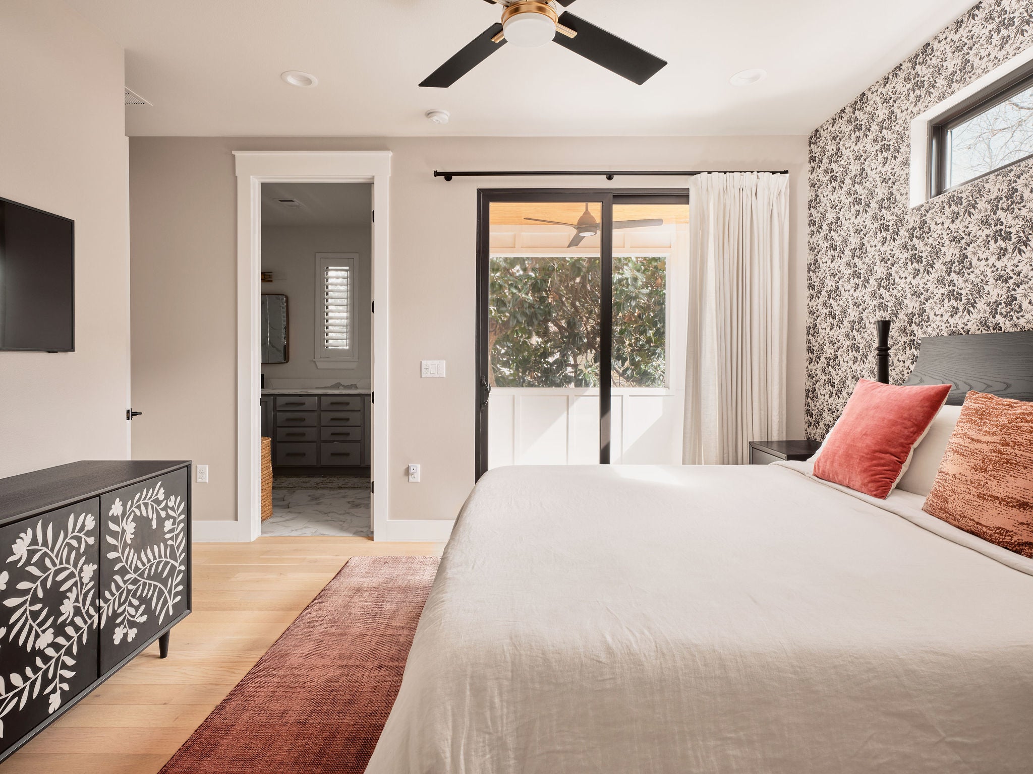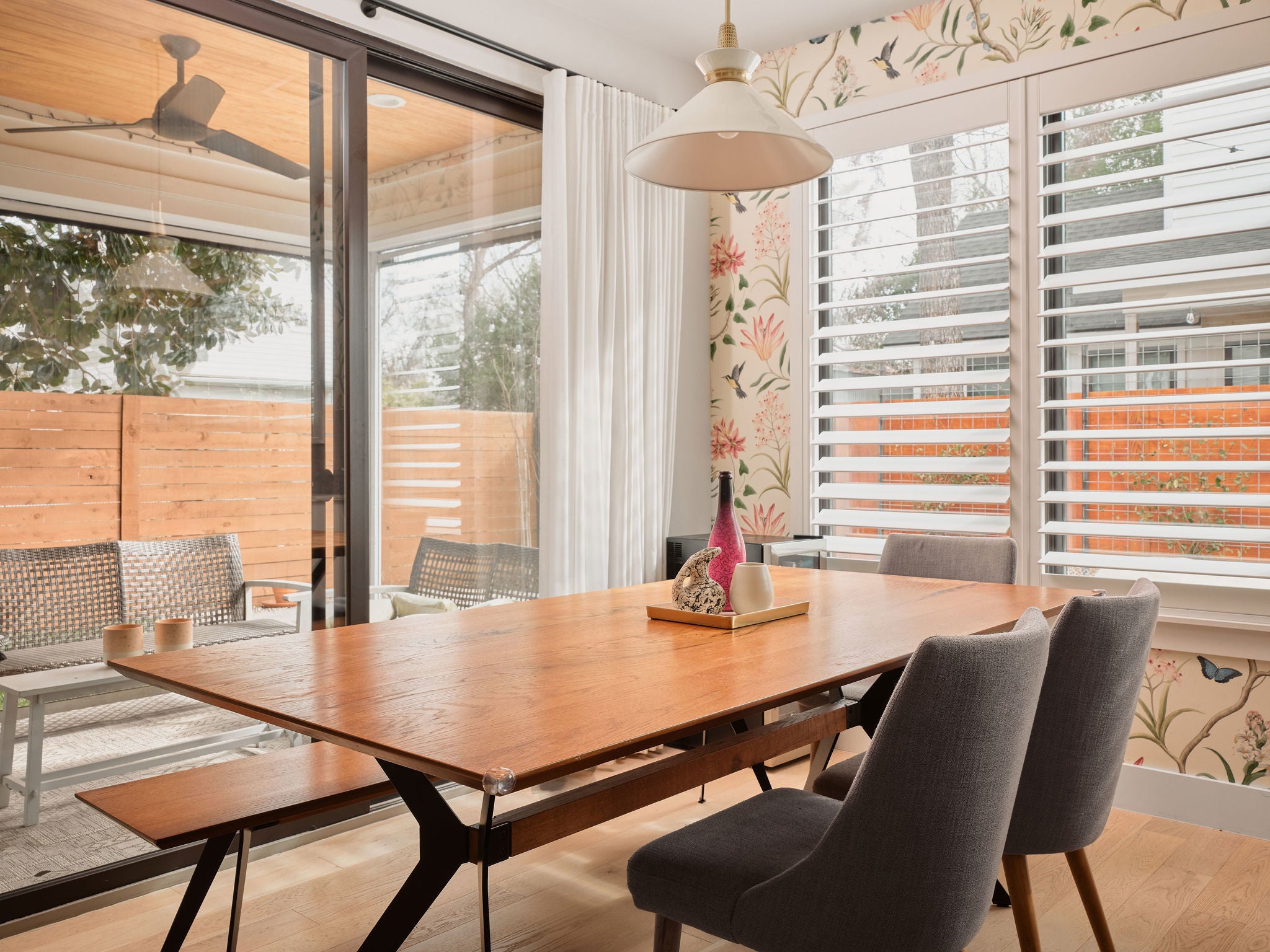 Located in the heart of East Austin, 1101 1/2 Fiesta Street #1 by CKN Homes offers a thoughtfully designed floor plan with over $100,000 in custom upgrades. Behind automatic gates, the property features a shaded Trex deck ideal for year-round sunset views and outdoor enjoyment. The home welcomes you with a rare mudroom-style entry, providing functional space for storage and added privacy. The main level includes a guest bedroom and full bathroom positioned for separation and convenience. The kitchen is enhanced with imported English wallpaper, upgraded lighting, and brass fixtures, along with California-style shutters featuring a transferable lifetime warranty and custom window treatments throughout. Outdoor living is elevated with a tiled back patio, automatic screens for added comfort, and professionally designed landscaping including turf, pavers, and custom lighting—perfect for entertaining. Upstairs, the well-designed layout ensures privacy with bedrooms that do not share walls. The primary suite features designer wallpaper, a customized closet system with adjustable shelving, and access to a private balcony. A versatile loft space offers a secondary living area filled with natural light, along with an additional bedroom ideal for an office, gym, or nursery. A built-in reading nook and generous storage space complete the upper level. This property combines thoughtful design, high-end finishes, and a prime East Austin location.