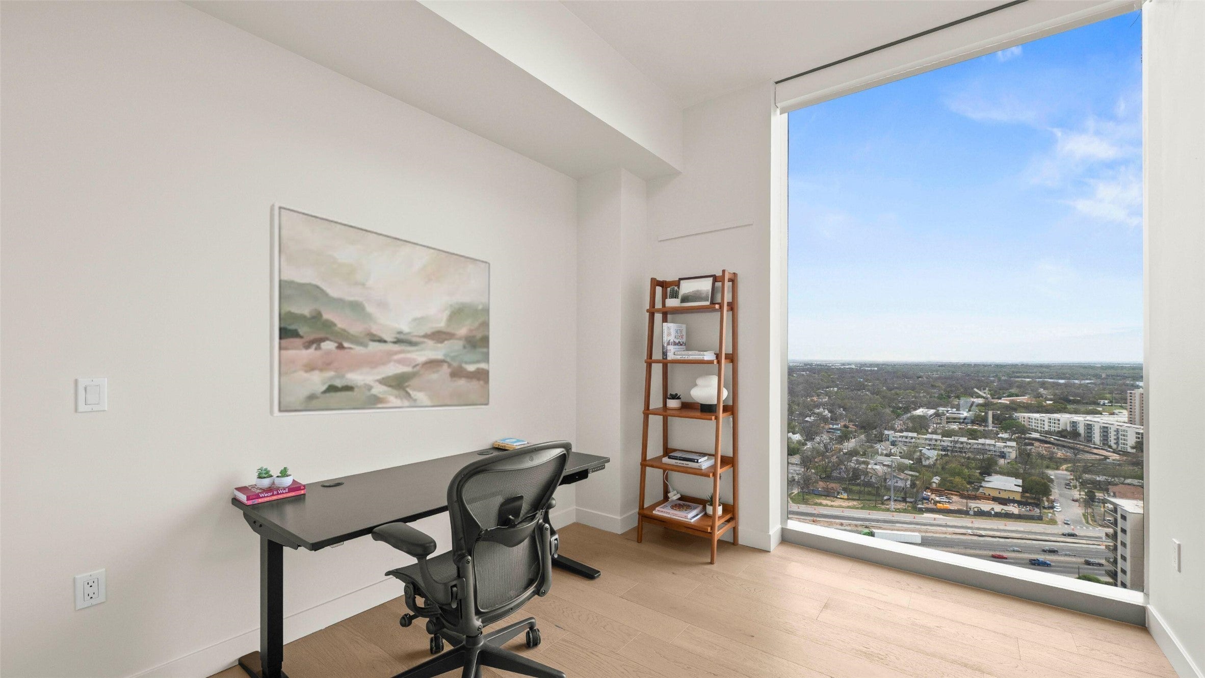 Corner residence with forever lake views at 44 East Ave. Unit 2110 faces south and east on the 21st floor, capturing unobstructed views of Lady Bird Lake and East Austin that are permanently protected — no future development will block what you see today. Wake up to sunrise over the water, with natural light flooding both bedrooms and the open living space throughout the day. This 2-bedroom, 2-bath layout spans 1,260 square feet in a 2022-built tower with modern systems throughout. The kitchen features a striking black finish, gas range, quartz countertops, and built-in Bosch appliances. Oak hardwood floors and floor-to-ceiling glass run throughout. Owner upgrades include custom motorized shades, UV/heat-blocking window film, and in-unit washer/dryer. Step out to a private balcony overlooking the lake. Two deeded parking spaces convey — a rare find downtown. 44 East sits at the Rainey Street trailhead with direct lake access, yet the building's East Avenue entrance means you skip Rainey Street traffic entirely. Amenities include 24-hour concierge, resort-style pool, fitness center, 37th-floor sky lounge, and guest suites.