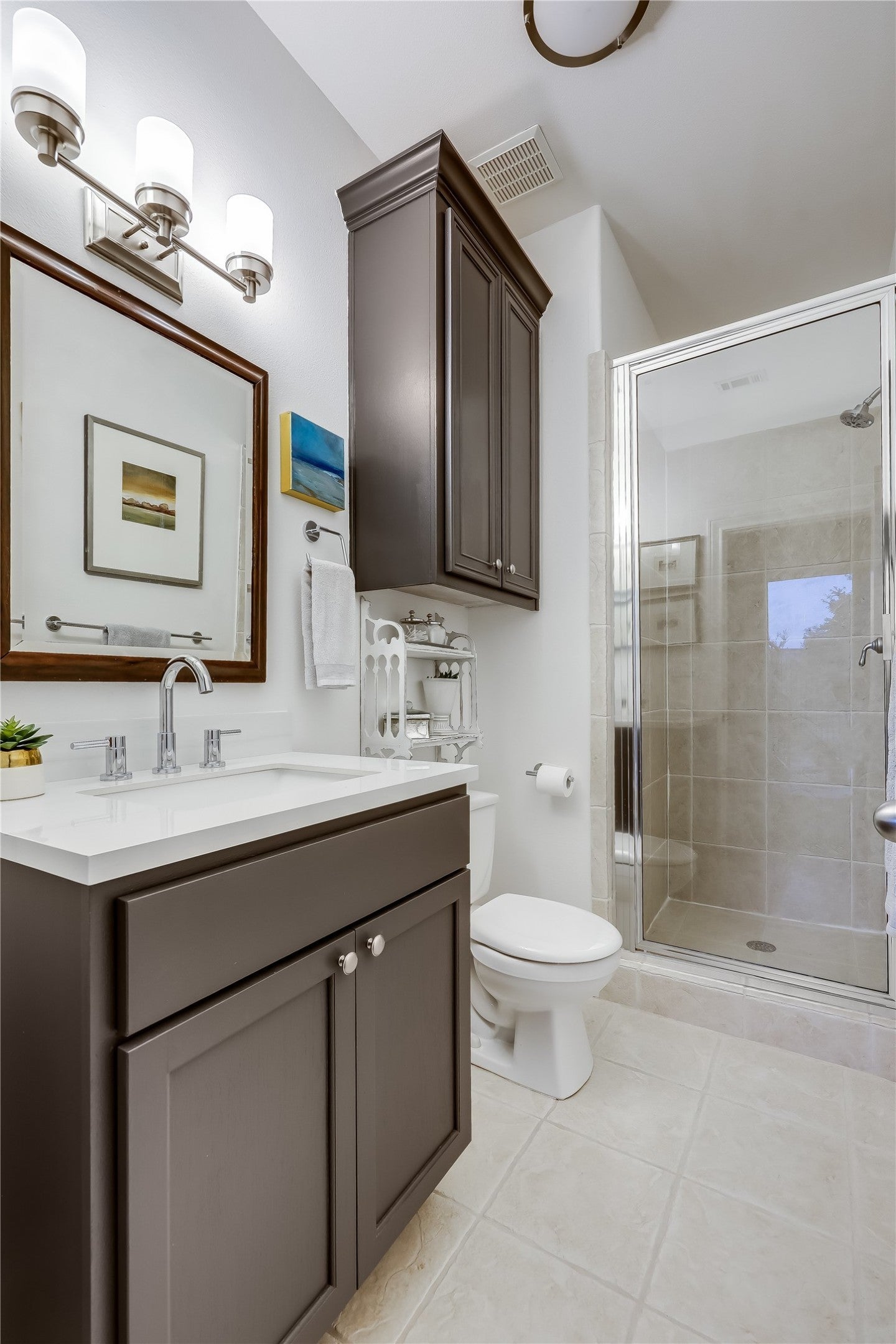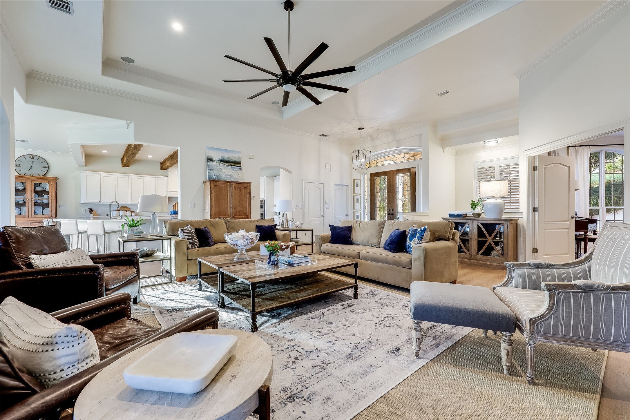 Welcome to this stunning property in Waterford on Lake Travis neighborhood, an exclusive gated community. This home is an expansive 4,681 square feet of living space, set on a sprawling 1.3 acre waterfront lot. The home showcases a breathtaking waterfront view with mature oak trees and open water views extending to Lake Travis. The open floor plan and windows offer panoramic views of the lake and hills from the living room and from the comfort of your back screened porch. The generous breakfast room is open to the kitchen and living room and is perfect for hosting larger groups or intimate gatherings. The heart of the home - the kitchen - has beamed ceilings and is beautifully updated with quartzite countertops, new cabinets, stainless steel appliances and a combined walk-in pantry and laundry room. The formal dining room has a built-in lighted, glass front shelving unit to beautifully display glassware, dishes or wine. The interior boasts four to five spacious bedrooms and three-and-a-half bathrooms. The primary bedroom suite resides on the main level providing easy accessibility and opens up to a balcony for private outdoor enjoyment. The primary suite features a large bathroom with dual vanities, a soaking tub, separate shower, and two walk-in closets. A second living room on the first floor provides ample space for relaxation or entertainment and it opens up onto a porch overlooking the lake. Several flex spaces on the first floor offer versatility for various uses such as a fitness room, office space or an extra bedroom. Enjoy the back yard while dining alfresco beside the lake, grilling on the deck, relaxing by the outdoor fire pit, or swimming off your own private dock. Outdoors, a Bocce Ball court adds a unique and playful touch to the entertainment space. Come see this meticulously maintained property! The 1.3 acre lot next door is for sale if you are looking for a rare opportunity for expanding or creating multi-generational living.