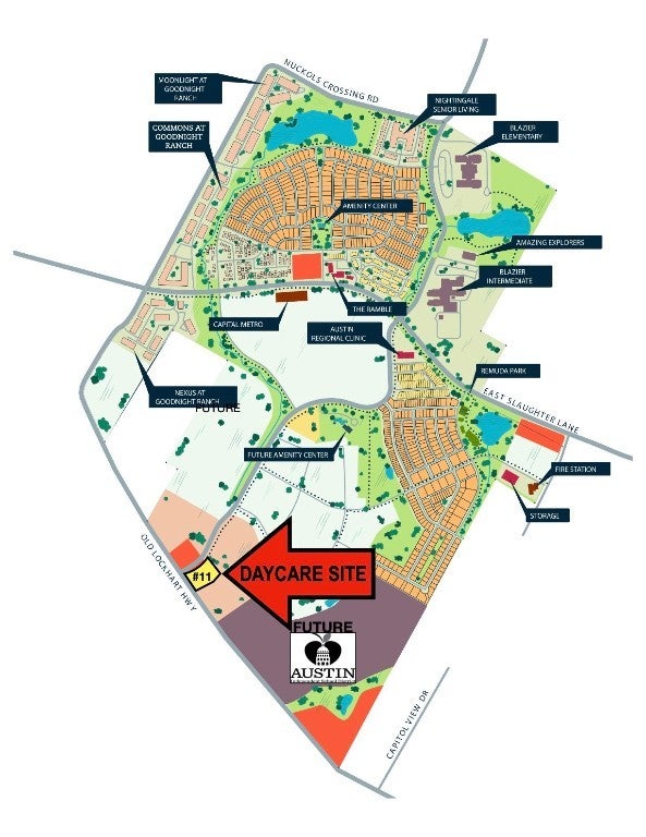 This 1.5-acre commercial corner presents an exceptional opportunity for childcare development at the southern entrance of Goodnight Ranch. With frontage on both Old Lockhart Road and the planned extension of Vertex Boulevard, the site offers prime visibility and accessibility. All utilities are available through the City of Austin, and no portion of the property falls within the FEMA 100-year floodplain. The site is priced at $25 per square foot for up to 12,000 square feet of gross building area (GBA). Situated within Goodnight Ranch—recognized as the 2023 Master-Planned Community of the Year by the Austin Business Journal—this location benefits from a rapidly growing area with entitlements for 6,300 residential units and 700,000 square feet of commercial space. This is a rare opportunity to establish a childcare facility in one of Austin’s premier master-planned communities.