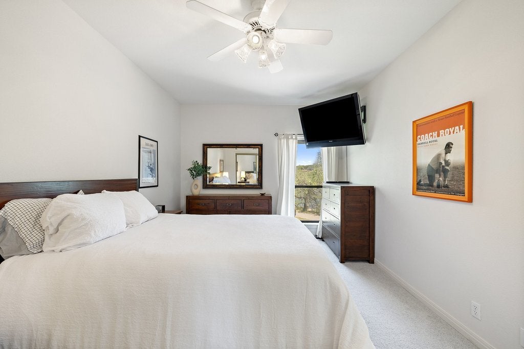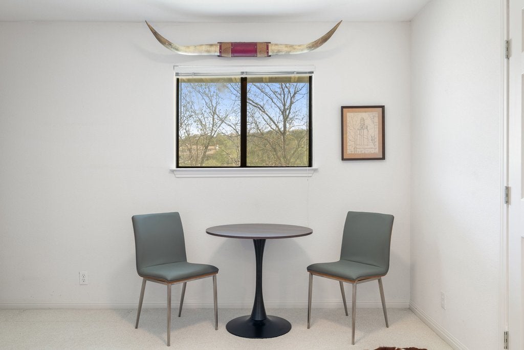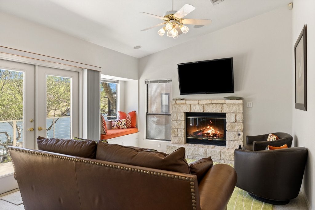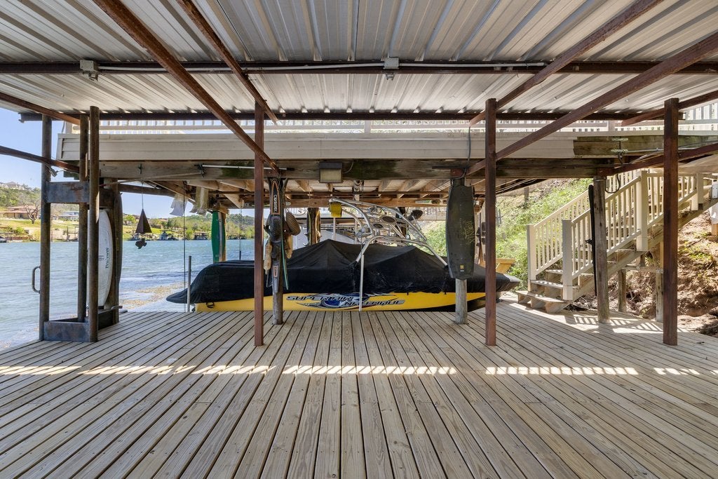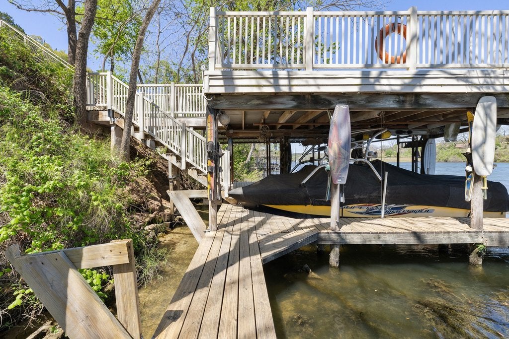 Rare opportunity on Lake Austin! Set on a prime stretch of Lake Austin, this refined waterfront retreat pairs effortless lake access with a low-maintenance, lock-and-leave lifestyle. Positioned on 1/3 acre, the property features a double boat dock with lift and multiple outdoor vantage points designed to capture the water from every angle. The main level hosts the primary suite with ensuite bathroom and adjacent laundry for seamless everyday living. Upstairs, vaulted ceilings enhance the open feel, complemented by new granite surfaces, custom hardwood cabinetry, and new appliances throughout. A Class 4 metal roof, new decking, and a two-car garage further elevate the home’s ease and durability. The third bedroom bunk room comfortably accommodates four, offering flexibility for guests. Laundry room not included in square footage, getting updated square footage. Offered with furnishing options, this is a turnkey opportunity on Lake Austin.