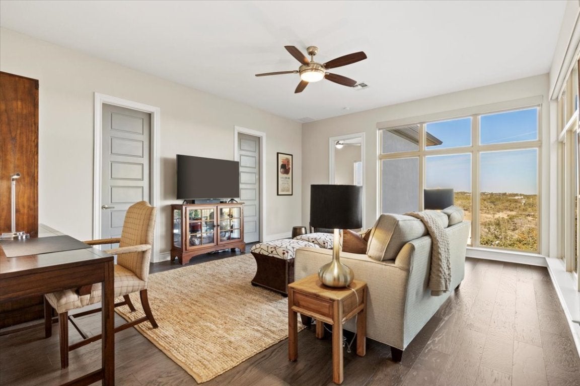 Perched on a scenic 1-acre lot in Vistancia and zoned to acclaimed Lake Travis ISD, this beautifully designed single-story home offers Hill Country views, privacy, and an exceptional layout. With over $145K in thoughtfully curated improvements, the impeccably maintained residence features 4 bedrooms, 3 baths, two living areas, a dedicated office, and a 3-car garage—delivering refined, move-in-ready living. ~Natural light fills the home, drawing you toward the main living area where a floor-to-ceiling stone fireplace and expansive wall of windows frame sweeping Hill Country views. The open-concept living and kitchen layout is ideal for everyday living and entertaining, keeping the scenery front and center. The gourmet kitchen provides generous prep space, bar seating, and ample cabinetry. A nearby laundry room with butler’s pantry adds additional storage and serving space, ideal for hosting and daily organization. Near the entry, a dedicated office with French doors and peaceful views creates an inviting work-from-home space. ~Outdoor living is a standout feature. Multi-sliding glass doors open to an upper terrace with an outdoor kitchen and panoramic views—perfect for entertaining, dining alfresco, or enjoying Texas sunsets. Below, a spacious patio and custom fire pit offer cozy spaces to relax, surrounded by lush landscaping and smart custom storage. ~The split-bedroom floor plan places the primary suite in a private wing, offering tranquil views and a spa-like bath with elegant finishes, a soaking tub, and a dual-head walk-in shower. Three secondary bedrooms, two full baths, and a versatile game or flex room occupy the opposite side of the home. To enhance the views and maintain privacy, motorized window shades valued at $15K were added to the primary bedroom and bath, and both living areas. With its thoughtful design, scenic setting, & peaceful 1-acre lot, this home captures the best of Hill Country living—just minutes from Bee Cave, Lakeway, & Dripping Springs.