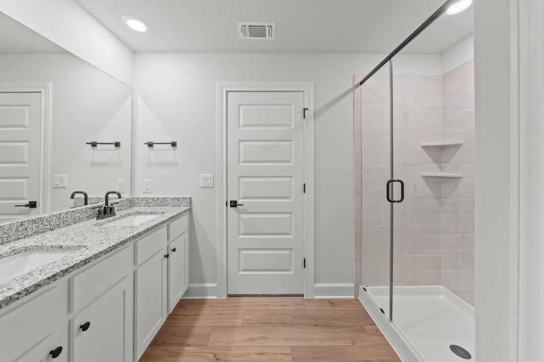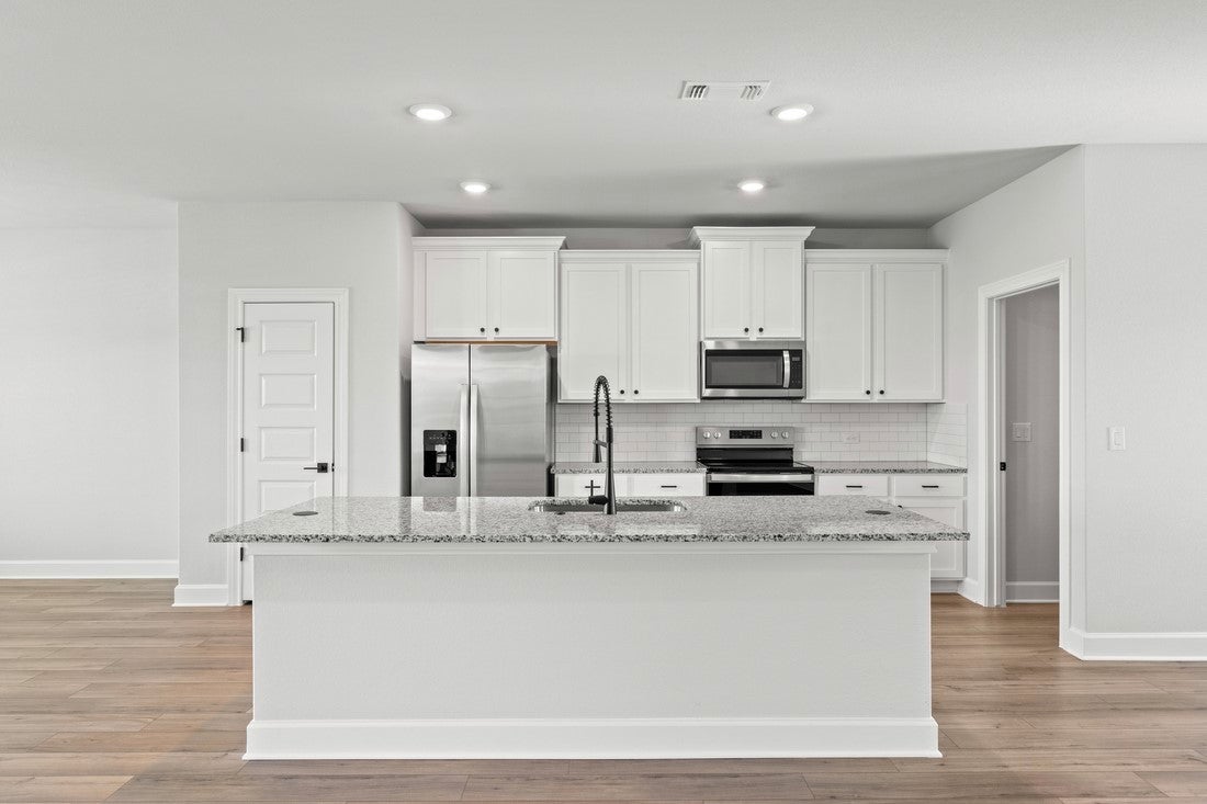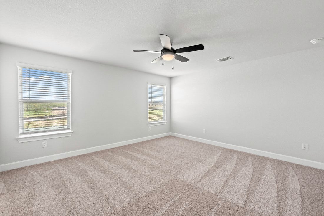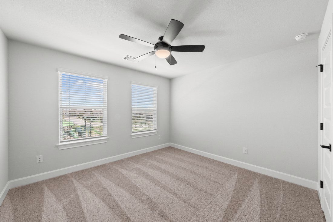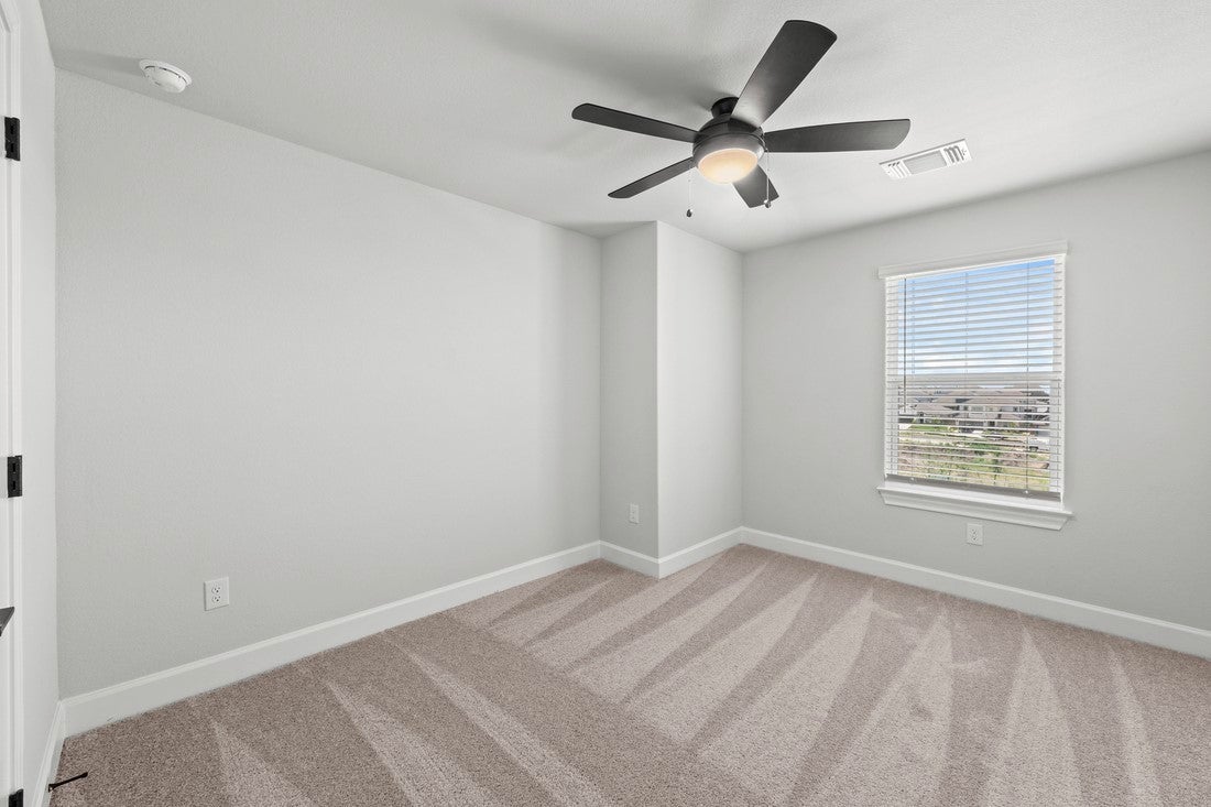 The Burnet is a spacious two-story home offering approximately 1,864 sq ft with 3 bedrooms and 2.5 bathrooms at Whisper Valley in Manor, just east of Austin. On the main level, the home features a welcoming foyer leading into a large family room that opens to a cozy dining area and chef-ready kitchen with stainless steel appliances, granite countertops, a sprawling island, and 42 inch upper cabinets with crown molding. The private primary retreat includes a generous bedroom with dual-sink vanity and walk-in shower in the bath, plus an expansive walk-in closet. Other highlights include a covered front porch, first-floor laundry room, ceiling fans, designer lighting, window blinds, and professional front yard landscaping—all upgrades included as standard. Residents of Whisper Valley enjoy a host of eco friendly amenities—such as solar panels, geothermal HVAC, spray foam insulation, a 220 volt outlet for future electric vehicle charger or hot tub, and homes pre wired for Google Fiber—alongside outstanding community features including a resort-style pool with beach entry, fitness center, dog park, walking/bike trails, organic community gardens, a Discovery Center for wellness activities, and over 700 acres of green space.