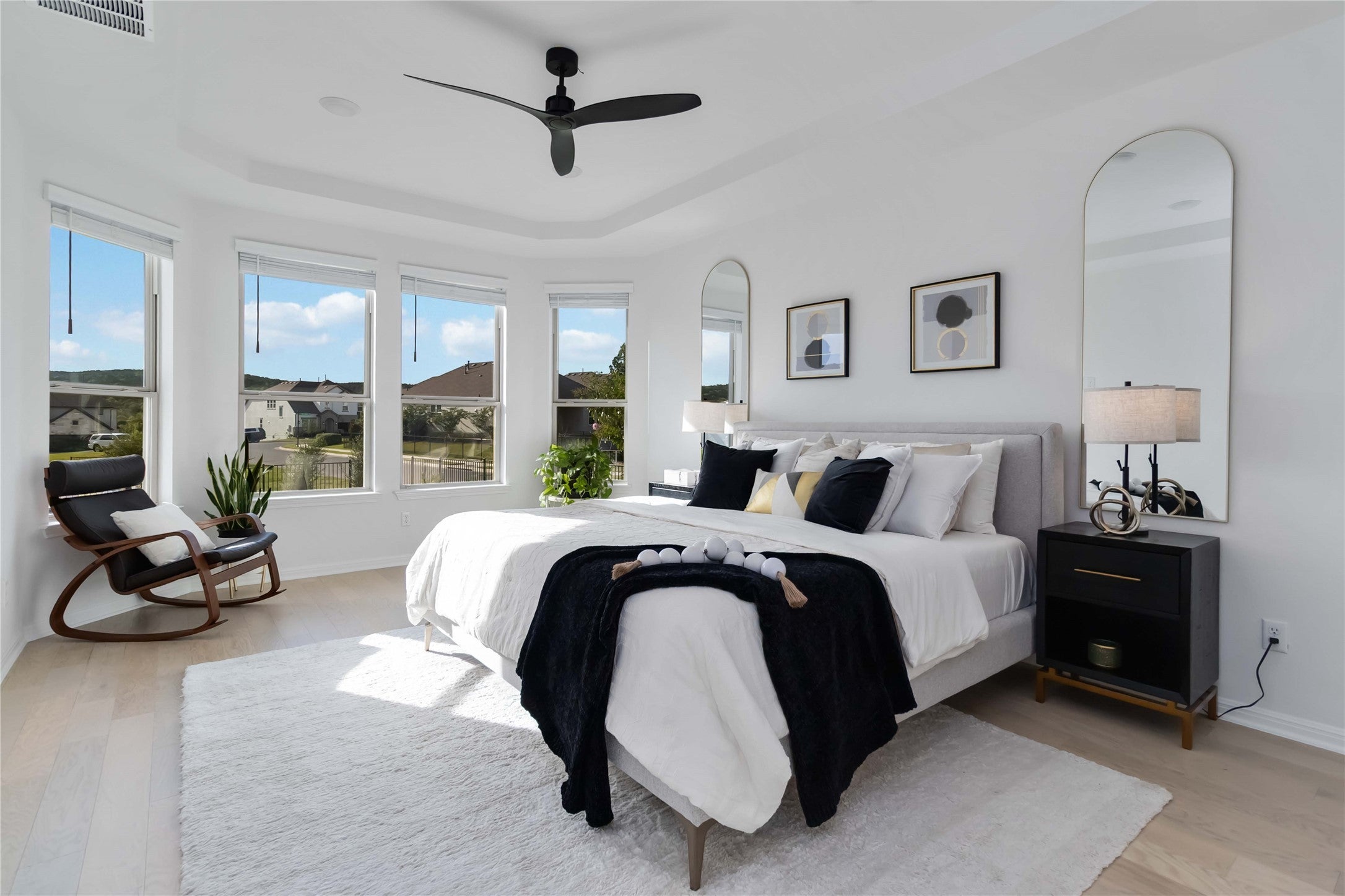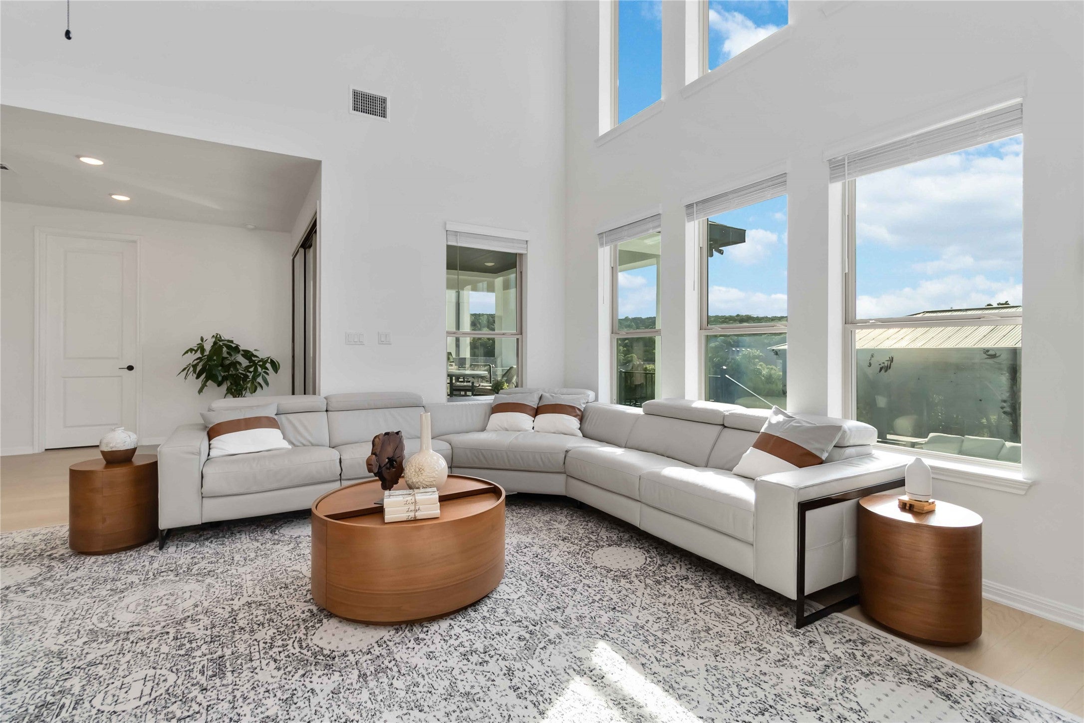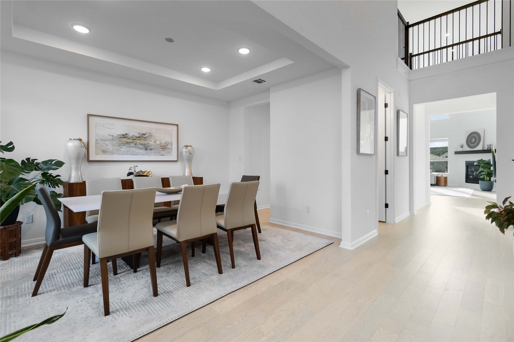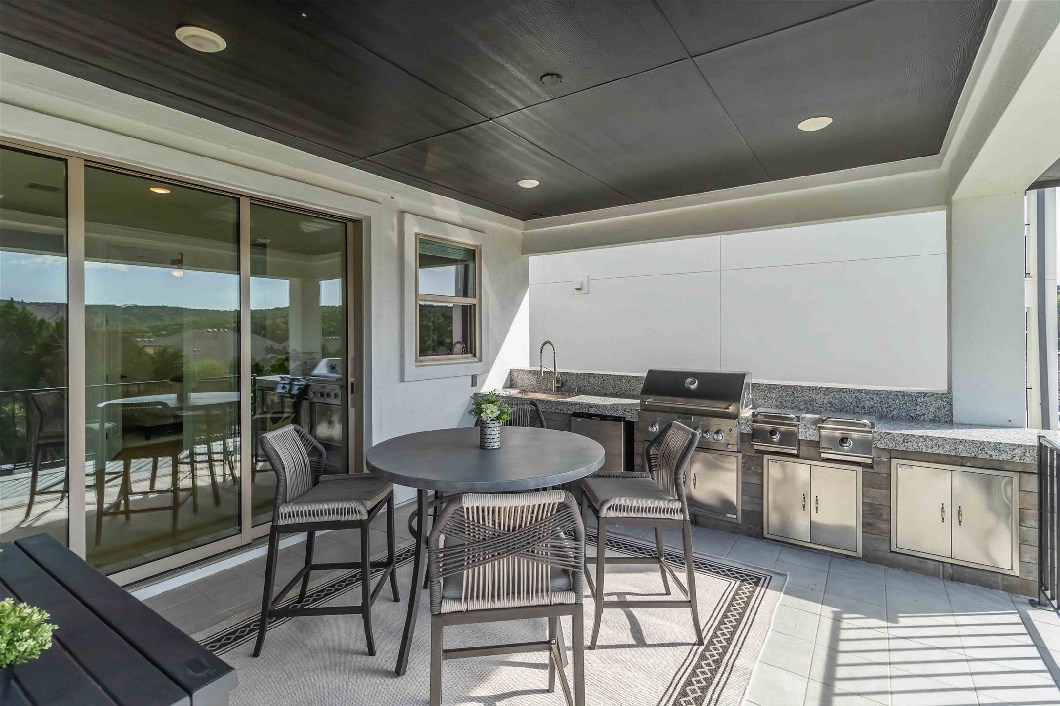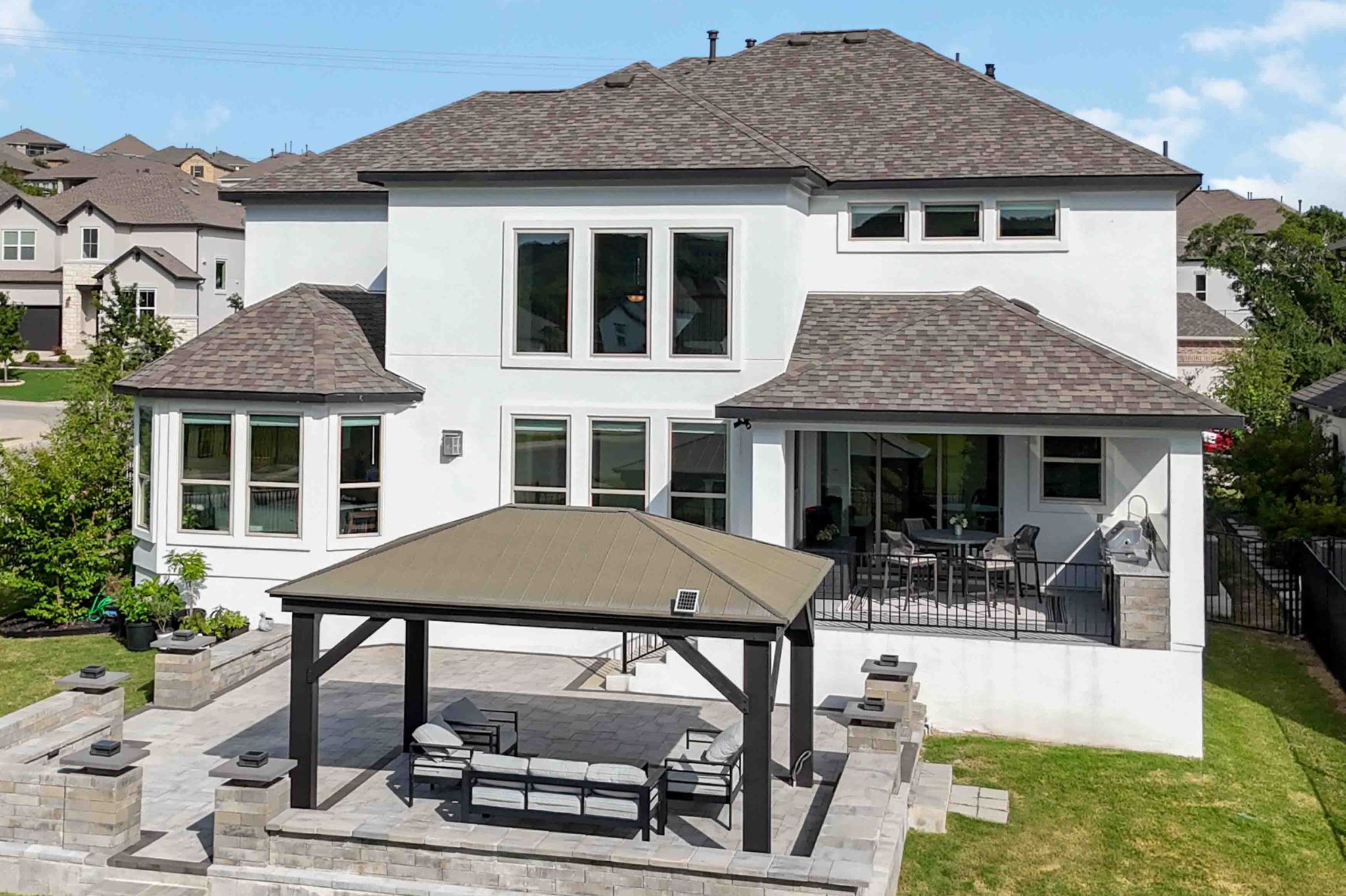 *OPEN HOUSE SUN 1-4PM* Step into elegance in this stunning Taylor Morrison Sapphire model located in the highly sought-after Travisso community, known for its resort-style amenities, scenic Hill Country views, and vibrant lifestyle. This corner-lot luxury home features an east-facing front and west-facing backyard, allowing abundant natural light from sunrise to sunset. The tall glass front door welcomes you into an elegant foyer leading to a formal dining room with tray ceiling, a private home office, and guest bath. The main living area features soaring ceilings, a custom fireplace, and expansive greenbelt views, flowing seamlessly into a gourmet kitchen with quartz countertops, shaker cabinets with crown molding, center island, MotionSense faucet, walk-in pantry, water softener, and upgraded appliances. The primary suite includes bay windows with greenbelt views, a tray ceiling, and a spa-style bathroom with soaking tub, walk-in shower with bench, and custom walk-in closets. The main level also features a private in-law suite with full bathroom, ideal for guest privacy and multigenerational living. Upstairs offers a spacious game room and media room with home theater setup, along with three additional bedrooms, including a private en-suite and Jack-and-Jill layout. Enjoy indoor-outdoor living with a sliding glass door leading to an extended covered patio, fully equipped outdoor kitchen, and a large gazebo with LED lighting. The landscaped backyard with privacy shrubs and irrigation creates a private retreat perfect for entertaining. Additional highlights include EV charger, mudroom bench, glass-inset garage door, Astoria architectural lighting, matte black designer finishes, and pre-wired security system. Residents enjoy resort-style amenities including pools, sports courts, parks, pond, and scenic trails, with convenient access to Austin, major employers, and top-rated schools.