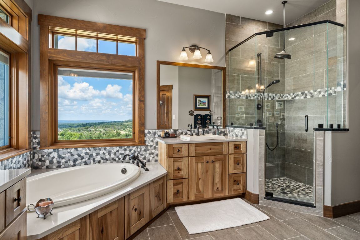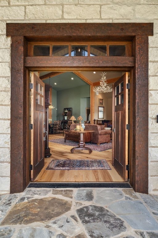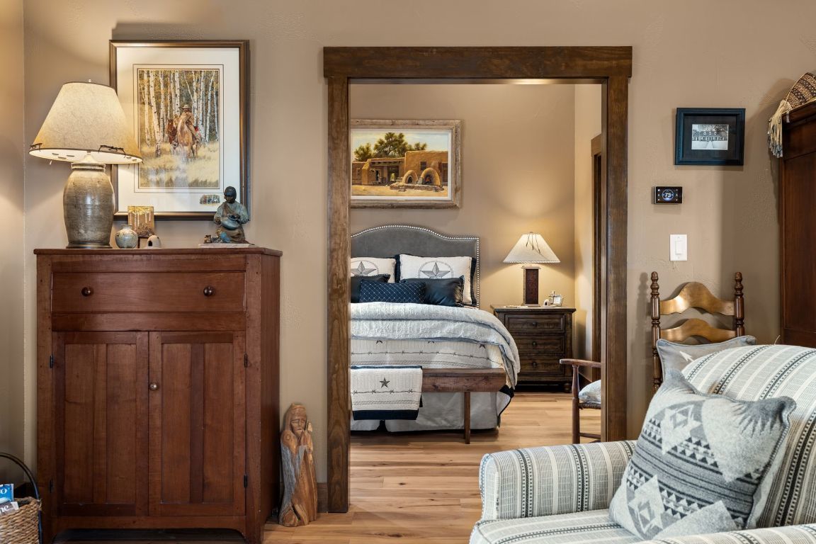 - Bedroom, Great Room, Outside, Primary Bedroom, Raised Hearth, Stone