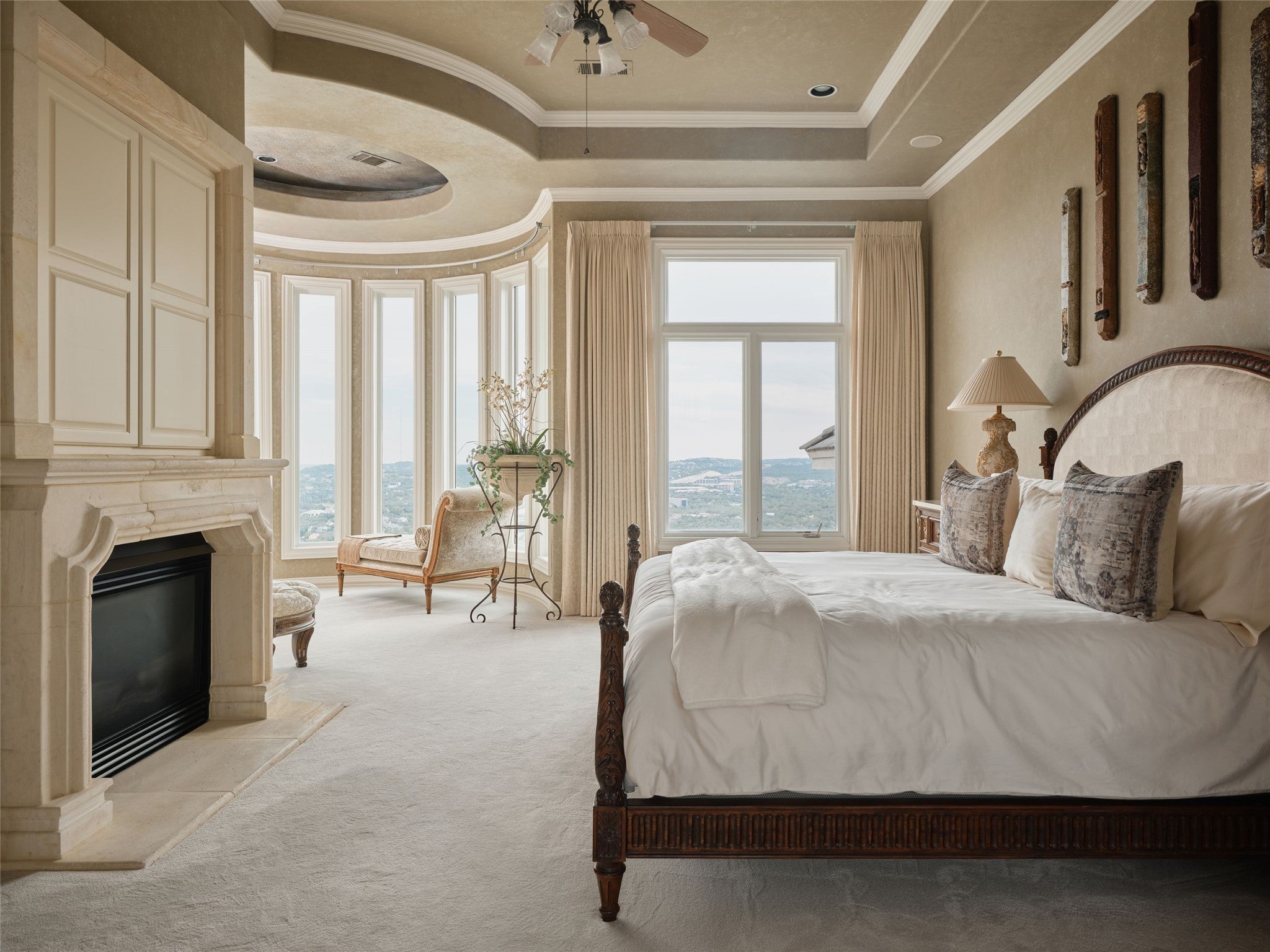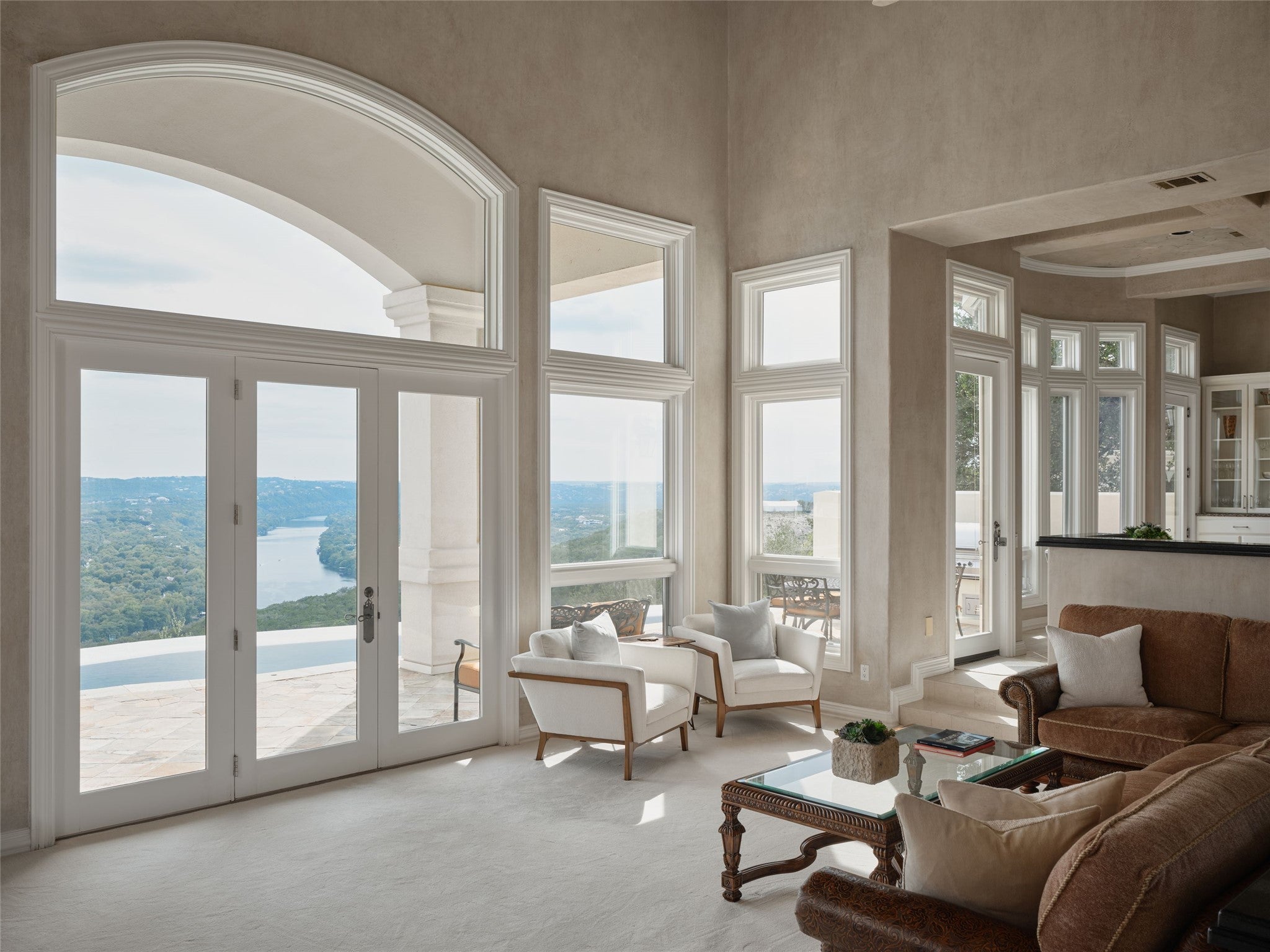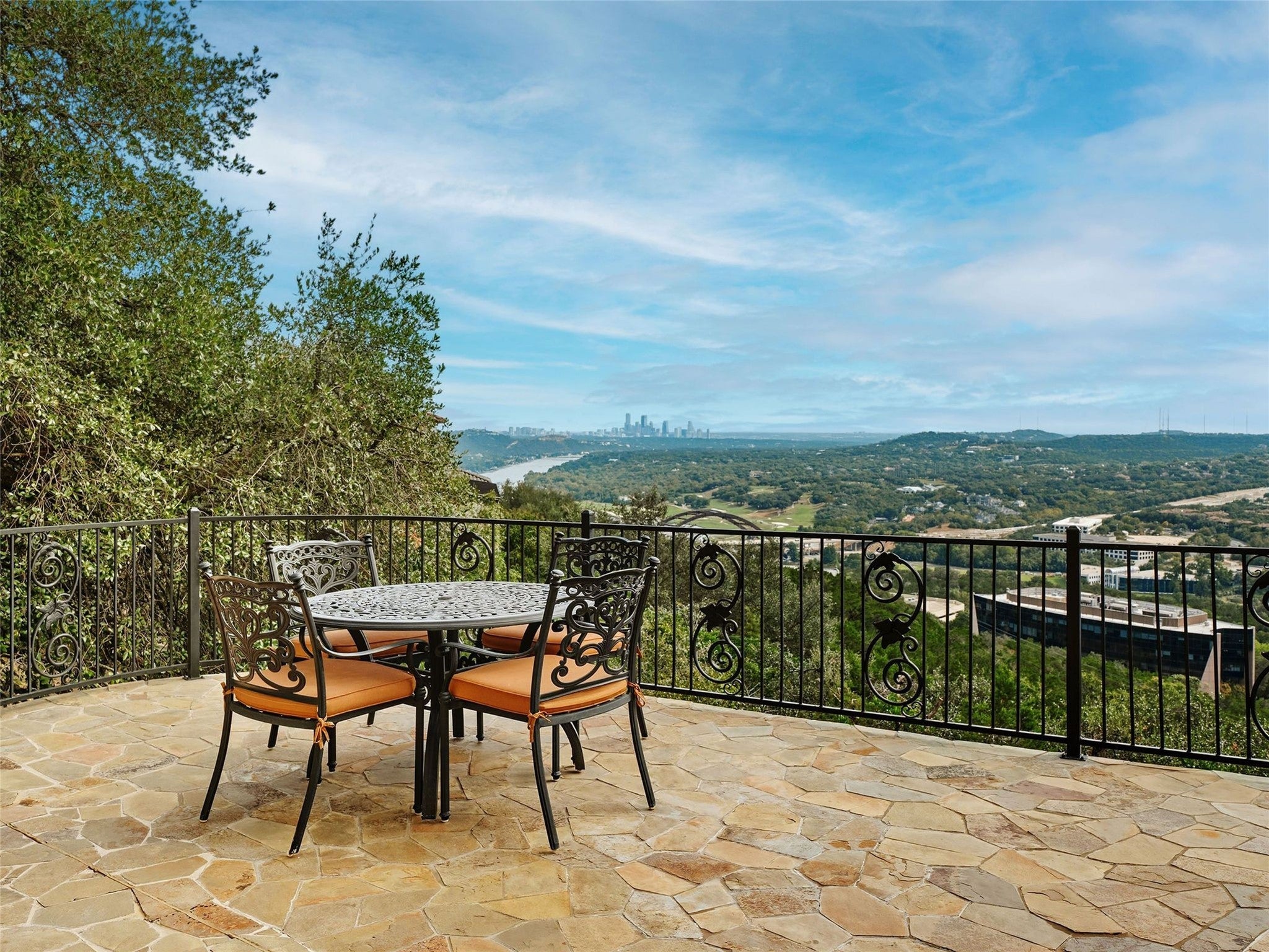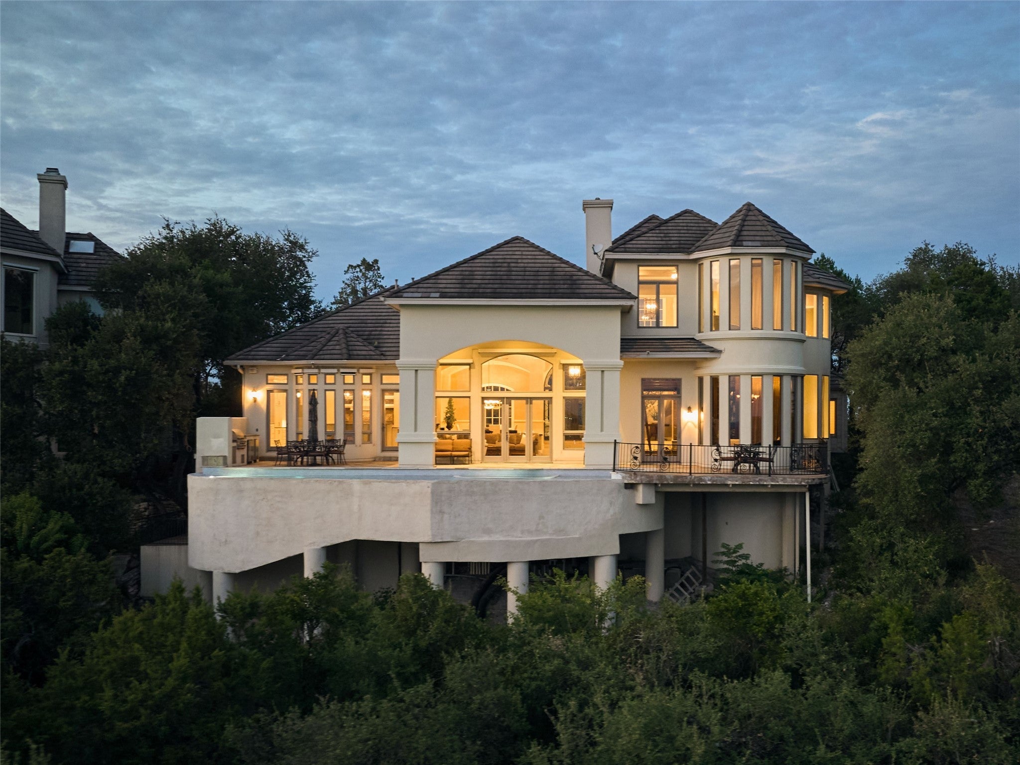 Rising above one of Austin’s most iconic corridors, The Panorama Estate commands a breathtaking and irreplaceable vantage point where Lake Austin, the Pennybacker Bridge, Austin Country Club, the downtown skyline, and miles of Hill Country views come together in a single panorama. This is not simply a home with a view. It is a property defined by elevation, position, and protected sightlines that cannot be replicated. Privately gated on a prized 0.41 acre promontory, the 4,407 square foot residence offers a rare combination of presence and ease. A true lock and leave estate, the home lives expansively while remaining low maintenance. For buyers seeking privacy, security, and effortless ownership, this is a lifestyle opportunity perfectly suited to today’s luxury buyer. Designed to embrace its surroundings, the home features soaring ceilings, architectural arches, and curved walls of glass that frame the horizon from nearly every major living space. The pool and spa terrace appear to float above Lake Austin below, creating a resort caliber setting ideal for entertaining, relaxing, or enjoying one of the finest backdrops in the city. The nearly 1,000 square foot primary suite serves as a private sanctuary with fireplace, dual closets, and panoramic views. Three additional ensuite bedrooms, a richly appointed study, and multiple living and dining areas provide flexibility for guests and work from home living without unnecessary upkeep. Offered move in ready, The Panorama also holds thoughtful future potential for the next owner to personalize over time while preserving the integrity of this exceptional setting. Iconic Austin views are finite. Opportunities at this level are even rarer. The Panorama represents one of the most compelling view properties available in the city. Located within Austin ISD and minutes from downtown, Loop 360, and Lake Austin, this is Austin living elevated.