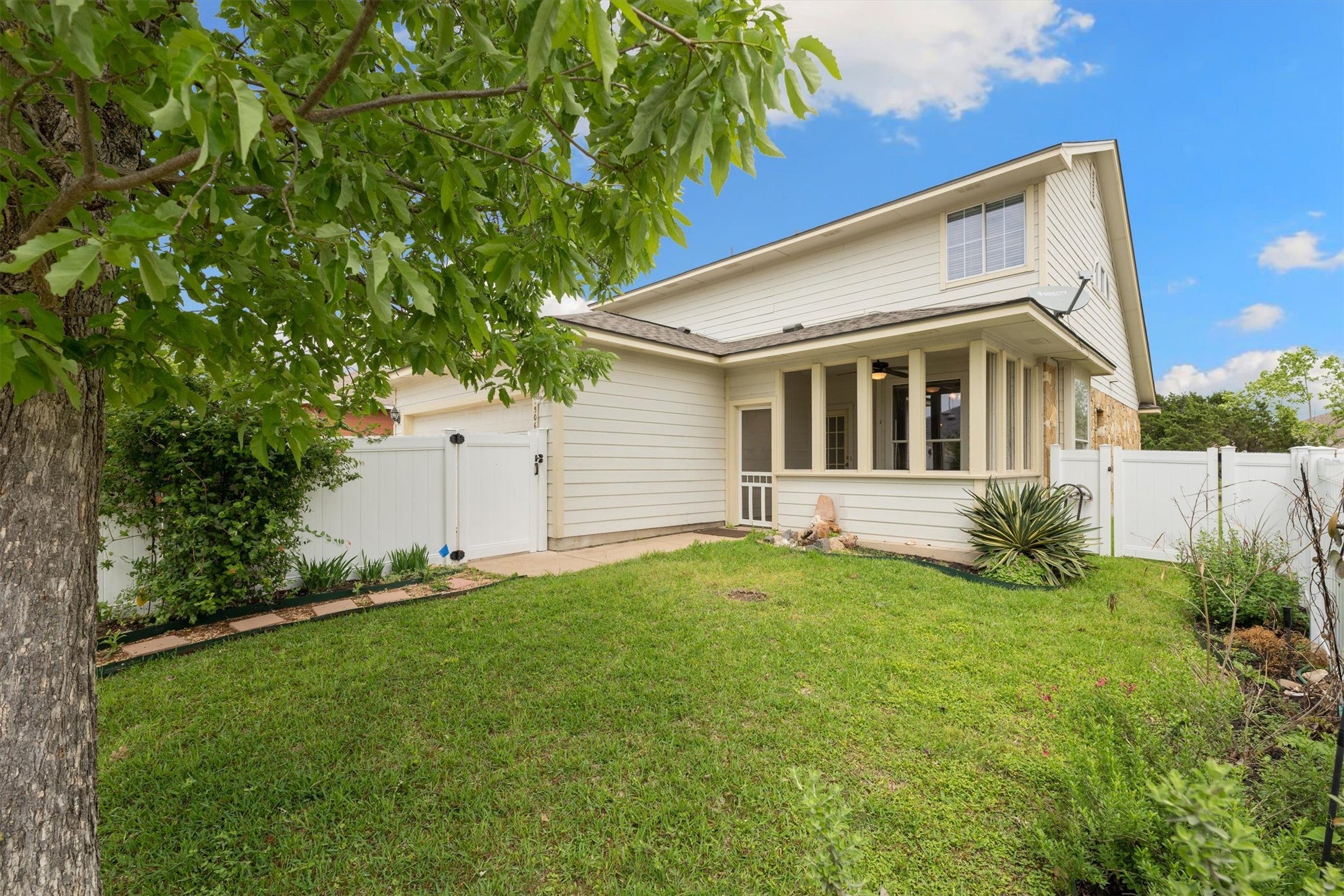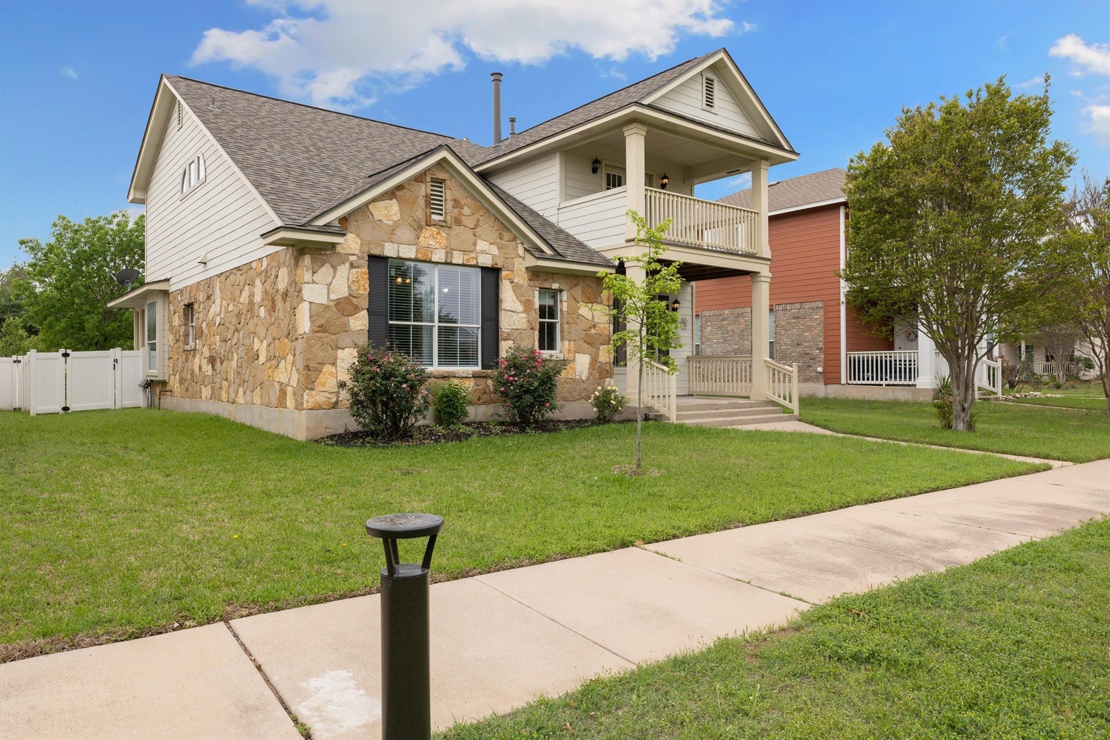 Prime Cedar Park location! Walking distance to Cedar Park Town Center with a multitude of shopping, dining and entertainment. Easy access to 183A! Home is situated right behind the park, with a front porch and balcony overlooking the beautiful landscape and mature trees. The back yard is a seasonal tropical paradise with a tastefully landscaped above ground pool, and banana trees providing shade and privacy. Lush green grass, crushed granite, and a seating or firepit area make the most of this low maintenance back yard. Inside the home, you find an inviting family room with vaulted ceilings and a cozy fireplace. Flow into the kitchen, which includes granite countertops, stainless steel appliances, and an eat-in dining space. The primary bedroom is located on the main floor, with a walk-in closet and separate tub and shower in the bath. Upstairs is a loft space and three additional bedrooms, one has access to the balcony overlooking the park. Two car garage! LOW TAX RATE! Seller/landlord has loved and cared for this home, adding multiple upgrades, landscape and garden.