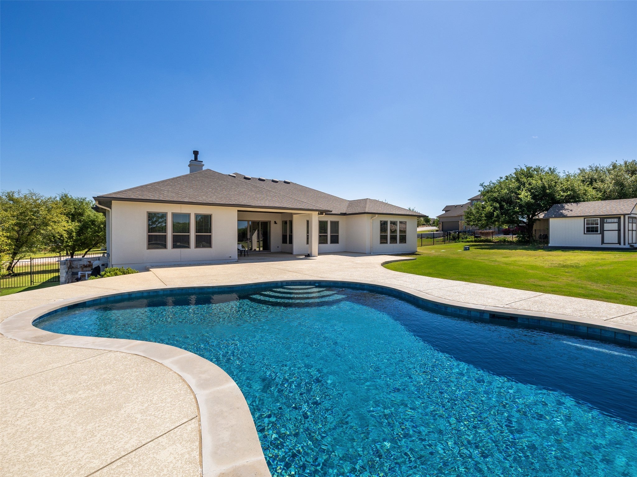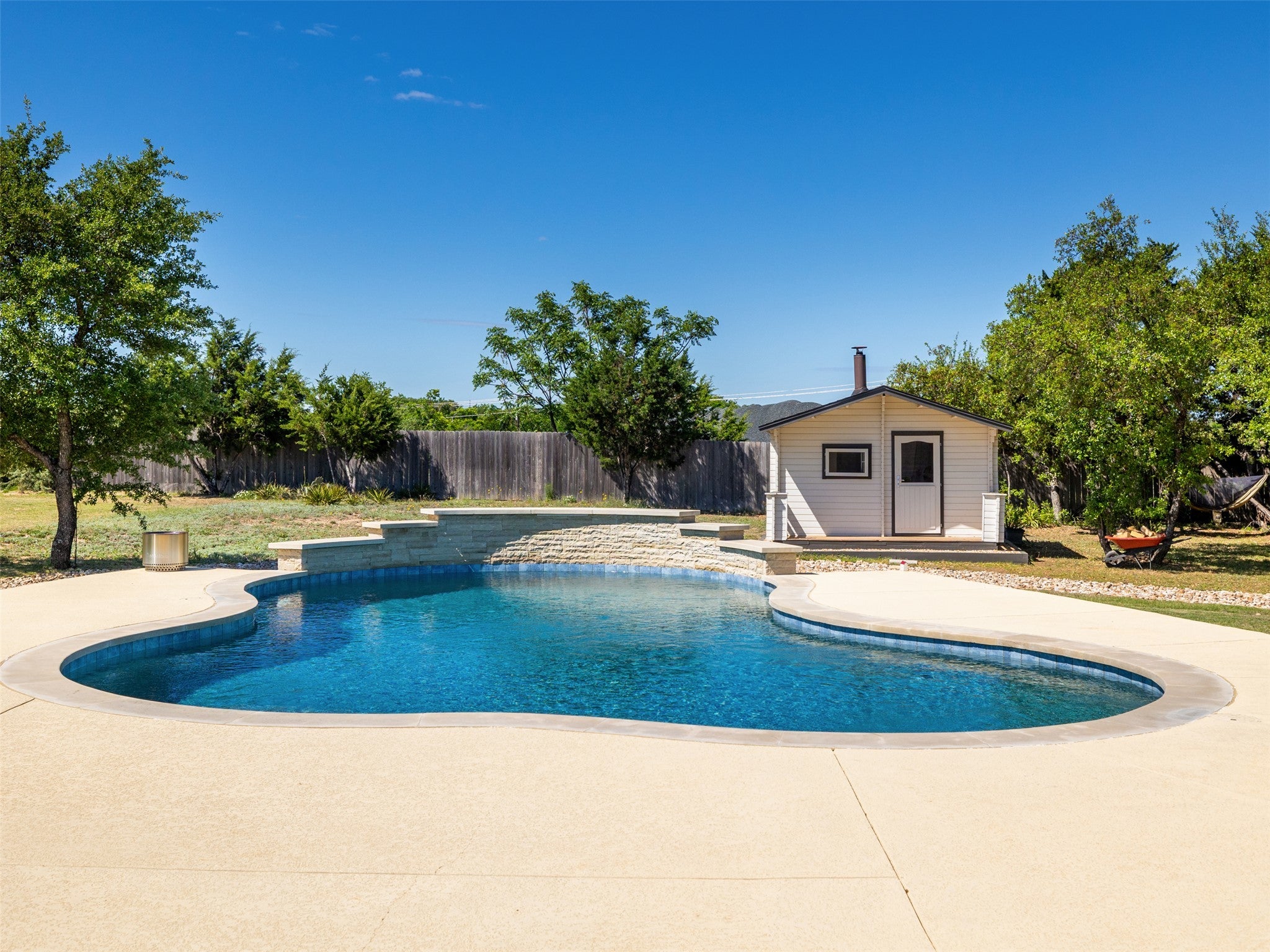 Beautiful, modern custom built Drees 1 story home in Liberty Hill with a refreshing pool and relaxing backyard sauna. Features include 3 spacious bedrooms, 3 full baths with upgrades, a dedicated office and an XL secondary living space. Gourmet kitchen with open concept living and dining. Open and bright primary bedroom and bathroom with spa-like soaking tub, double vanities, large walk-in shower and expansive primary closet. SPECIAL FINANCING INCENTIVES available on this property from SIRVA Mortgage. Information is deemed reliable, and not guaranteed. Buyer to confirm Lot Size, Sq Footage and schools.