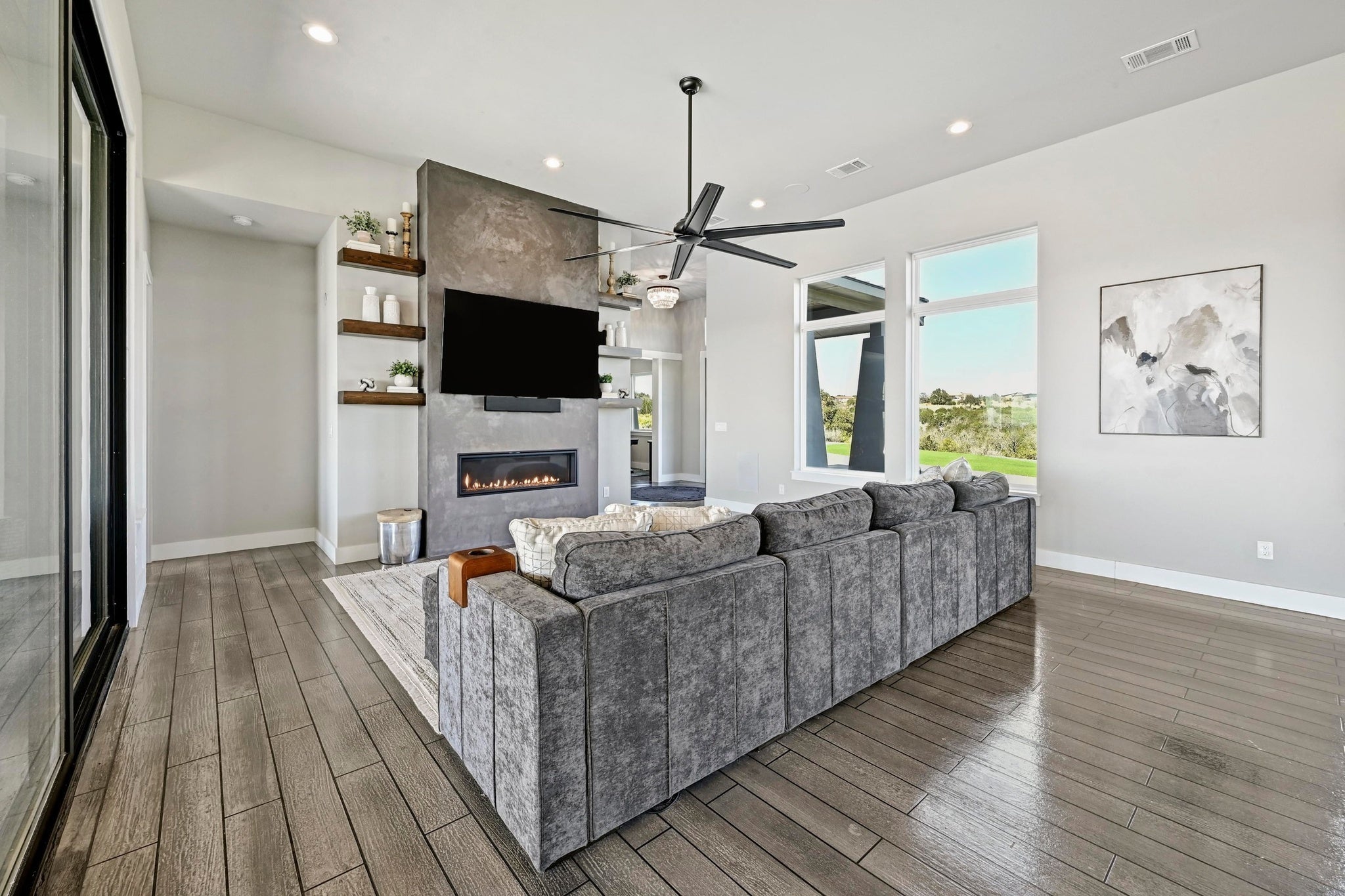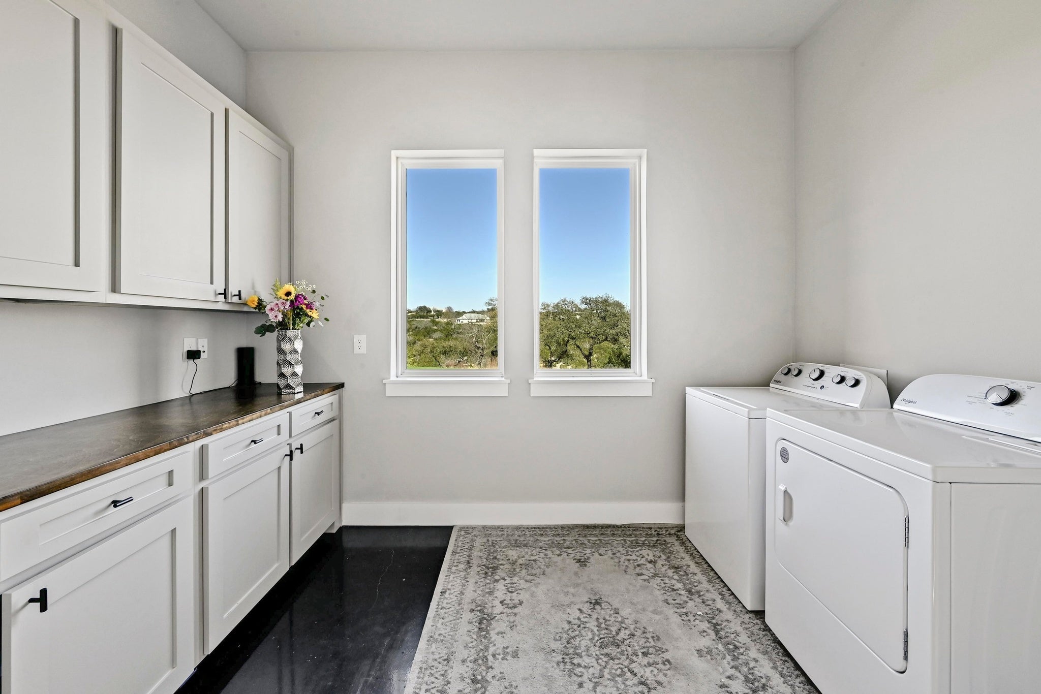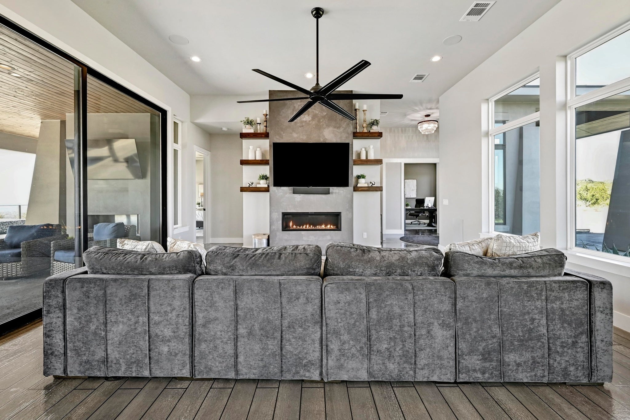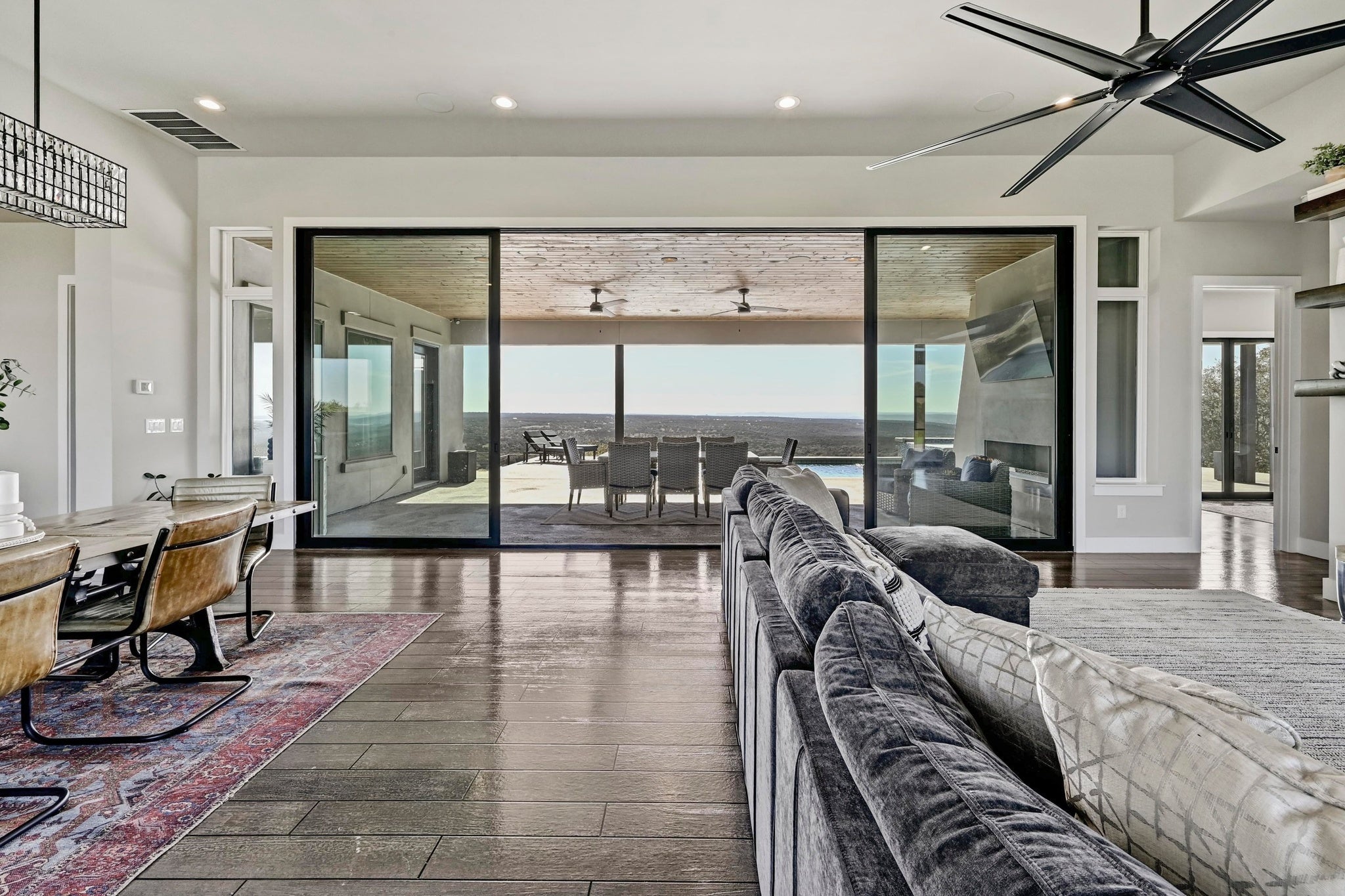 Perched within a gated Hill Country community, this extraordinary estate captures sweeping views of two lakes and breathtaking sunsets that paint the sky each evening. Thoughtfully designed for both refined entertaining and everyday comfort, this 4-bedroom, 4.5-bath residence delivers elevated living at every turn. Inside, soaring ceilings and expansive windows frame the panoramic views, filling the home with natural light. The open-concept layout centers around a striking living room fireplace, complemented by integrated surround sound for an immersive experience whether hosting guests or enjoying a quiet night in. The primary suite offers a private retreat, complete with its own fireplace and tranquil views that create a true sanctuary. Secondary bedrooms are generously sized with en-suite baths, providing comfort and privacy for family and guests. A dedicated game room adds flexible living space — ideal for movie nights, billiards, or a secondary lounge — giving the home multiple areas to gather and unwind. Step outside and experience resort-style living. The infinity-edge pool and spa appear to spill seamlessly into the lake views beyond, while the covered patio with a third fireplace creates a year-round outdoor living space designed for sunset evenings and effortless entertaining. A private putting green enhances the estate’s recreational appeal, and architectural soffit lighting beautifully highlights the home’s exterior after dark. The professionally installed turf front yard delivers pristine curb appeal with low-maintenance ease, keeping the landscape lush and green year-round. Located just minutes from area wineries and a nearby golf course, this property offers the perfect balance of peaceful seclusion and lifestyle convenience — all within a secure gated community. Schedule a showing today!