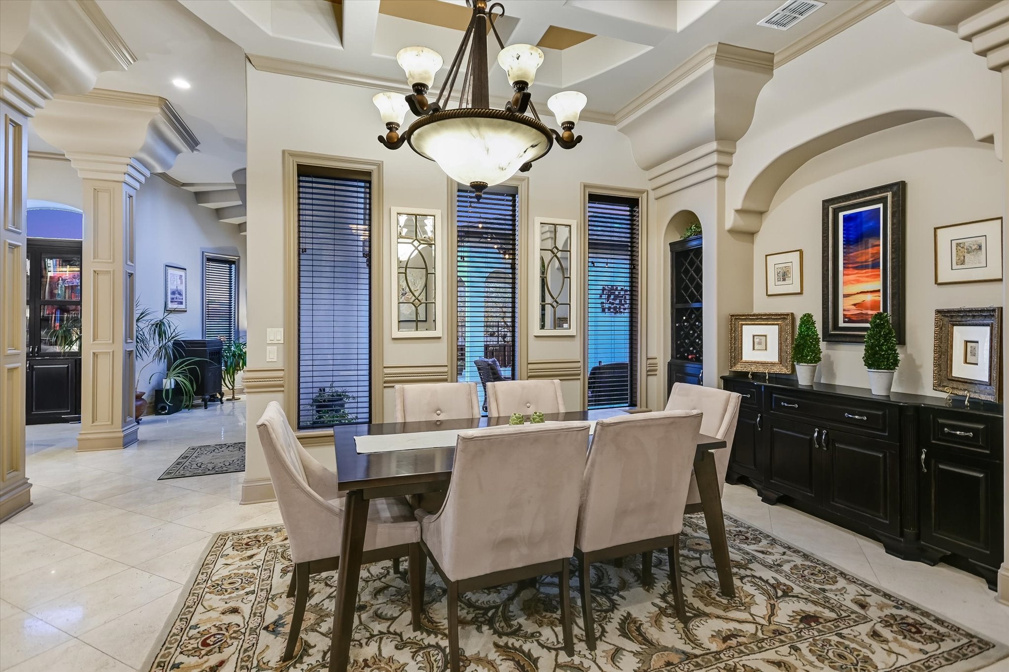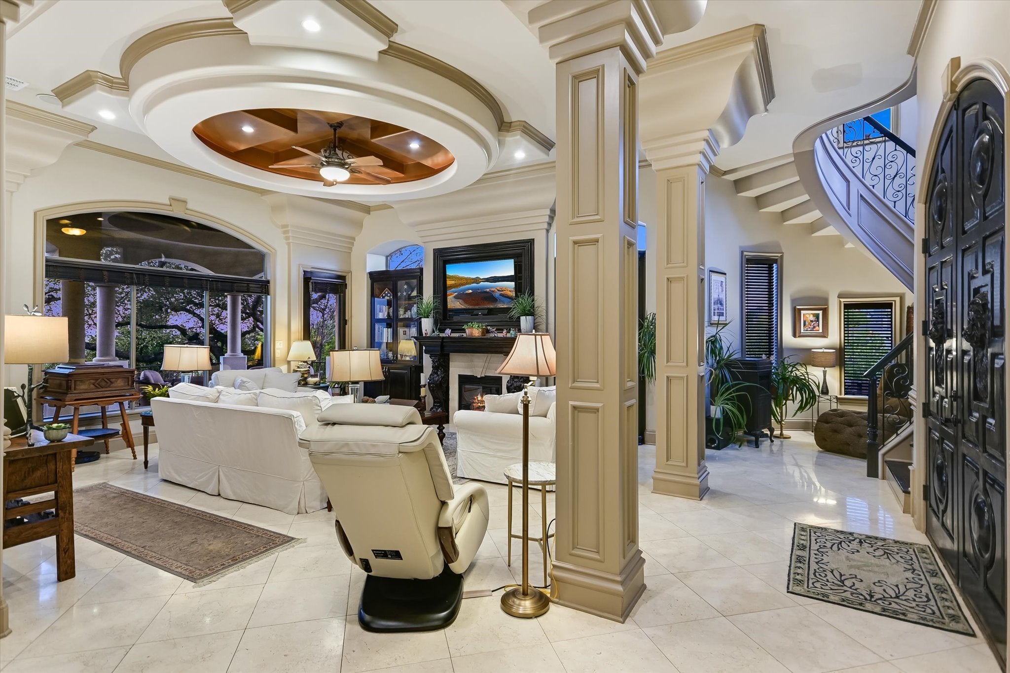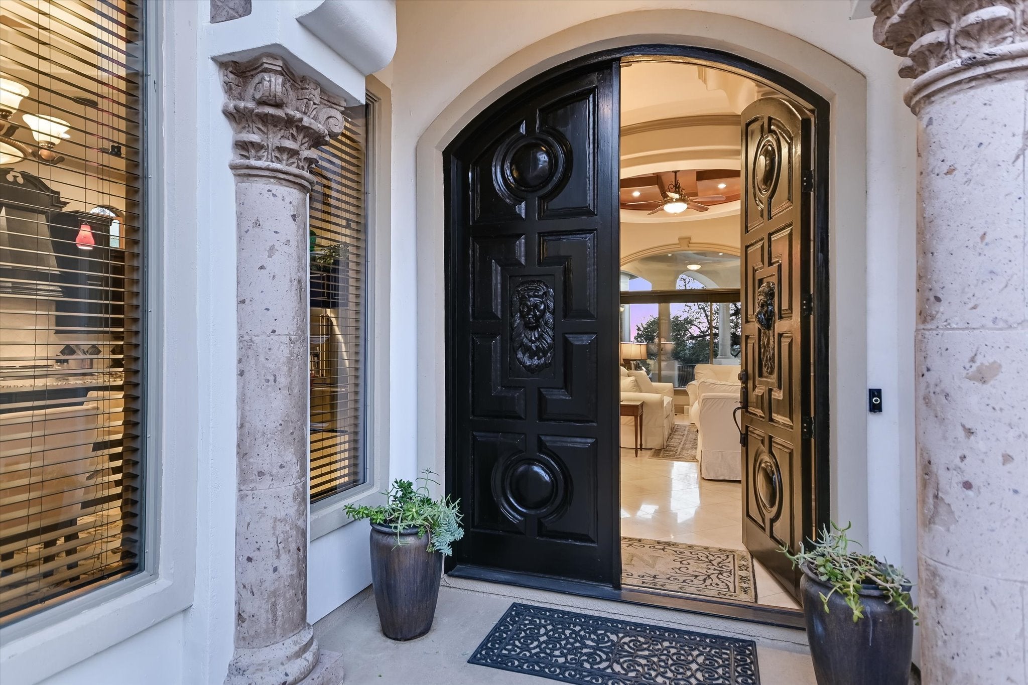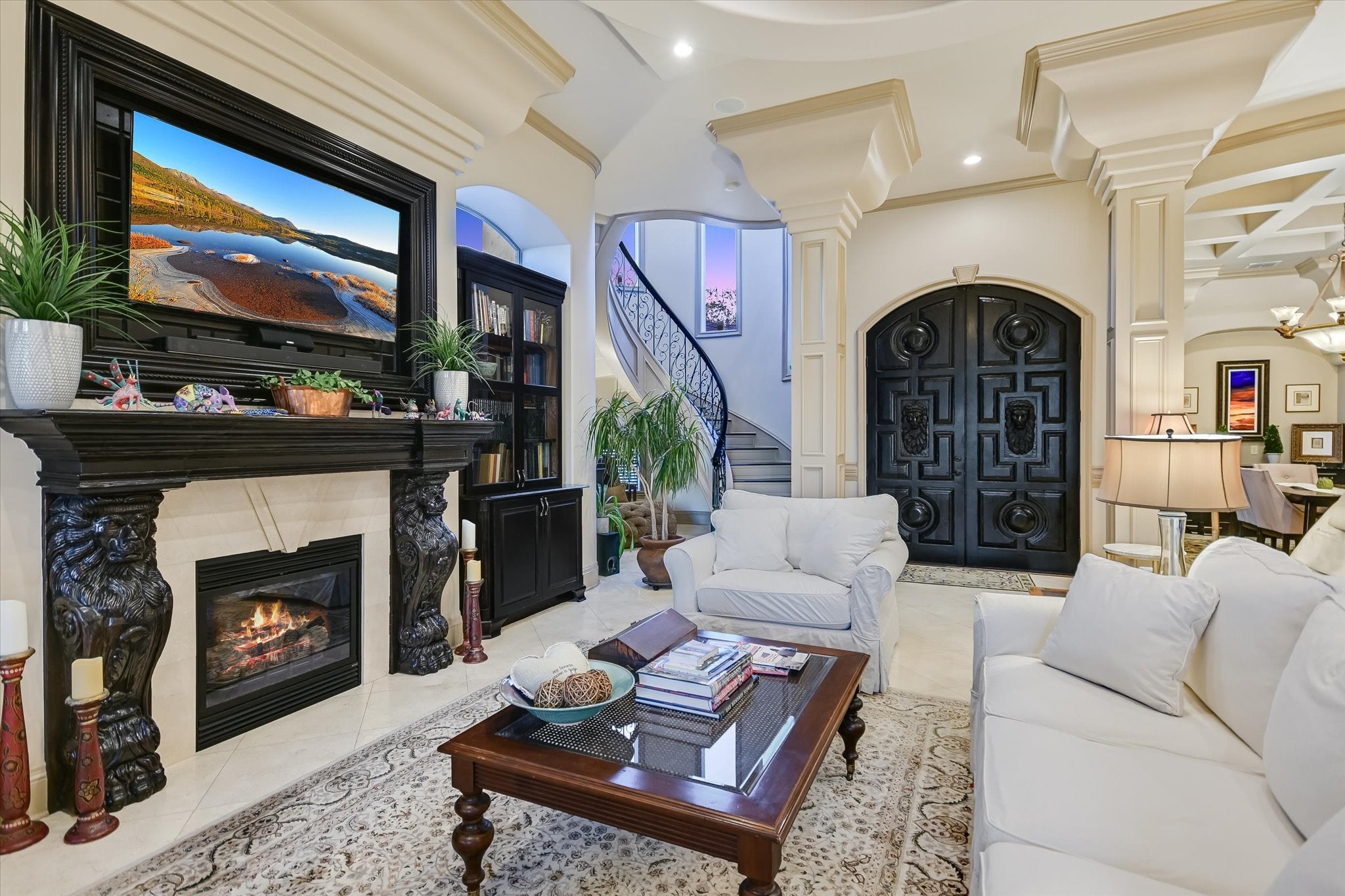 Rich in architectural character, this exceptional residence unfolds through a series of dramatic yet inviting spaces, where old-world detailing and beautifully connected indoor-outdoor living create a home of lasting presence. Domes, arches, niches, and custom ceiling treatments lend depth and artistry throughout, while a striking central courtyard finished with stained and polished concrete, sconce lighting, and twin fountains, forms the heart of the home and a memorable setting for entertaining. Craftsmanship defines the interiors, from furniture-grade alder cabinetry with carved detailing and extensive custom millwork to fully cased windows and tall alder doors. A sculptural circular staircase with hardwood treads and wrought-iron railing rises beneath a domed ceiling, adding architectural drama at the center of the home. More than 2,000 square feet of imported Jerusalem stone flooring brings warmth and texture throughout the main living spaces, complemented by hardwood floors in the study and game room. The gourmet kitchen is designed for both everyday living and entertaining, featuring a commercial six-burner range, twin dishwashers, built-in refrigerator, two walk-in pantries, and extensive custom cabinetry. A private guest suite connects to the home by an elegant breezeway and offers its own bath, covered patio, and dedicated A/C system, providing comfort and privacy for visitors. The primary suite is designed as a quiet retreat, featuring a domed ceiling, sitting area, dual vanities, Jacuzzi tub, frameless shower, and boutique-style closet with built-ins. Outside, beautifully landscaped grounds are layered with decorative limestone terracing, generous lawn areas, and space for poolside recreation and play. Additional highlights include a large motor court, two-car garage with built-in storage, advanced multi-zone HVAC systems, energy-efficient windows, upgraded insulation, and whole-home wiring for audio, video, and security.