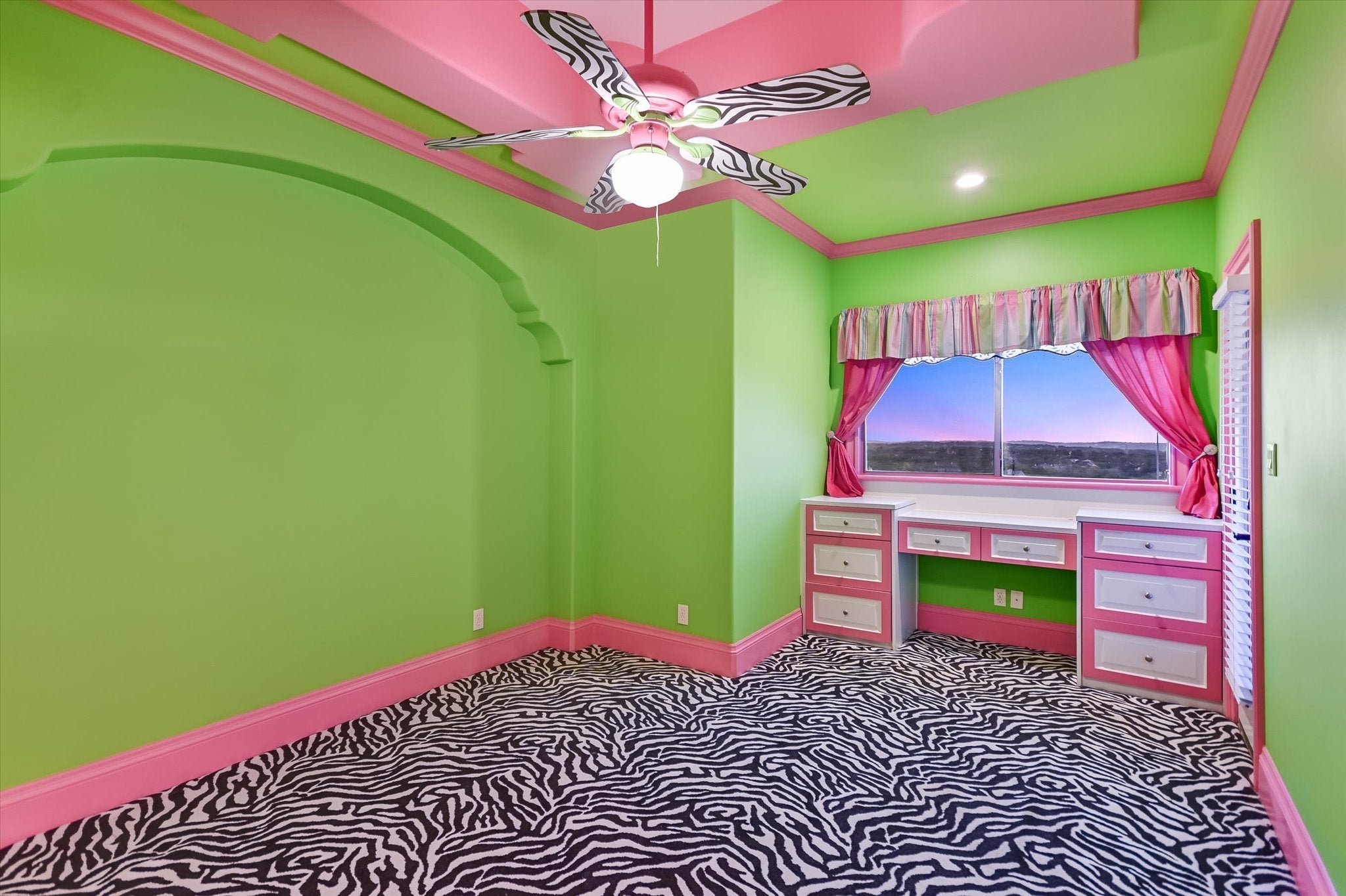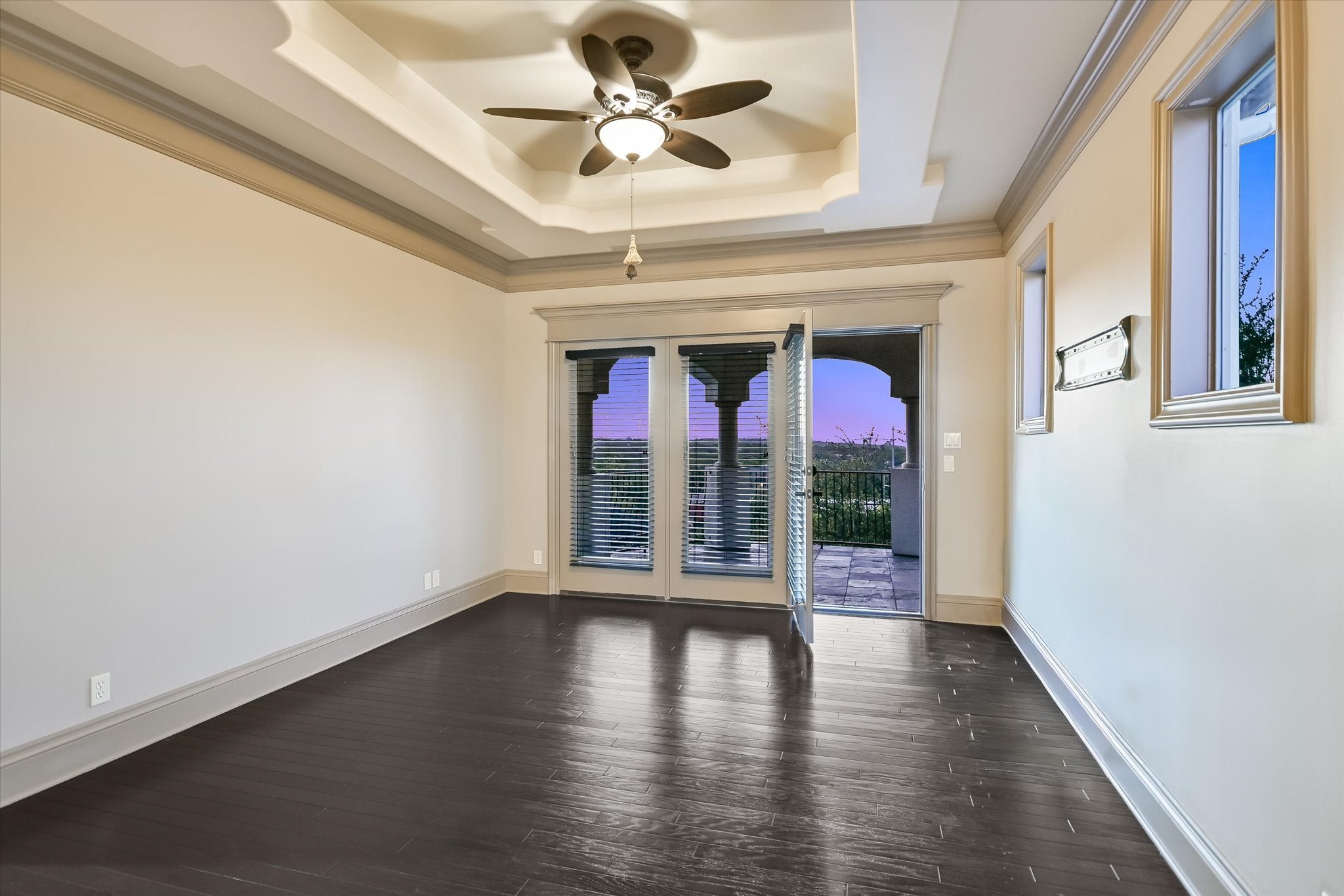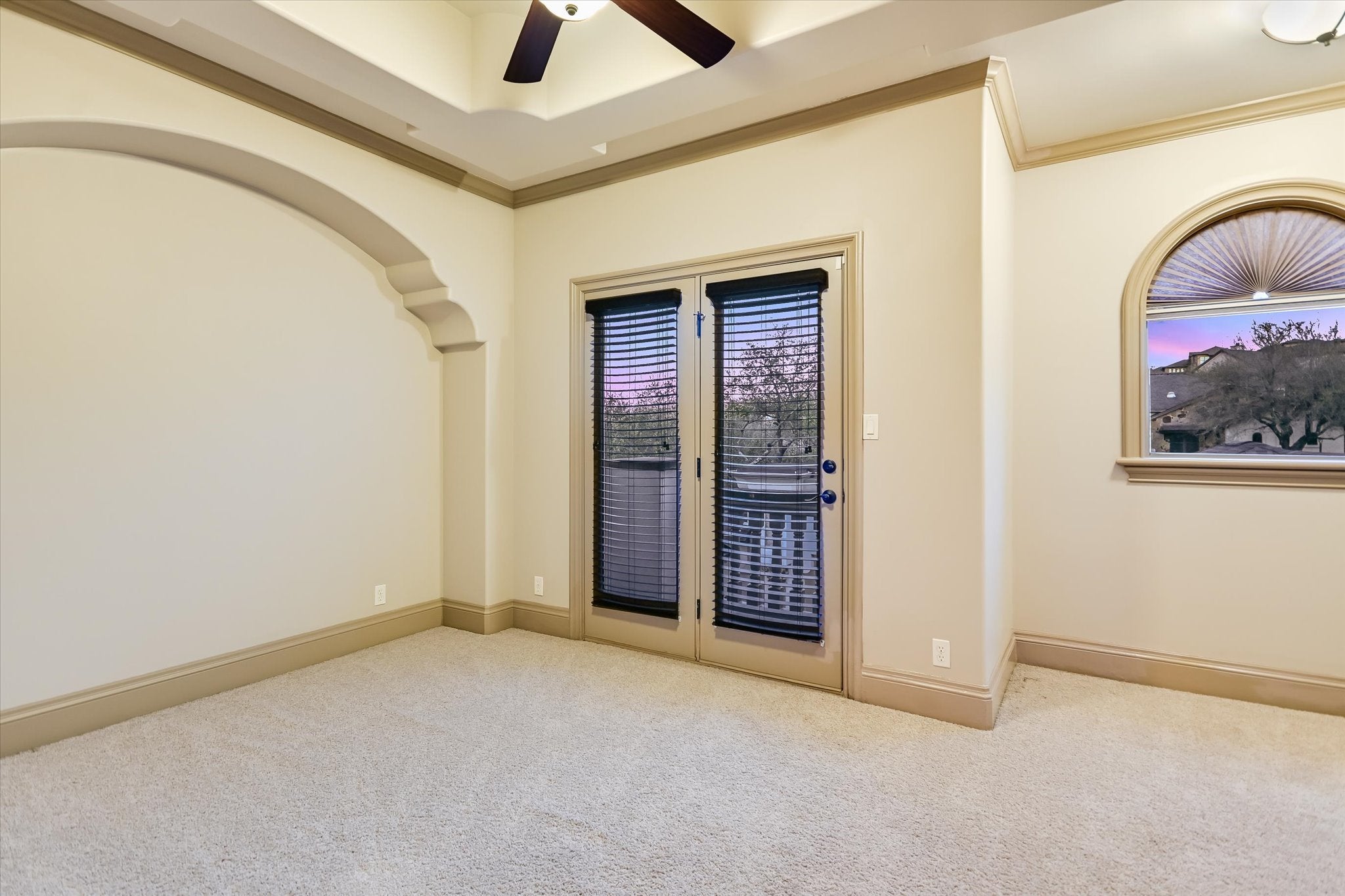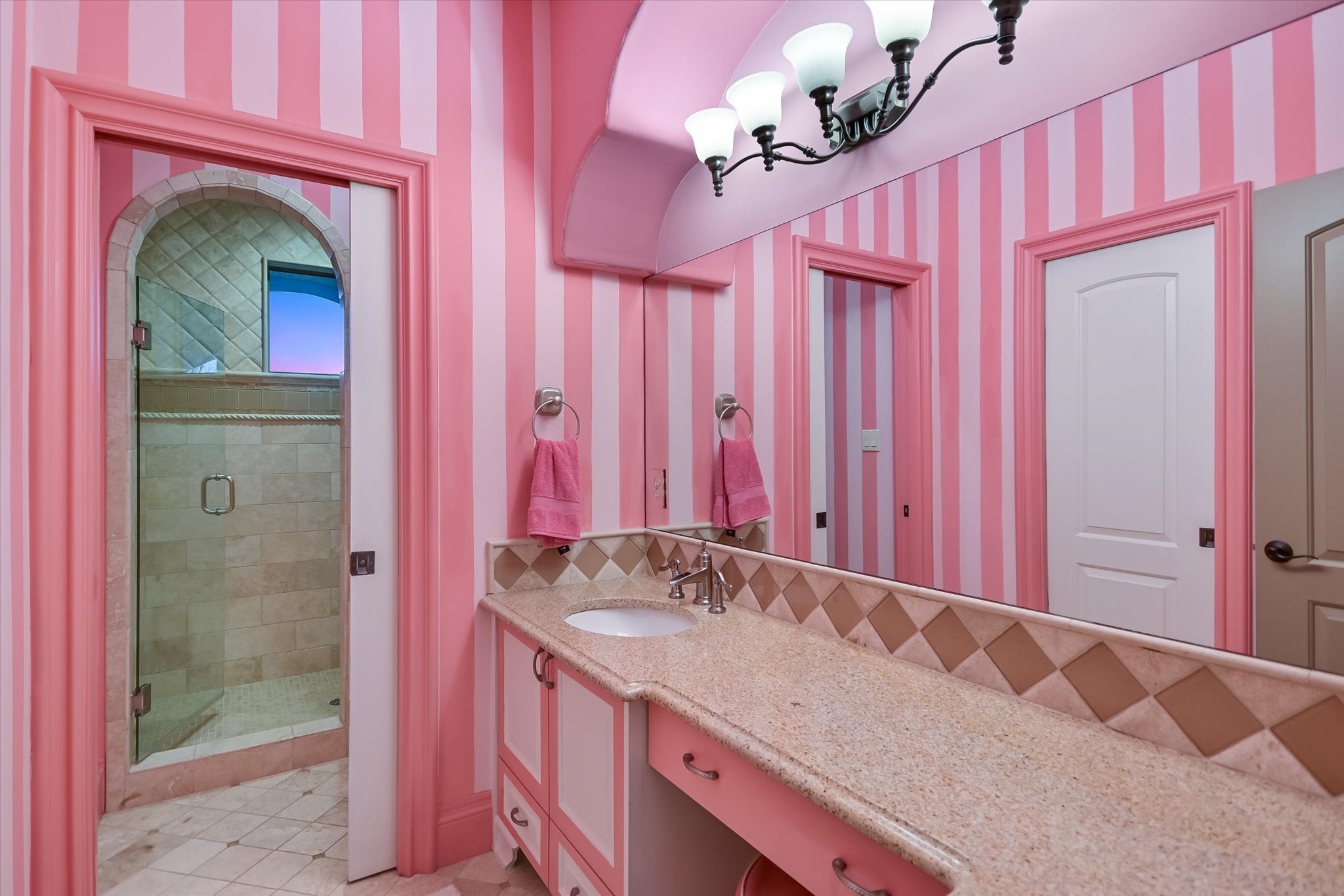 Rich in architectural character, this exceptional residence unfolds through a series of dramatic yet inviting spaces, where old-world detailing and beautifully connected indoor-outdoor living create a home of lasting presence. Domes, arches, niches, and custom ceiling treatments lend depth and artistry throughout, while a striking central courtyard finished with stained and polished concrete, sconce lighting, and twin fountains, forms the heart of the home and a memorable setting for entertaining. Craftsmanship defines the interiors, from furniture-grade alder cabinetry with carved detailing and extensive custom millwork to fully cased windows and tall alder doors. A sculptural circular staircase with hardwood treads and wrought-iron railing rises beneath a domed ceiling, adding architectural drama at the center of the home. More than 2,000 square feet of imported Jerusalem stone flooring brings warmth and texture throughout the main living spaces, complemented by hardwood floors in the study and game room. The gourmet kitchen is designed for both everyday living and entertaining, featuring a commercial six-burner range, twin dishwashers, built-in refrigerator, two walk-in pantries, and extensive custom cabinetry. A private guest suite connects to the home by an elegant breezeway and offers its own bath, covered patio, and dedicated A/C system, providing comfort and privacy for visitors. The primary suite is designed as a quiet retreat, featuring a domed ceiling, sitting area, dual vanities, Jacuzzi tub, frameless shower, and boutique-style closet with built-ins. Outside, beautifully landscaped grounds are layered with decorative limestone terracing, generous lawn areas, and space for poolside recreation and play. Additional highlights include a large motor court, two-car garage with built-in storage, advanced multi-zone HVAC systems, energy-efficient windows, upgraded insulation, and whole-home wiring for audio, video, and security.